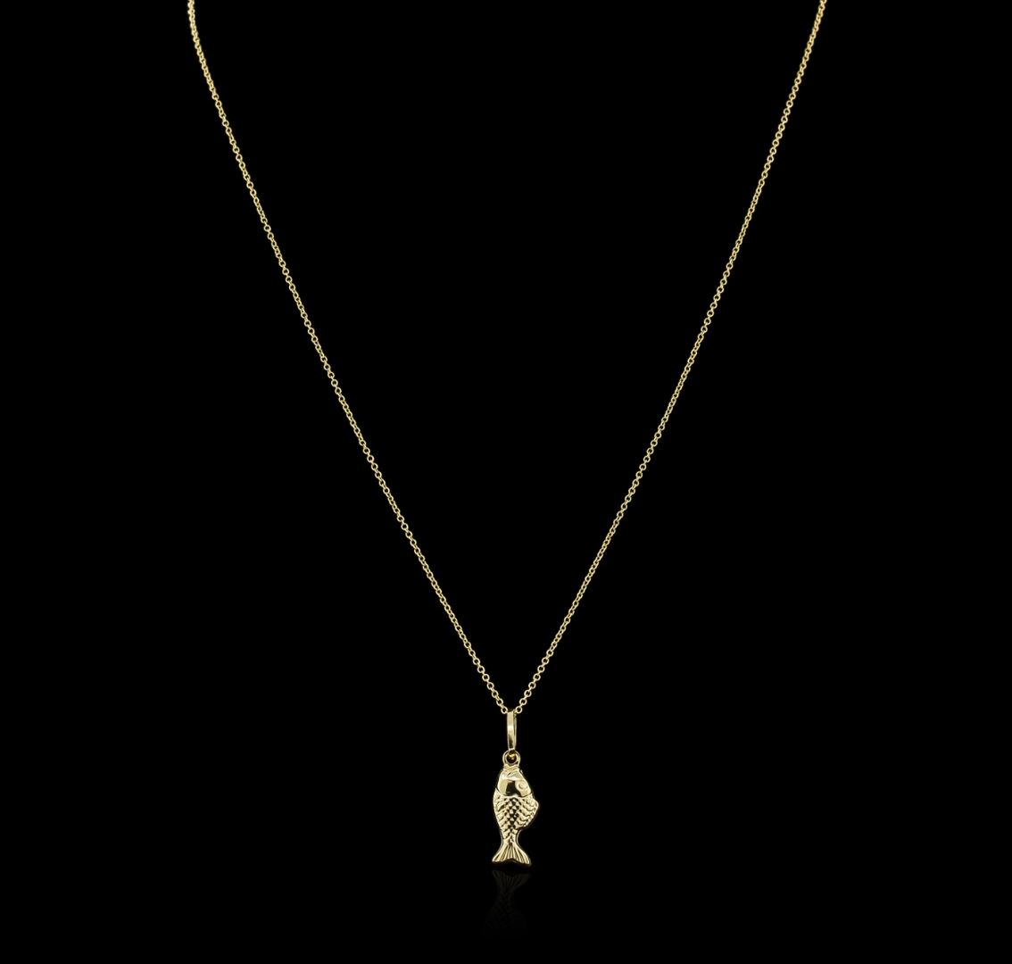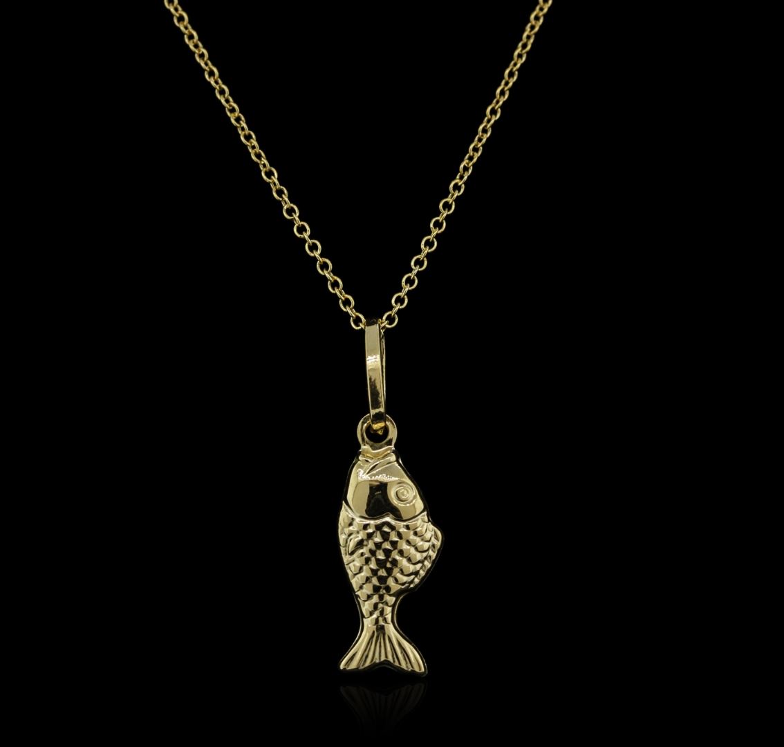 One fish design pendant with chain featuring: 18KT yellow gold weighing 1.81 grams.
