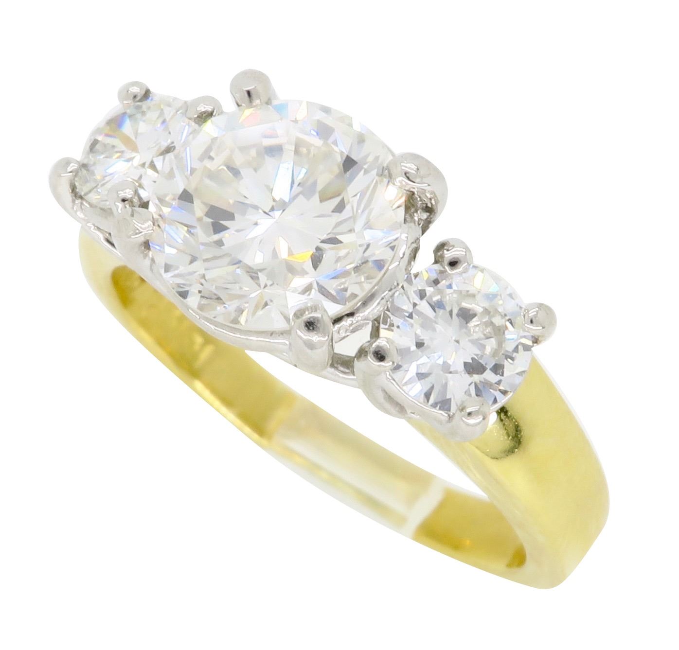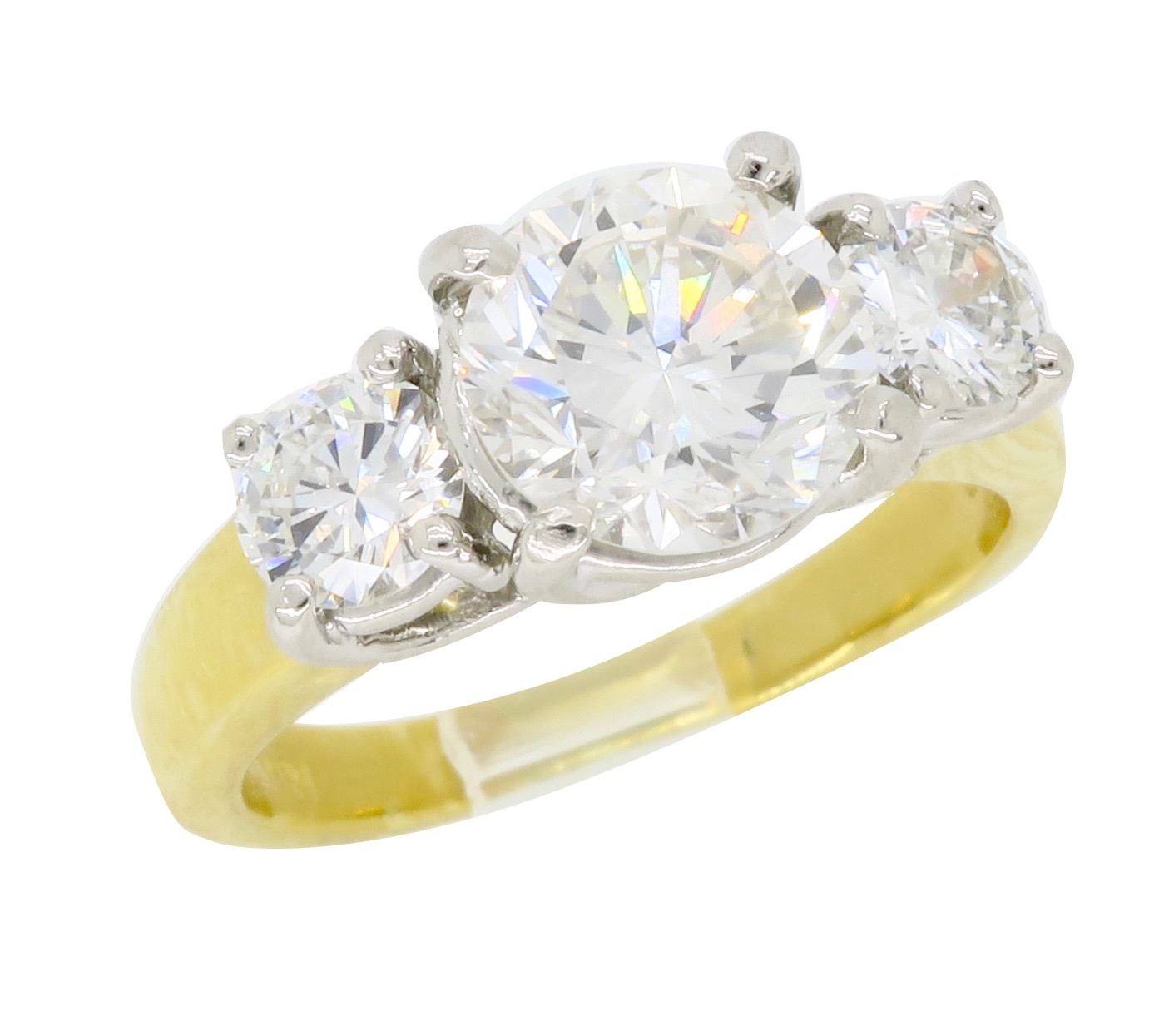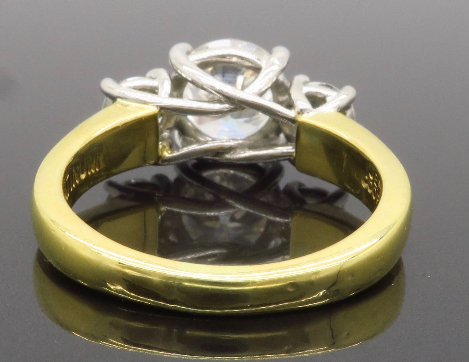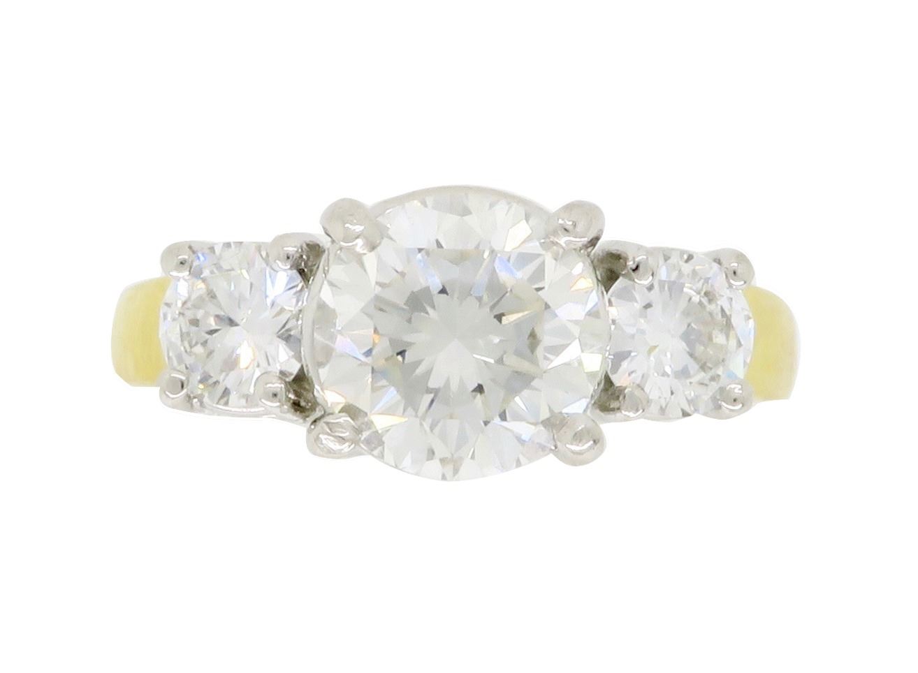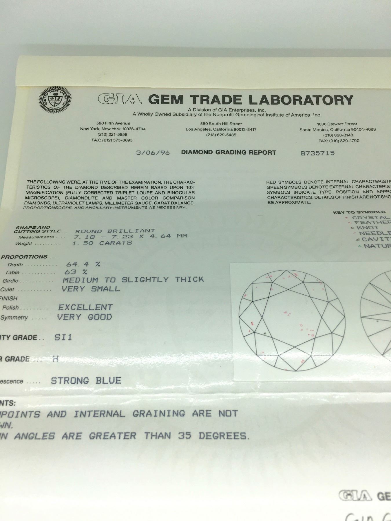 One 18KT Yellow Gold GIA 2.11ctw Diamond Ring. (1) Round center Diamond with a total weight of 1.50cts with a color of H and clarity of SI-1. (2) Round side Diamonds with a total weight of 0.61cts. Total weight of this ring is 6.1 grams. Ring size is 5.5.