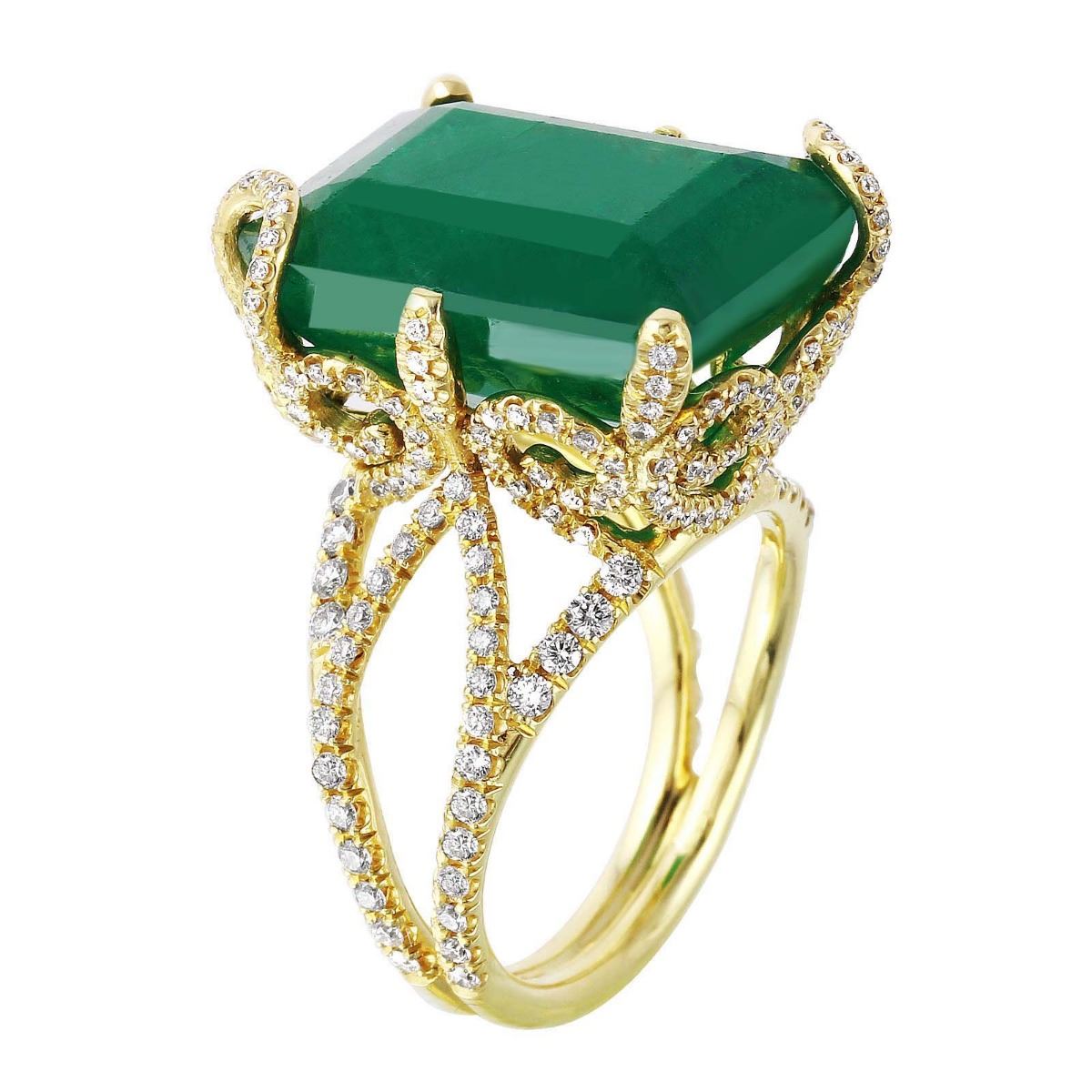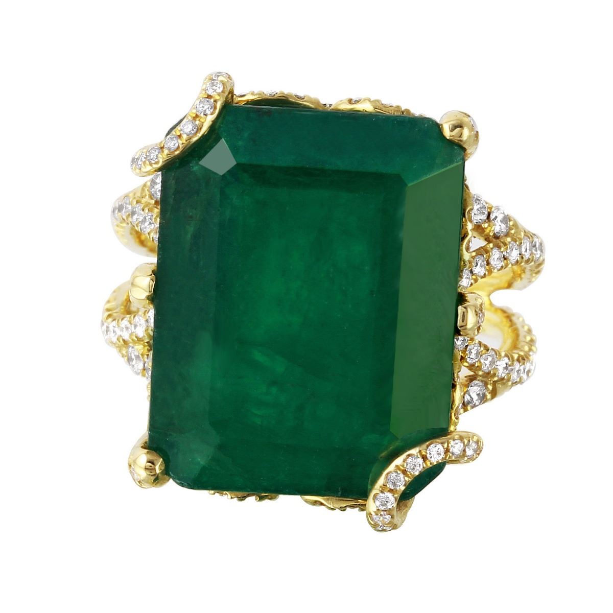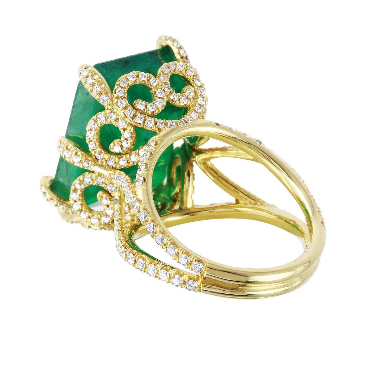 One stamped & tested 18KT yellow gold ladies custom hand made emerald and diamond ring with a bright polish finish. Size 6. Identified with markings of "18K". Condition is new. Containing: One prong set emerald standard step cut natural emerald, measuring 17.20 x 13.50 x 8.50mm, approximate weight of 16.51ct., clarity is heavily included, type III, medium, moderately strong, green color, cut is very good. Two Hundred Thirty-Two prong set round brilliant cut diamonds, measuring 1.40 - 1.20 x 0.78mm (depth est.) approximate total weight of 232 Stones = 1.35ct. Clarity: VS-2 to SI-1. Color: G - H, Cut is Very Good. Approximate Total Weight of Colored Stones 16.51ct. Approximate Total Weight of Diamonds 1.35ct. Total Weight of Ring 10.50gm. The descriptions listed should not be construed as an appraisal. The detail is provided as a guideline for color, clarity, weights and measurements to the best of our ability. We welcome inspections. WE SHIP WORLDWIDE!