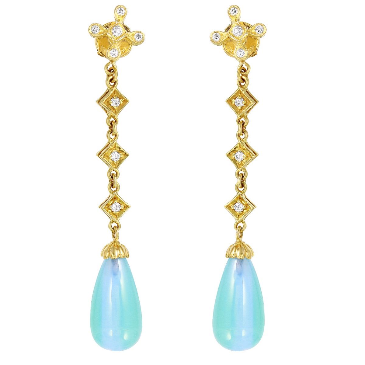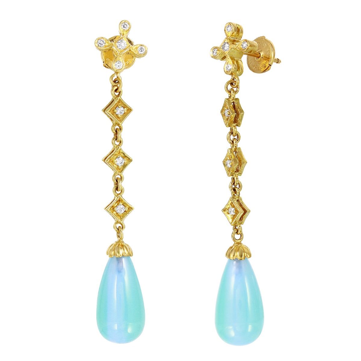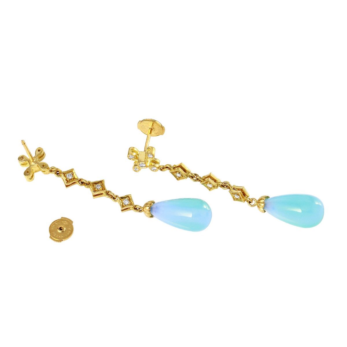 One pair stamped & tested 18KT yellow gold ladies combination cast & assembled iolite and diamond earrings with friction posts with a bright polish finish. 1.85 inches in length. Trademark is MECAN. Identified with markings of "18K". Condition is new. Containing: Two backsetting set briolette cut natural iolites, measuring 16.00 x 7.00 x 4.55mm, approximate total weight of 5.86ct., clarity is heavily included, type II, medium light, moderately strong, bluish violet color, cut is excellent. Fourteen prong set round brilliant cut diamonds, measuring 1.50 - 1.50 x 0.90mm (depth est.) approximate total weight of 14 Stones = 0.17ct. Clarity: SI-1. Color: I - J, Cut is Very Good. Approximate Total Weight of Colored Stones 5.86ct. Approximate Total Weight of Diamonds 0.17ct. Total Weight of Earrings 7.29gm. The descriptions listed should not be construed as an appraisal. The detail is provided as a guideline for color, clarity, weights and measurements to the best of our ability. We welcome inspections. WE SHIP WORLDWIDE!