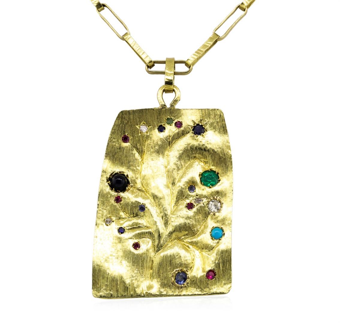One pendant with chain featuring: 18KT yellow gold weighing 39.8 grams containing multi-color synthetic stones. The chain measures approximately thirty-six inches in length.