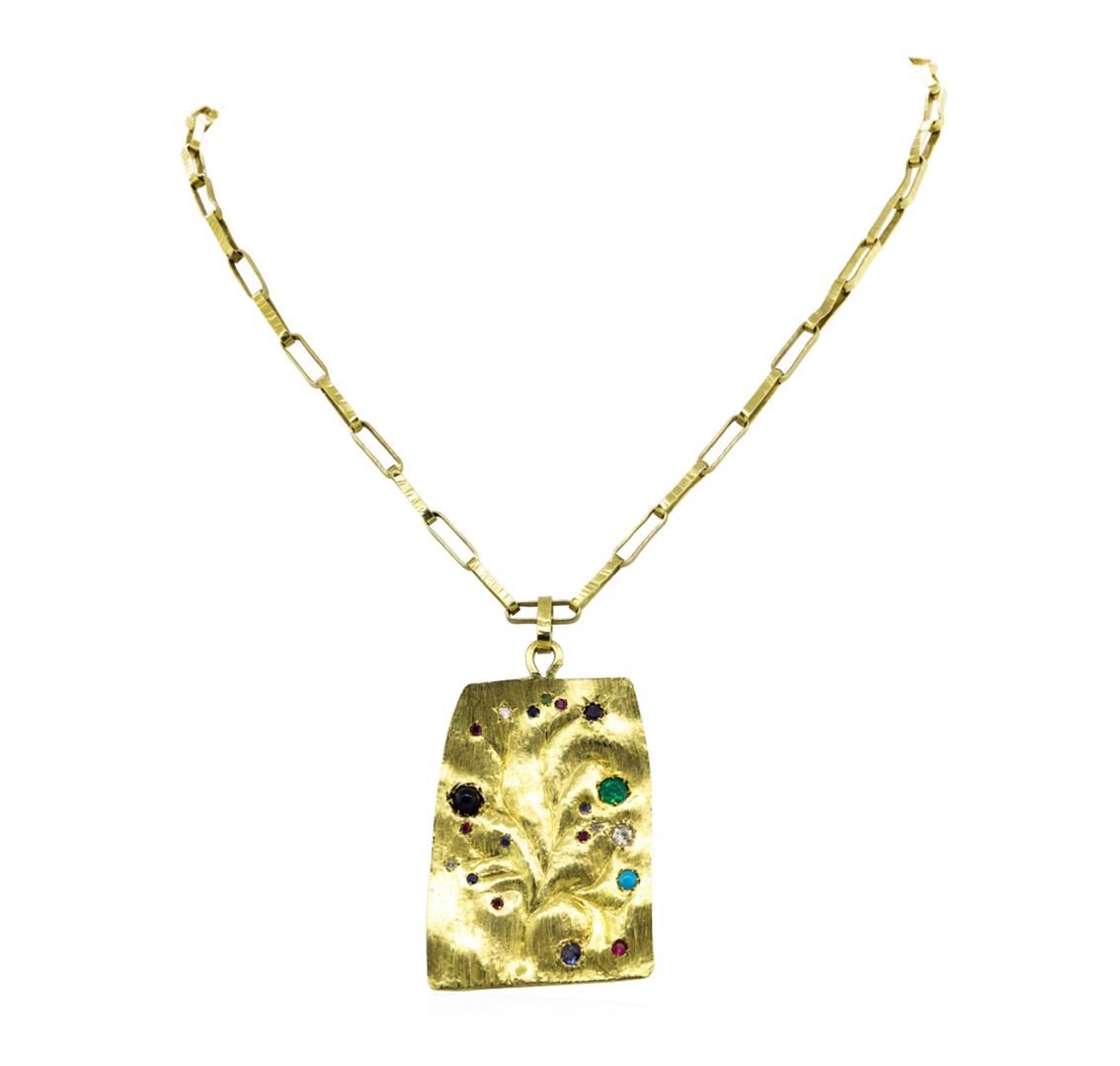 One pendant with chain featuring: 18KT yellow gold weighing 39.8 grams containing multi-color synthetic stones. The chain measures approximately thirty-six inches in length.