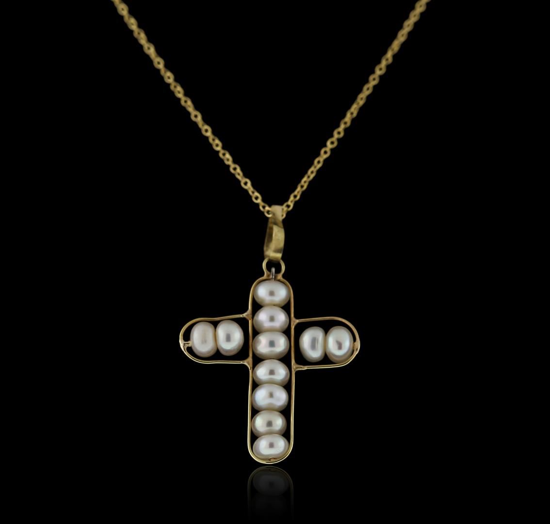 One cross pendant with chain featuring: 18KT yellow gold weighing 2.18 grams containing pearls.
