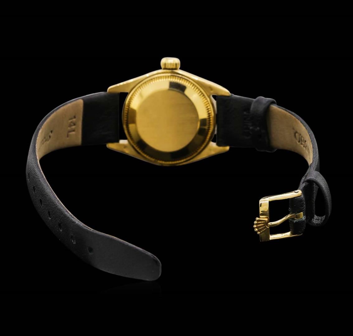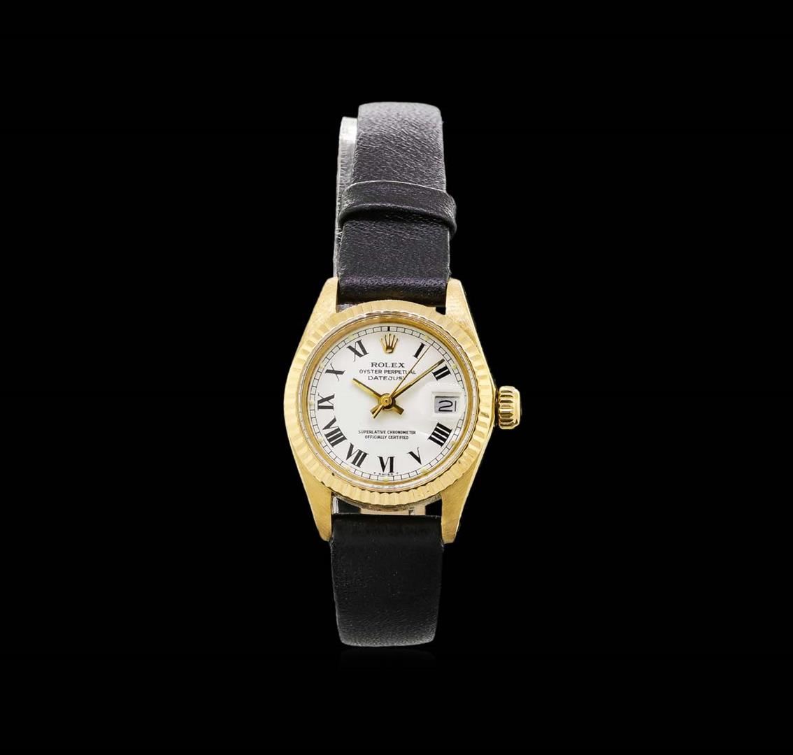 One ladies, hand crafted & machine milled Rolex DateJust model wristwatch electronically tested 18KT yellow gold, Case: 26mm oyster, Crown: twinlock with logo, Bezel: fluted, Crystal: acrylic cyclops lens, Circa: 1979. Movement: superlative chronometer, Custom Dial: White, baton hands, and Roman numerals, Date Window: 3 o'clock position, non-quick set, Bracelet: leather strap, Condition: G-4 Average. Bright polish finish. Seven and three quarter inch length, adjustable. Total Weight of Watch 32.57gm. AIG Appraised at $6,880.00.