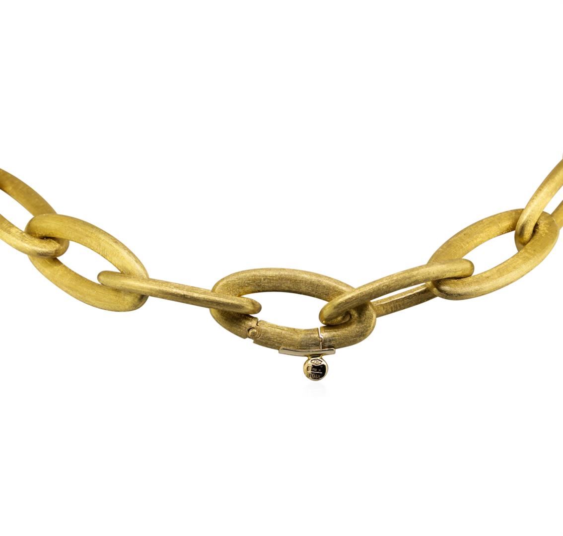 One oval link Nanis necklace featuring: 18KT yellow gold weighing 46.7 grams. The necklace measures approximately sixteen inches in length.