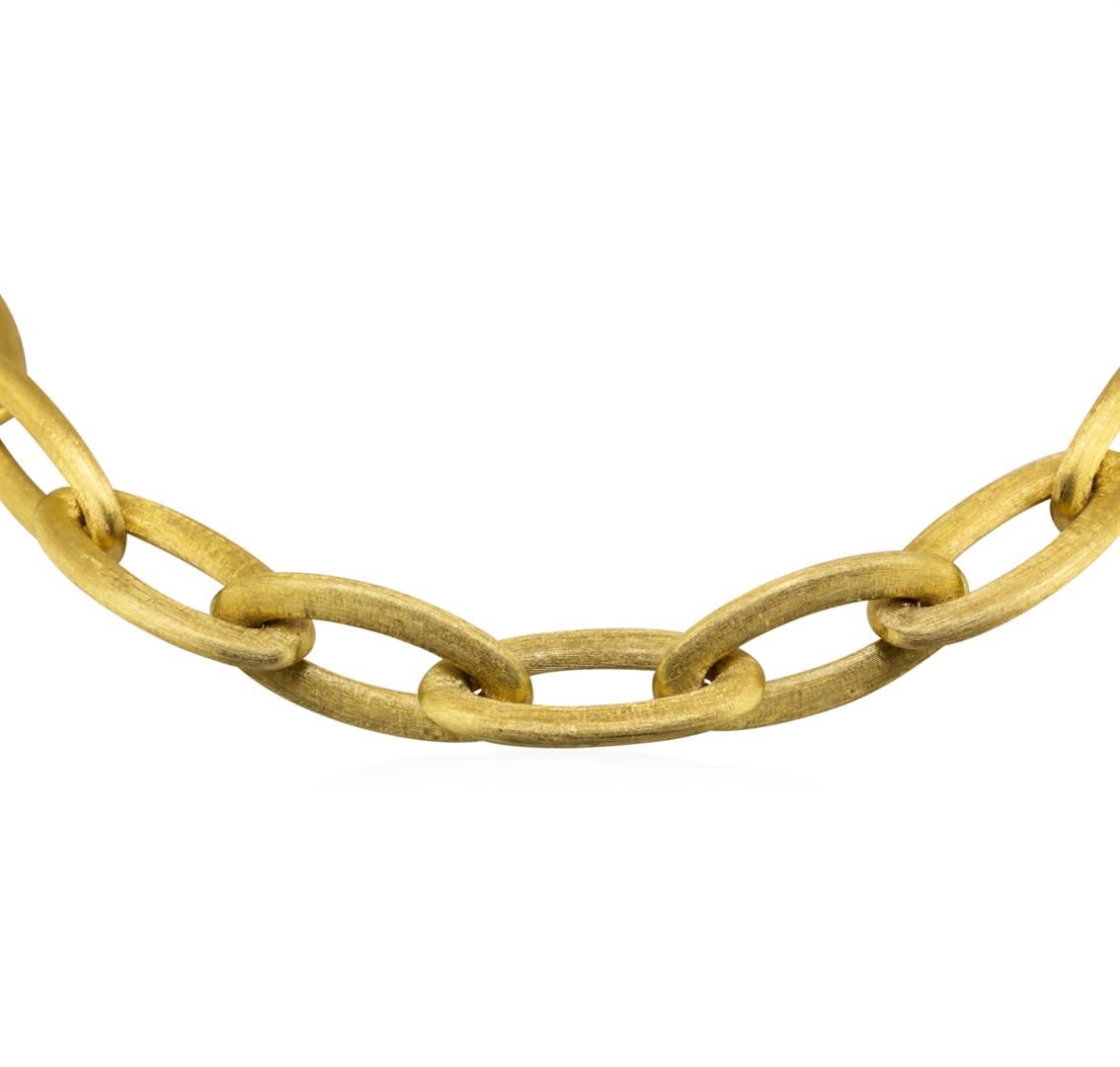 One oval link Nanis necklace featuring: 18KT yellow gold weighing 46.7 grams. The necklace measures approximately sixteen inches in length.