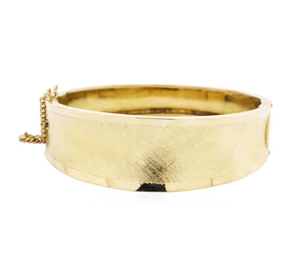 One lady's tapered bangle bracelet featuring: 18KT yellow gold weighing 28.1 grams. The bracelet has an attached safety chain and measures approximately seven inches in circumference, tapering from 10.4 to 20.6 millimeters.