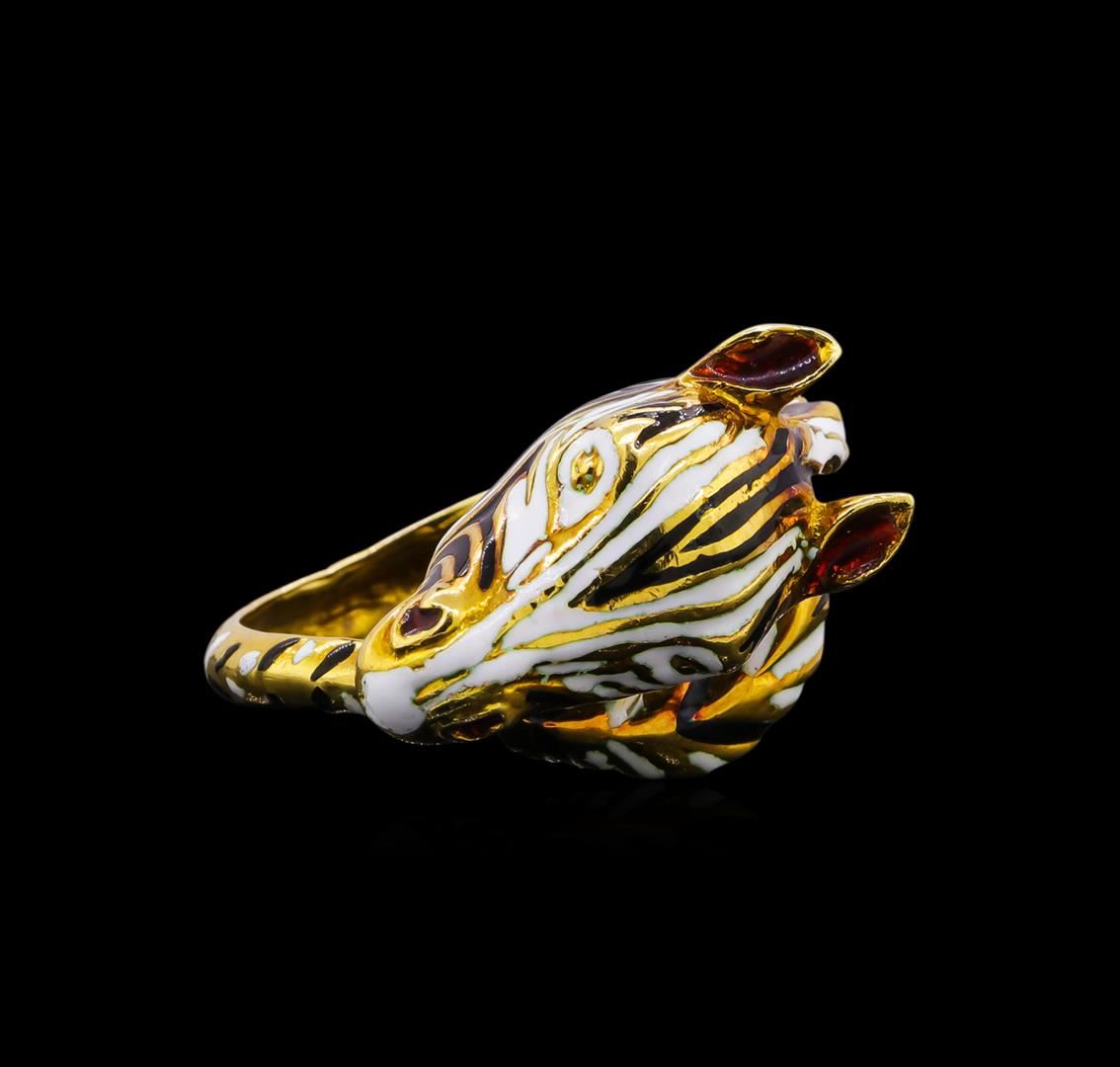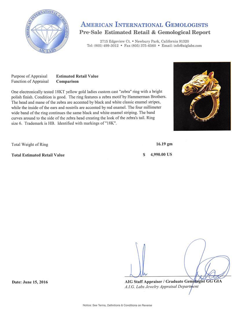 One electronically tested 18KT yellow gold ladies custom cast "zebra" ring with a bright polish finish. The ring features a zebra motif by Hammerman Brothers. The head and mane of the zebra are accented by black and white classic enamel stripes, while the inside of the ears and nostrils are accented by red enamel. The four millimeter wide band of the ring continues the same black and white enamel striping. The band curves around to the side of the zebra head creating the look of the zebra's tail. Ring size 6. Trademark is HB. Identified with markings of "18K". Condition is good. Total Weight of Ring 16.19gm. AIG Appraised.