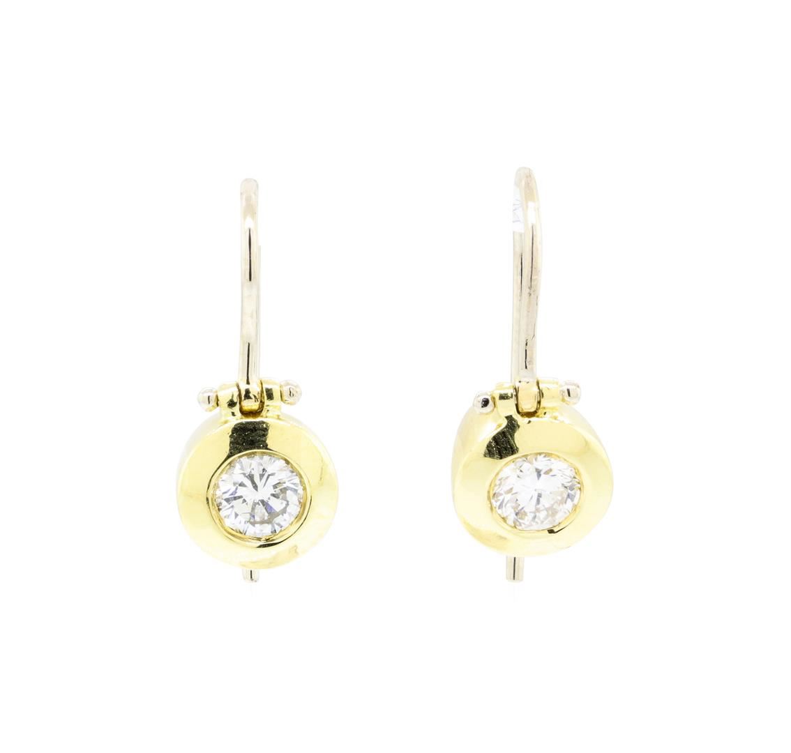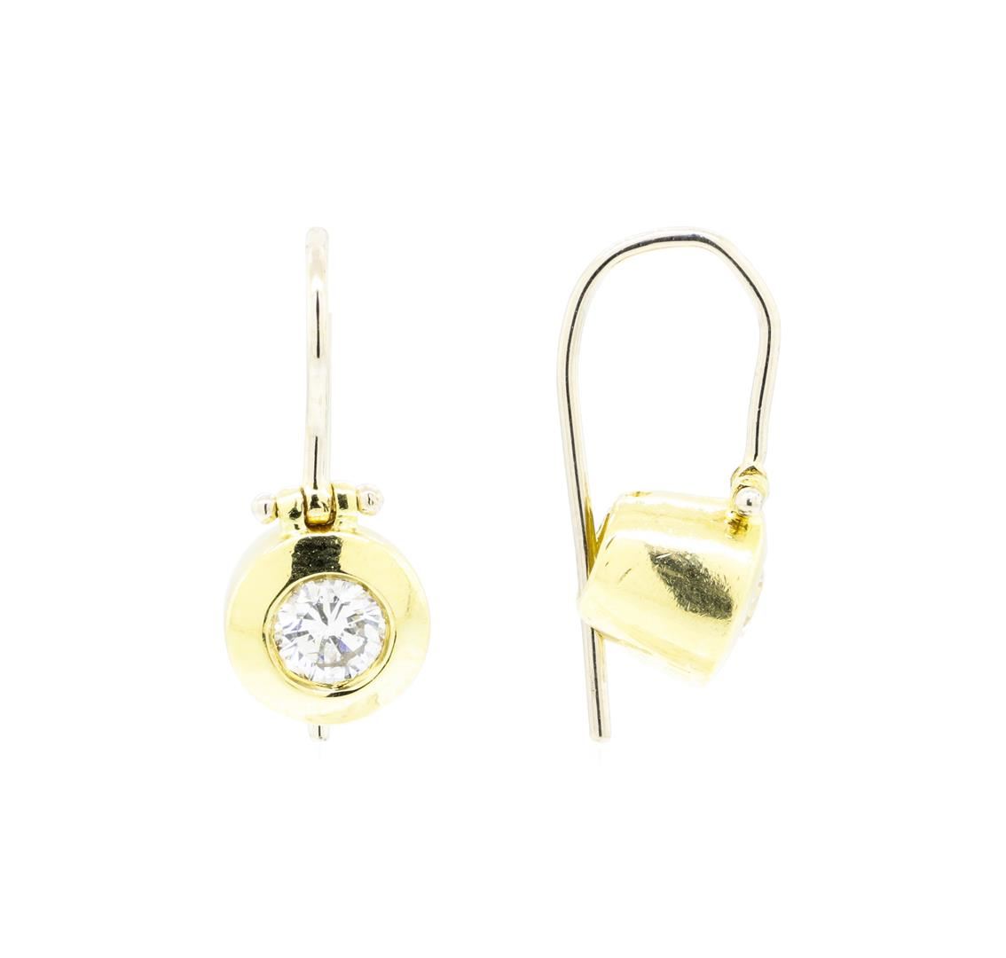 One pair electronically tested 18KT yellow and white gold lady's combination cast & assembled fashion earrings with ear wires with a bright polish finish. Identified with markings of '18K'. Condition is like new, good workmanship. Containing: Two bezel set round brilliant cut diamonds, measuring 4.65 - 4.60 x 2.60mm (depth est.) approximate total weight of 2 Stones = 0.68ct. Graded in the setting. Color G - H Clarity VS-2 to SI-1 Cut Very Good. Total Weight of Diamonds 0.68ct.. Total Weight of Earrings 5.20gm. GAS Appraised.