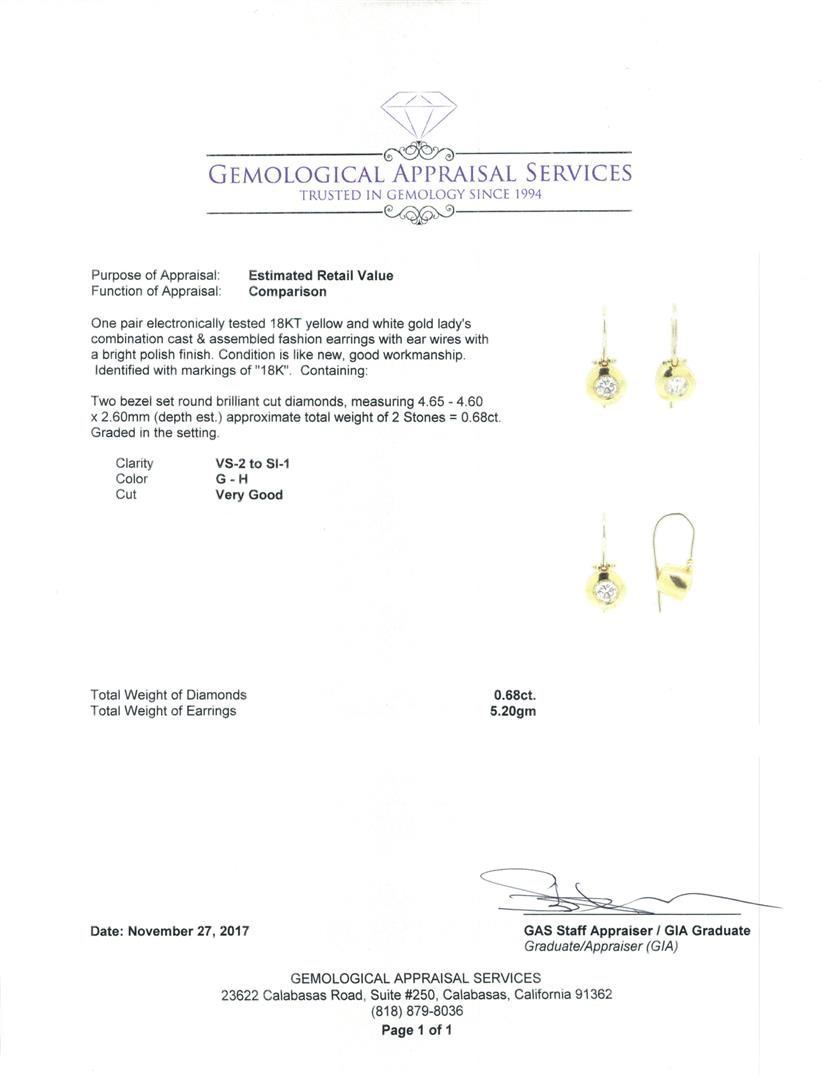One pair electronically tested 18KT yellow and white gold lady's combination cast & assembled fashion earrings with ear wires with a bright polish finish. Identified with markings of '18K'. Condition is like new, good workmanship. Containing: Two bezel set round brilliant cut diamonds, measuring 4.65 - 4.60 x 2.60mm (depth est.) approximate total weight of 2 Stones = 0.68ct. Graded in the setting. Color G - H Clarity VS-2 to SI-1 Cut Very Good. Total Weight of Diamonds 0.68ct.. Total Weight of Earrings 5.20gm. GAS Appraised.