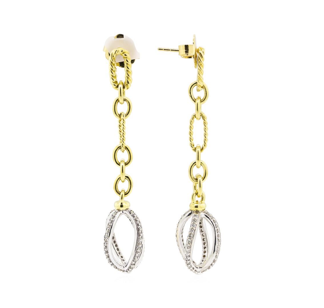 One pair electronically tested 18KT yellow and white gold lady's combination cast & assembled dangle earrings with heavy friction backs with a bright polish finish. The featured lady's earrings are from the David Yurman 'Lantana' collection and have a drop measuring 61 millimeters. Trademark is D. Y. Identified with markings of '18K 750'. Condition is new, good workmanship. Containing: One Hundred Twelve prong set round brilliant cut diamonds, measuring 1.30 - 1.20 x 0.75mm (depth est.) approximate total weight of 112 Stones = 0.80ct. Graded in the setting. Color G - H Clarity VS-1 to SI-1 Cut Very Good. Total Weight of Diamonds 0.80ct.. Total Weight of Earrings 13.20gm. GAS Appraised.
