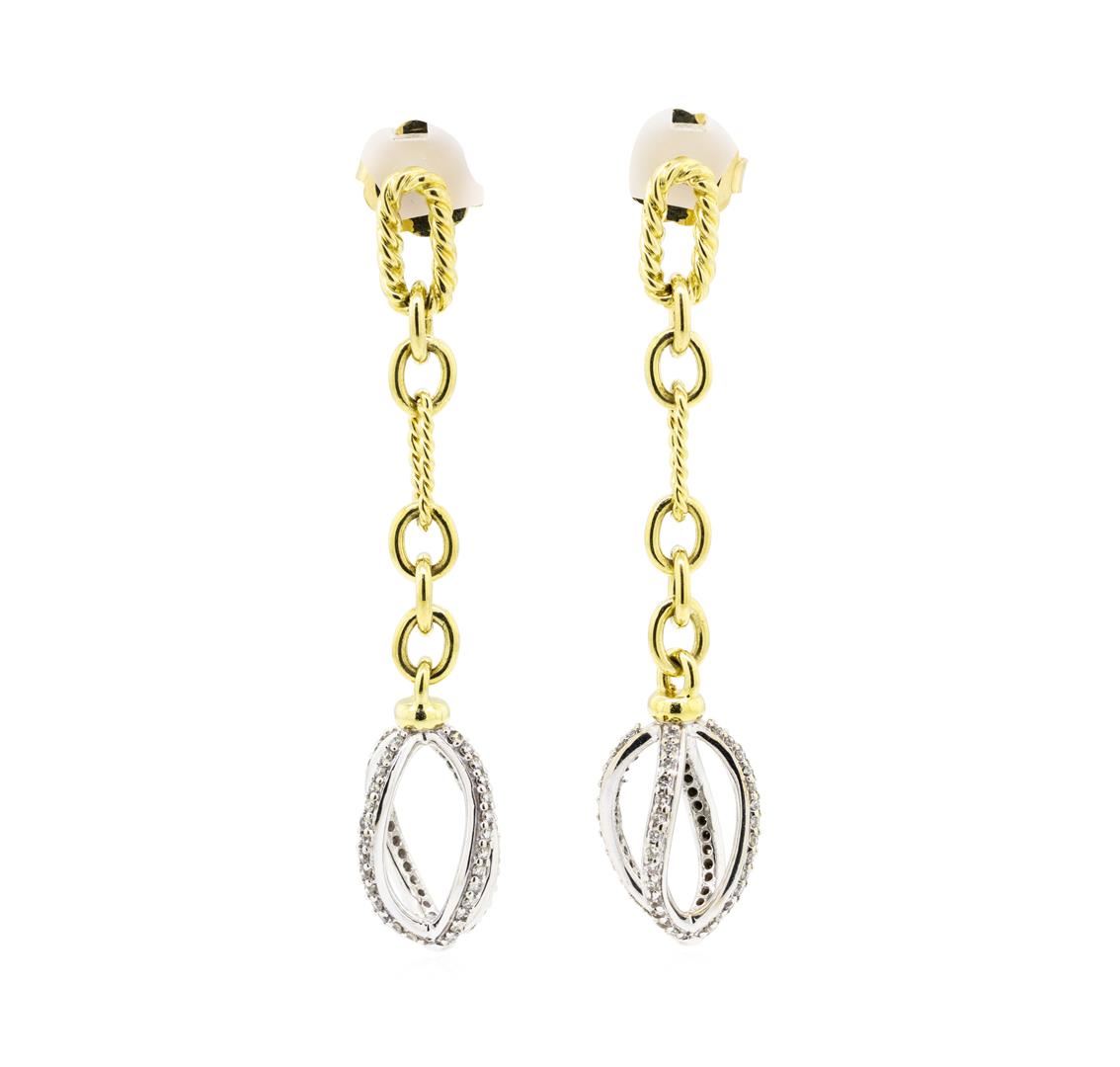 One pair electronically tested 18KT yellow and white gold lady's combination cast & assembled dangle earrings with heavy friction backs with a bright polish finish. The featured lady's earrings are from the David Yurman 'Lantana' collection and have a drop measuring 61 millimeters. Trademark is D. Y. Identified with markings of '18K 750'. Condition is new, good workmanship. Containing: One Hundred Twelve prong set round brilliant cut diamonds, measuring 1.30 - 1.20 x 0.75mm (depth est.) approximate total weight of 112 Stones = 0.80ct. Graded in the setting. Color G - H Clarity VS-1 to SI-1 Cut Very Good. Total Weight of Diamonds 0.80ct.. Total Weight of Earrings 13.20gm. GAS Appraised.