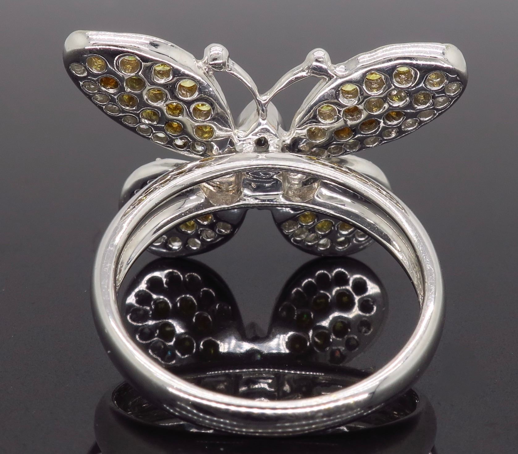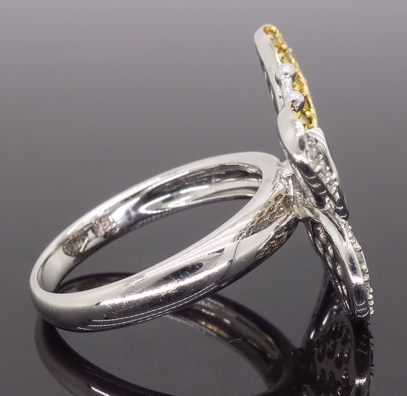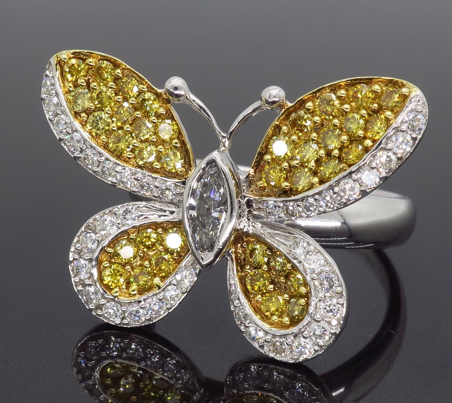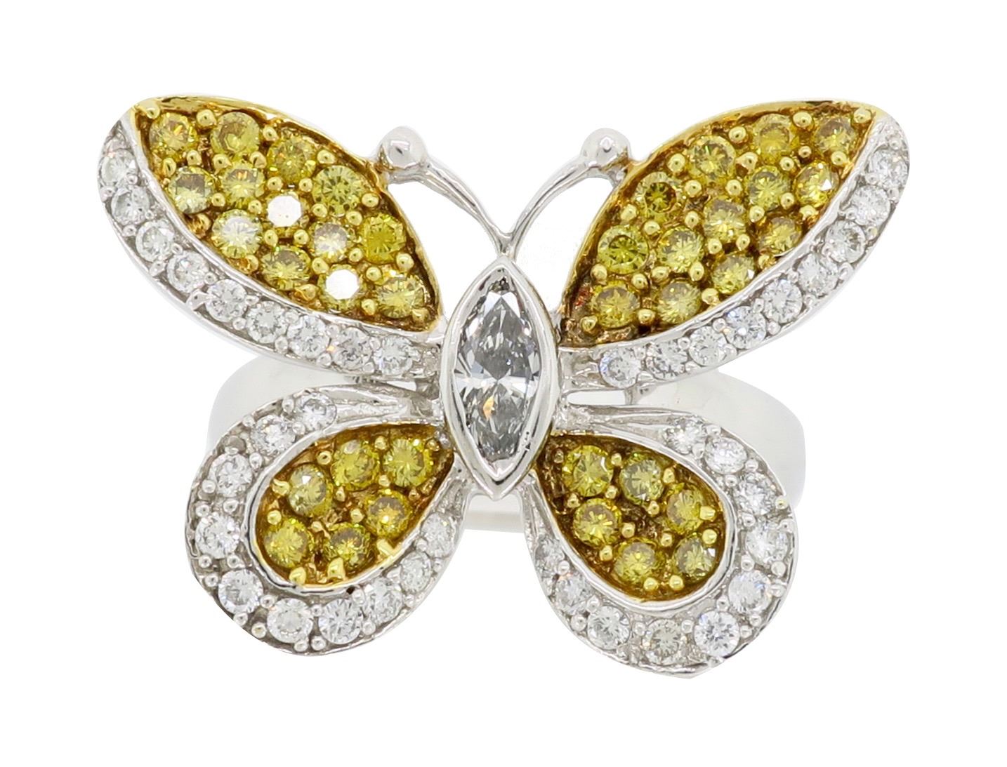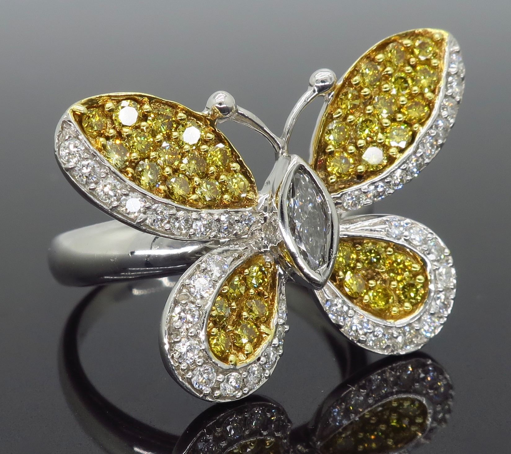 One 18KT Yellow & White Gold 1.30ctw Diamond Ring. (76) Round Diamonds and (1) Marquise Diamond with a total weight of 1.30cts. (39) with a color of G-J and (38) with a color of yellow. All Diamonds have a clarity of VS-2 to SI-2. Total weight of this ring is 6.9 grams. Ring size is 6.5.
