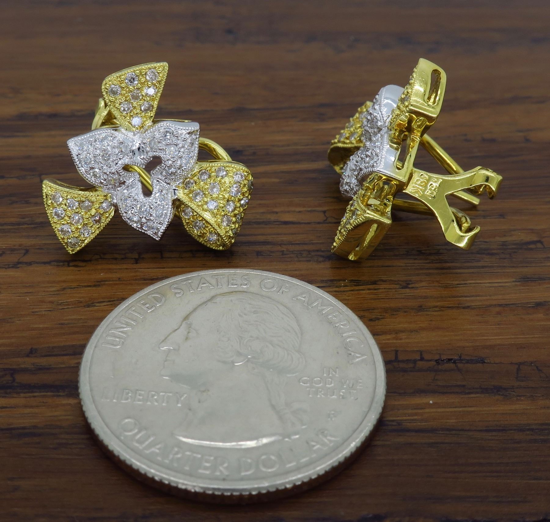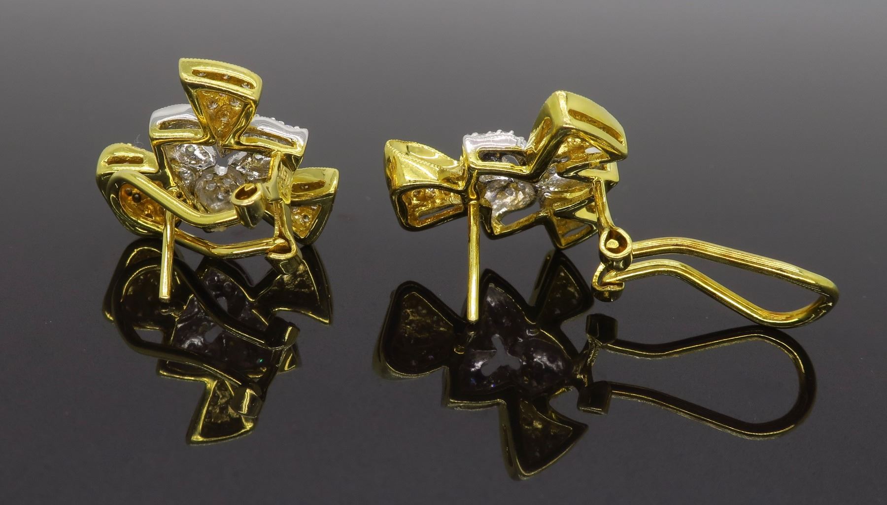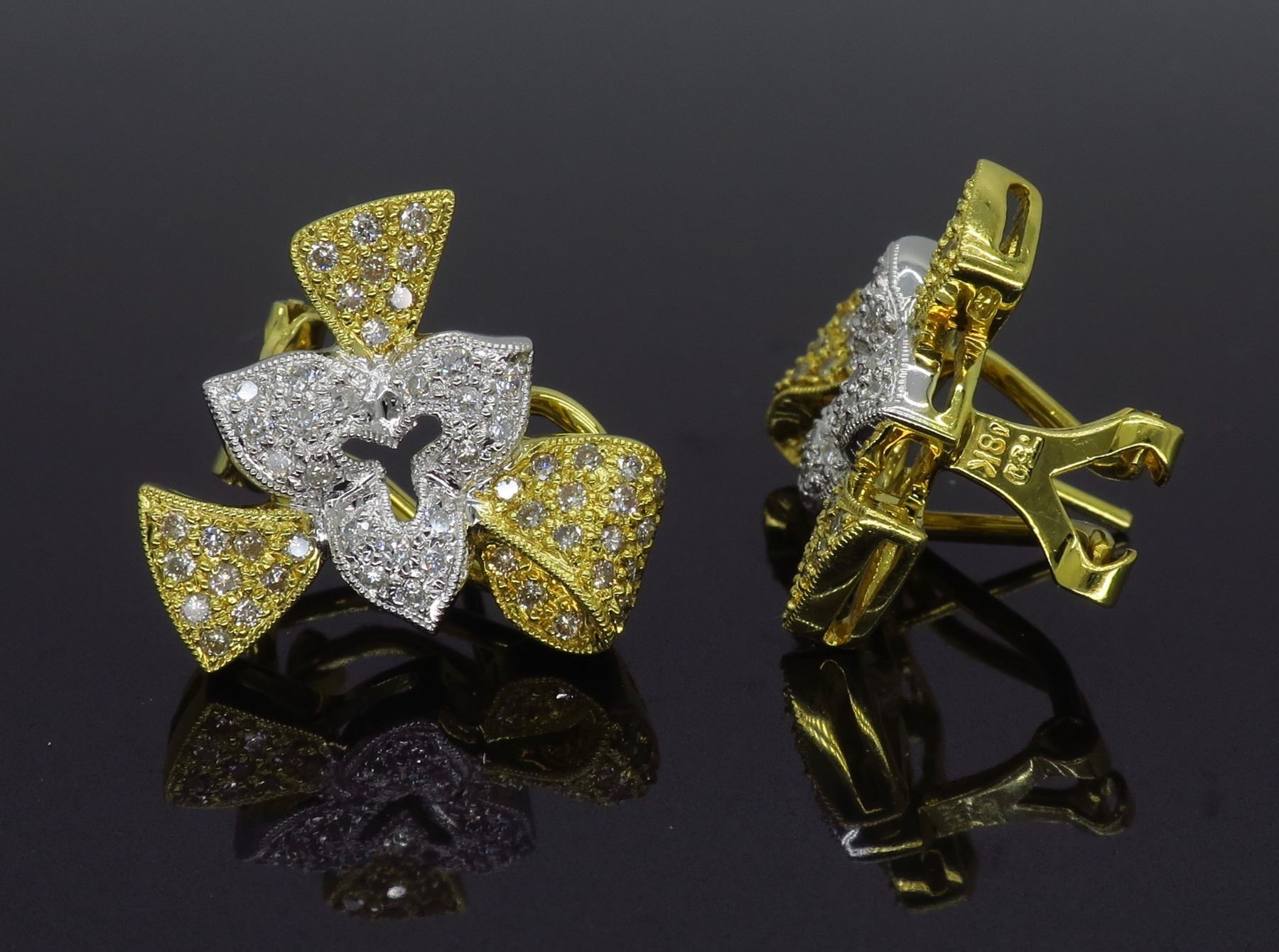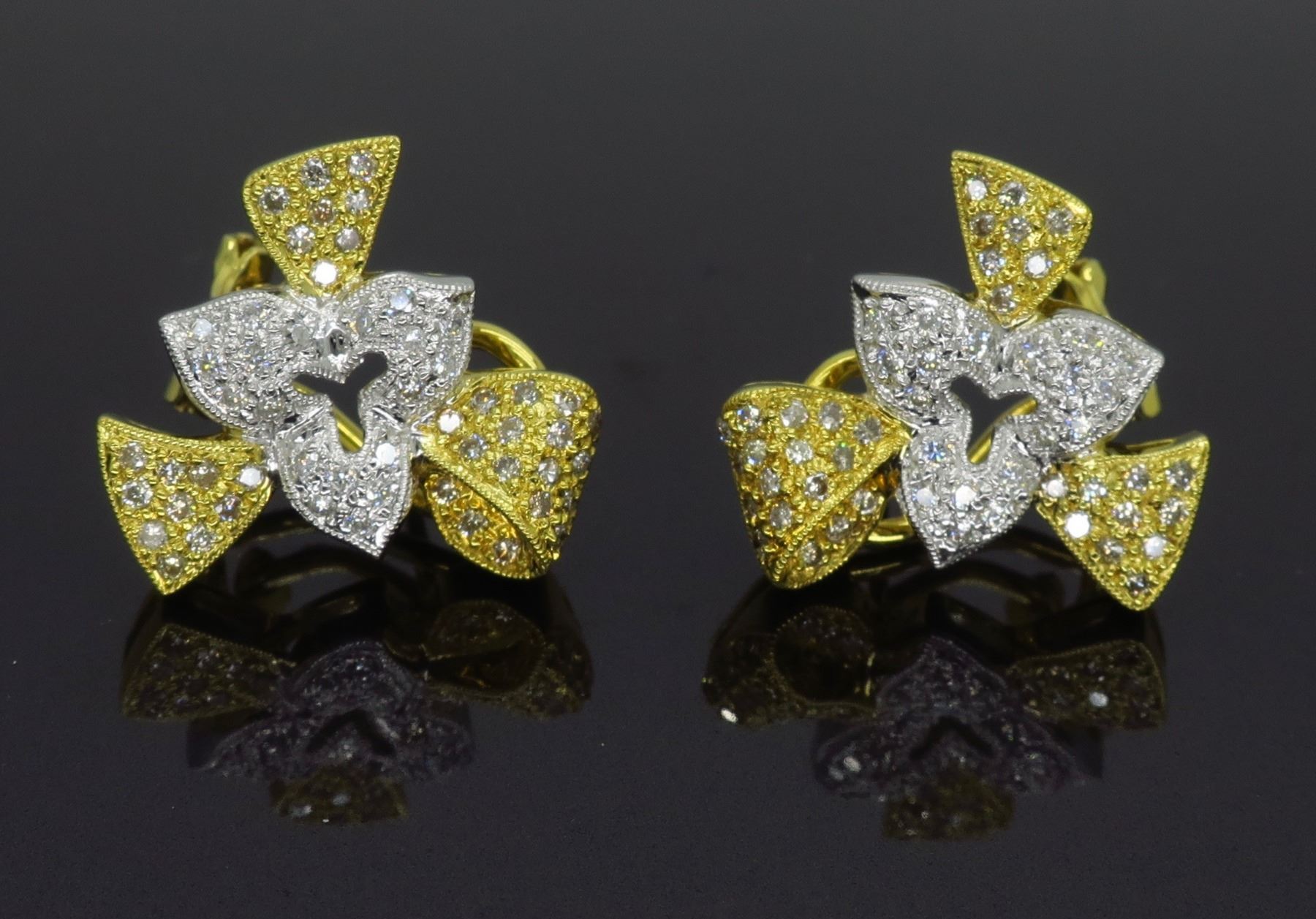 One 18KT Yellow & White Gold 1.50Ctw Diamond Earrings. Round Diamonds with a total weight of 1.50cts with a color of G-I and clarity of I-1. Total weight of these earrings are 10.0 grams. Length of each earring is 0.75 inches.