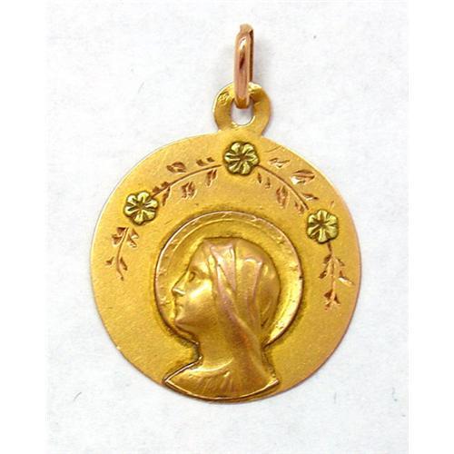 Lovely 18kt pink, green and yellow gold pendant was given to commemorate First Communion. The round flat yellow gold disc with pink gold details features the profile of the haloed Virgin Mary. A floral sprig above displays three flowers in green gold. The reverse bears a script inscription in French: "M R 1re Communion 9 Mai 1918. "1.3dwt (2g)