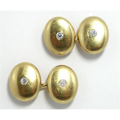 Heavy double sided cufflinks with a round diamond set in each, with a 22 Kt gold finish. Marked Tiffany & Co. No gold mark, but tested to be 18Kt. gold. 1/2" x 5/8"