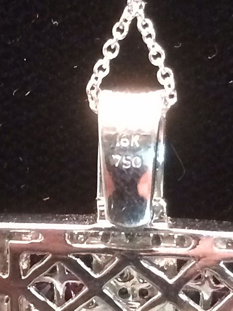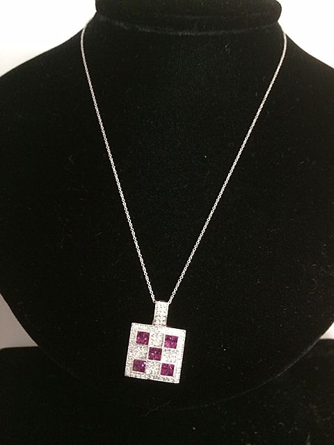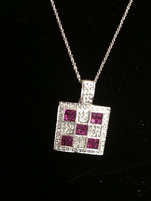 Estate 18kt White Gold Necklace with Ruby and Diamond pendant. 1 RD 0.50; 1 RUBY 2.0; 1 18k 9.00; CHAN 1.00. Originally retailed for $8,425.00.