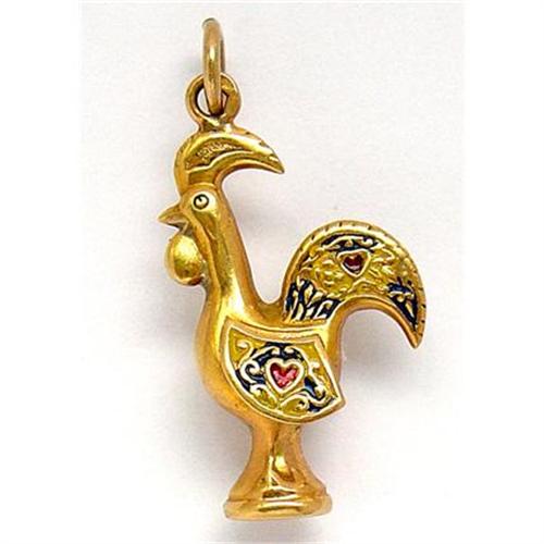 This fanciful gold charm is in the form of a rooster (symbol of the Spanish Mass of the Rooster). The head displays an erect serrated comb and a protuberant wattle. The wings and tail feature heart and scrolling motifs decorated with black and red enamel. The hollow body is formed of two parts. Fully marked on the top loop (I think they are Spanish hallmarks). Material: 18Kt gold