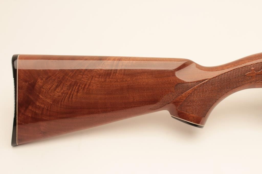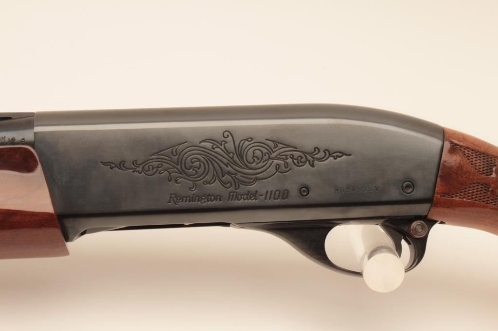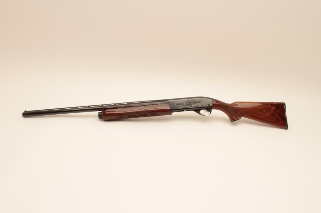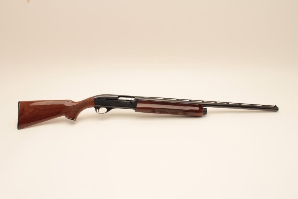 Remington Model 1100 12GASemi-Auto Shotgun with 2 barrels and canvas case, S/N M694535V. #1 barrel measures 26” with vent rib and choked full. #2 barrel measures 30” modified marked of a later production period as mattfinished. The condition is very good to almost fine overall. 96%-98%. Minor use with some slight marks in the wood. Measures 14 1/8” to the end of the plate. (Factory Dimensions). Est.: $350-$700