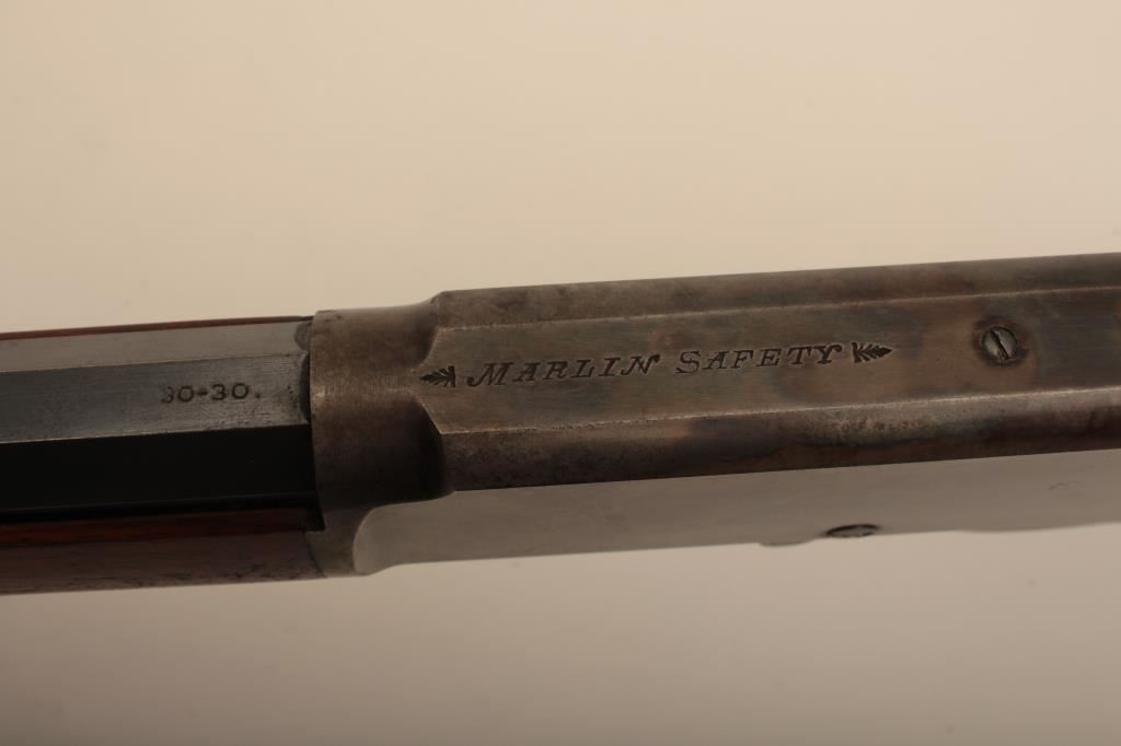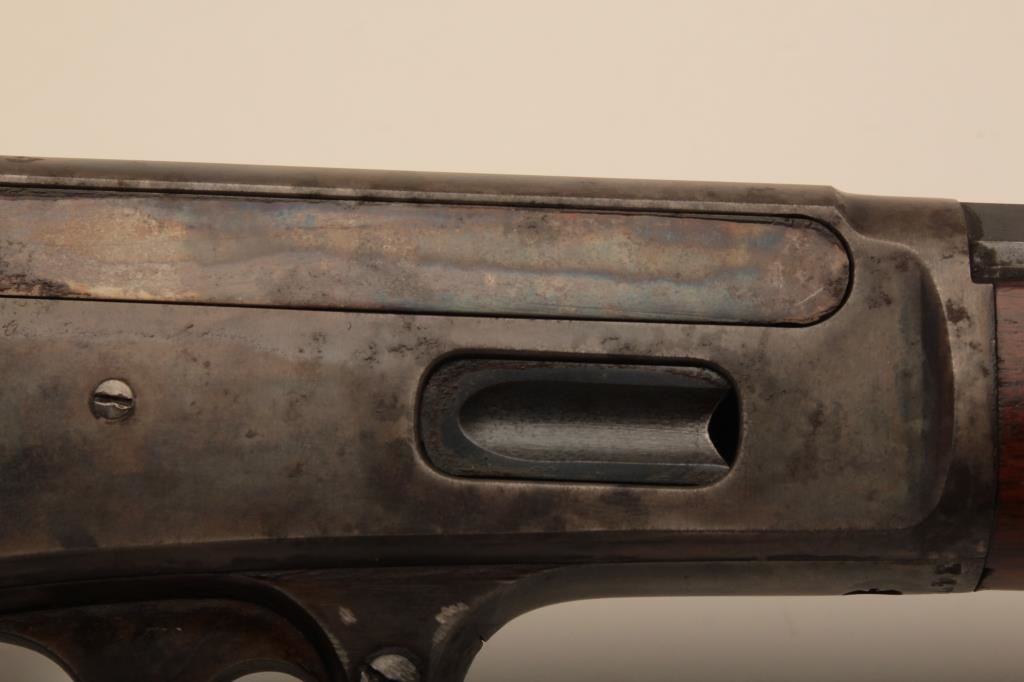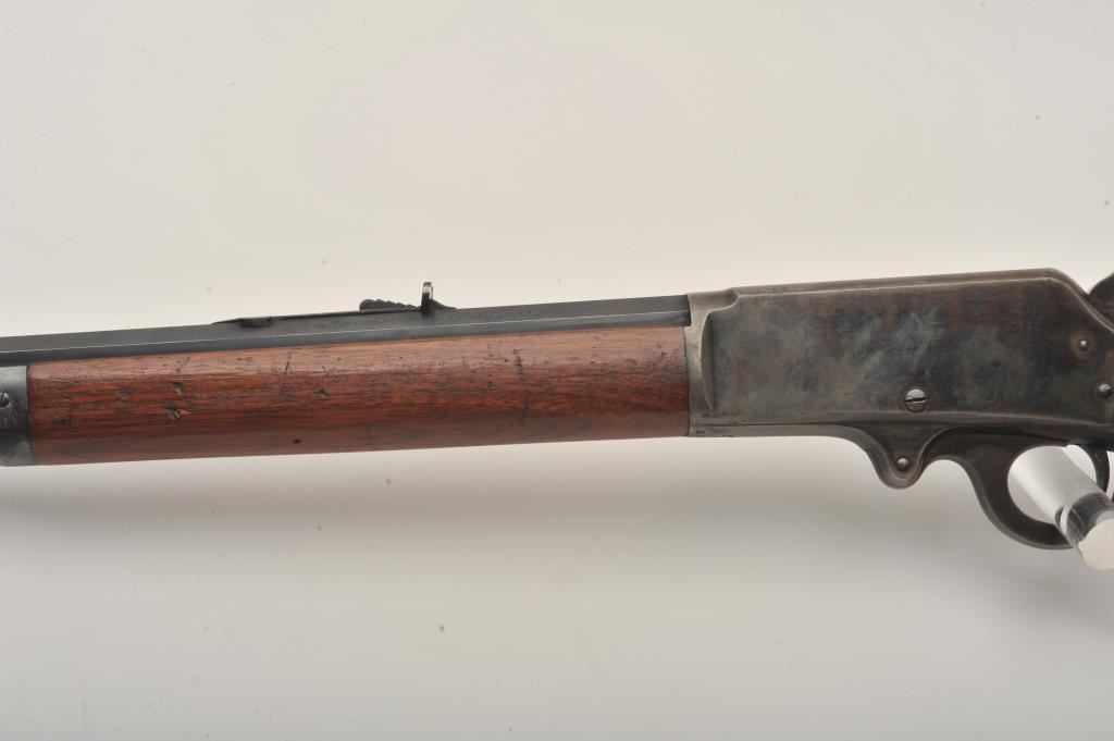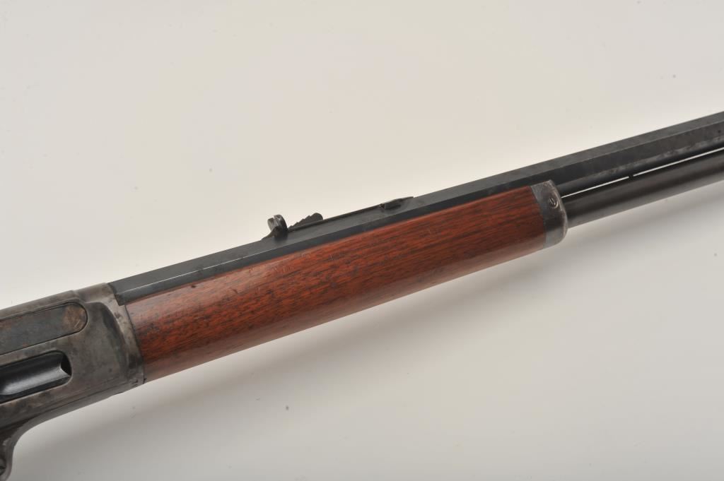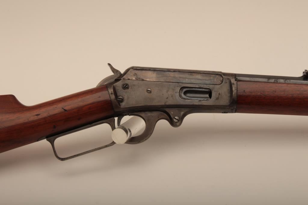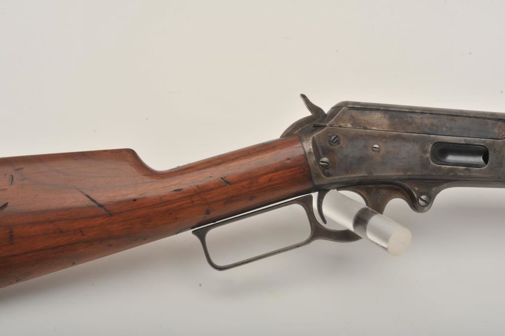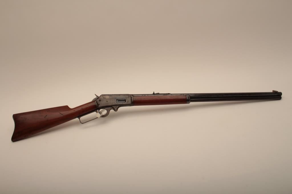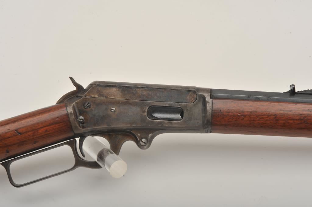 Marlin Model 1893 lever action rifle, .30 WCF caliber, Serial #347919. The rifle is in very good to nearly fine overall condition with a 26” octagon barrel with a silver knife blade front and standard rear sights. The barrel and full-length magazine retain the majority of their original blue finish with scattered light spotting from erosion contained primarily on the right side of the barrel and magazine tube. The receiver, frame, lever and hammer display beautiful, vivid original case hardening. The smooth wood stock is in very good condition with small mars and compressions. The bore is good, the action is crisp and the markings are sharp on this most acceptable Marlin. Est.: $1,000-$2,000. (C+R).