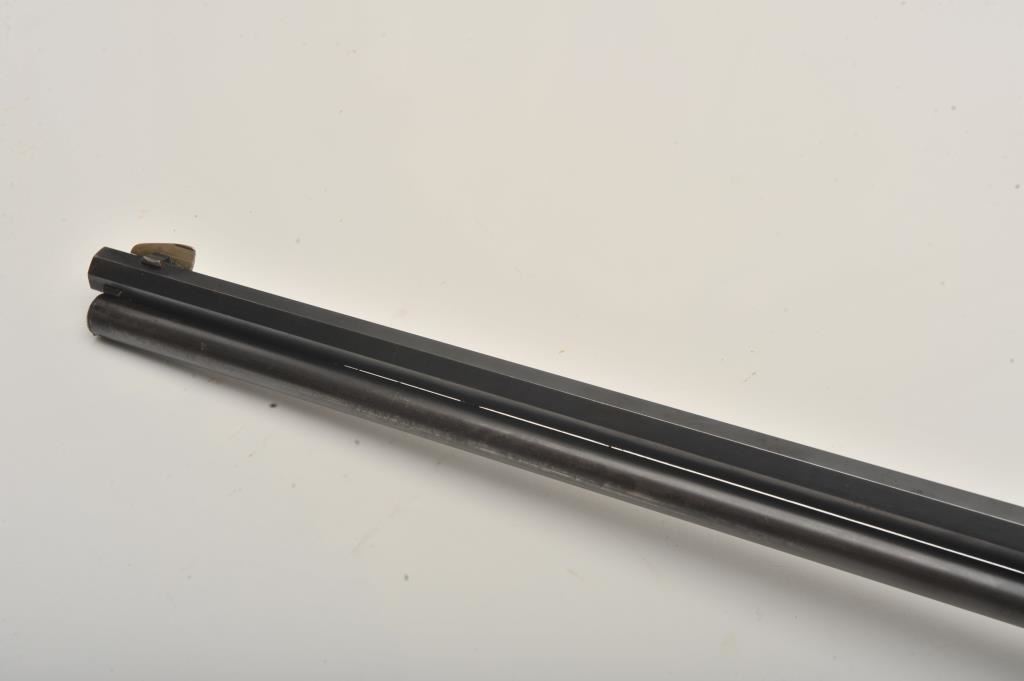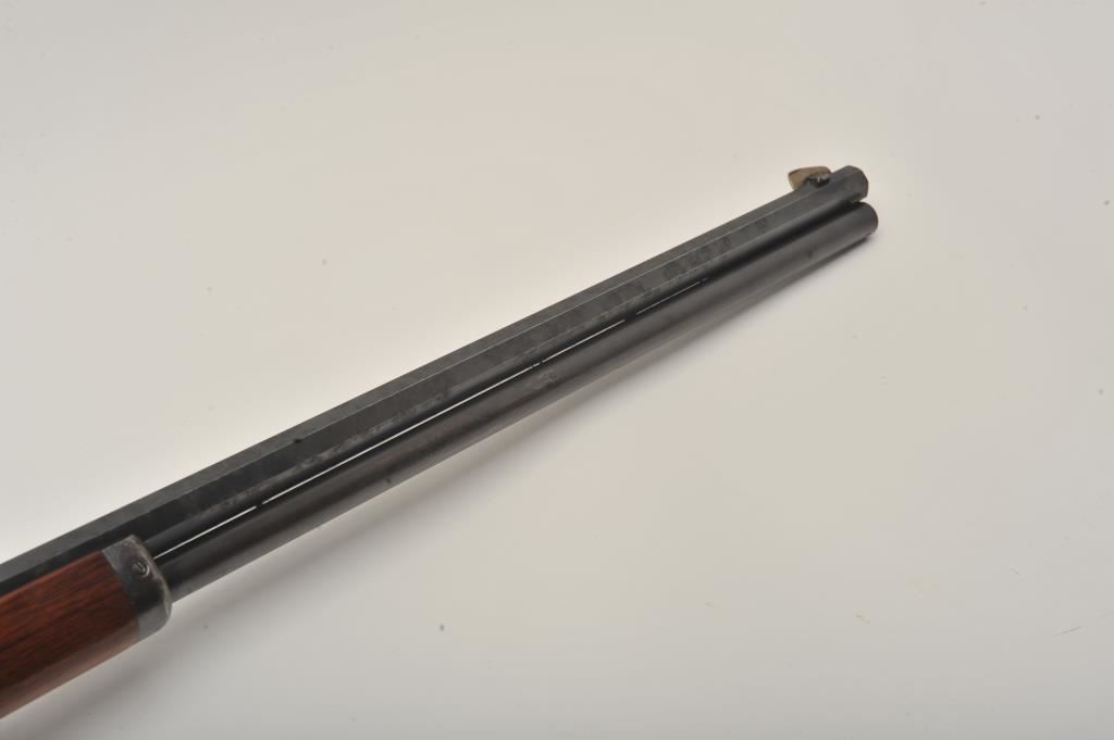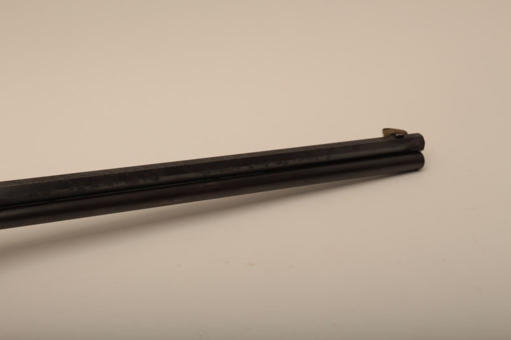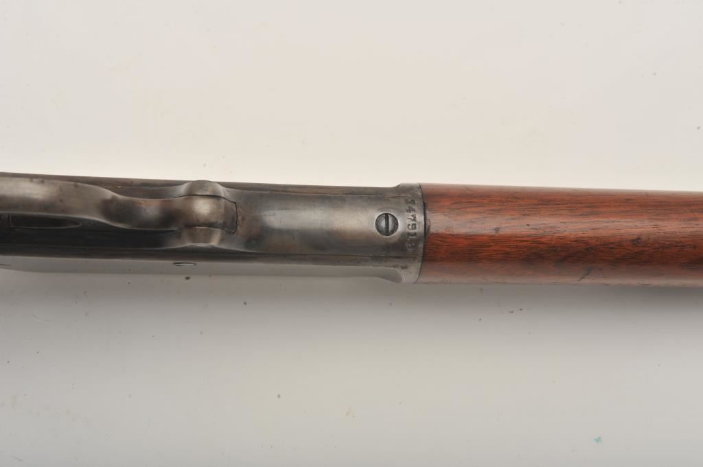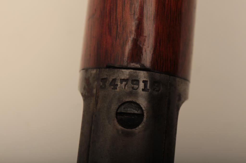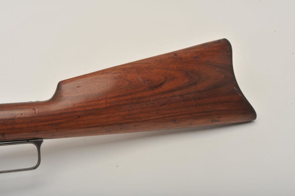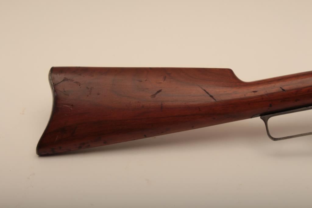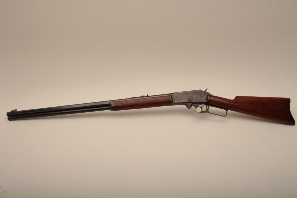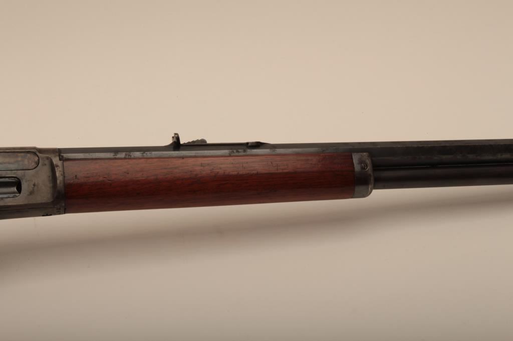Marlin Model 1893 lever action rifle, .30 WCF caliber, Serial #347919. The rifle is in very good to nearly fine overall condition with a 26” octagon barrel with a silver knife blade front and standard rear sights. The barrel and full-length magazine retain the majority of their original blue finish with scattered light spotting from erosion contained primarily on the right side of the barrel and magazine tube. The receiver, frame, lever and hammer display beautiful, vivid original case hardening. The smooth wood stock is in very good condition with small mars and compressions. The bore is good, the action is crisp and the markings are sharp on this most acceptable Marlin. Est.: $1,000-$2,000. (C+R).