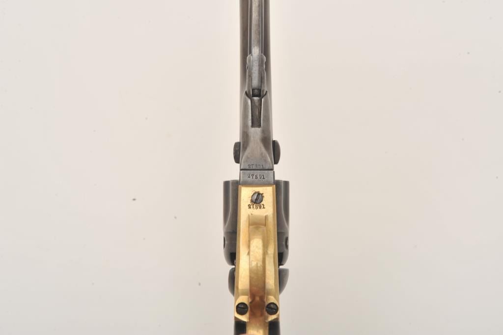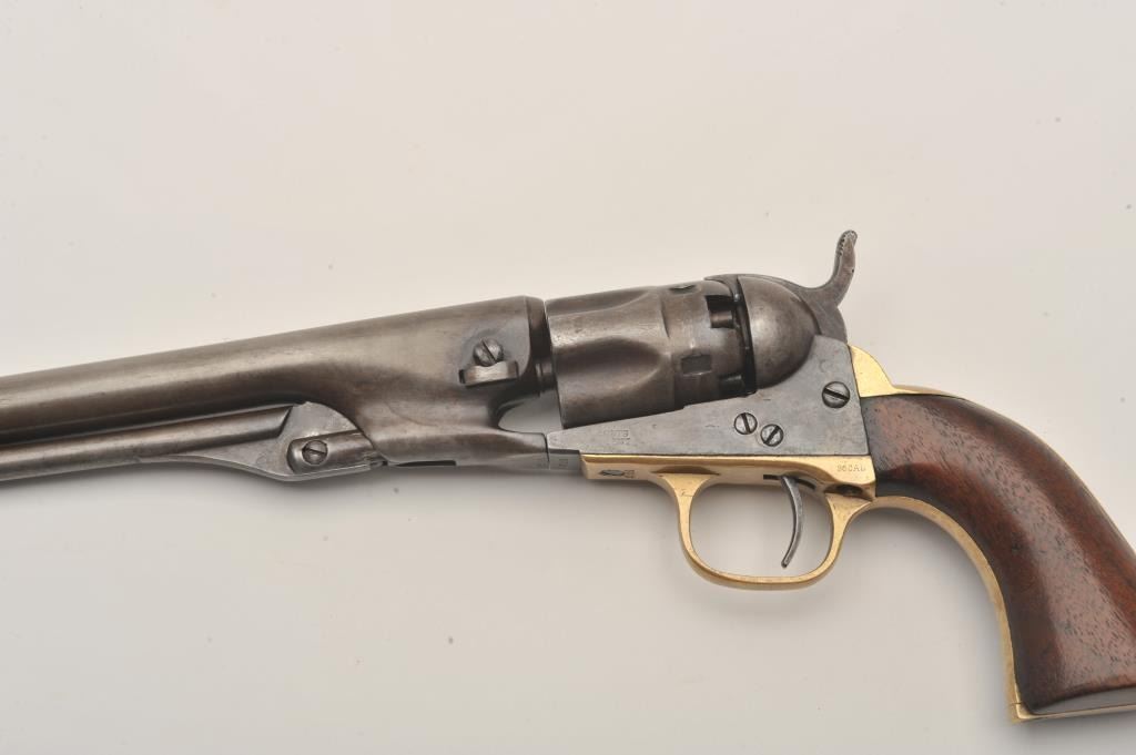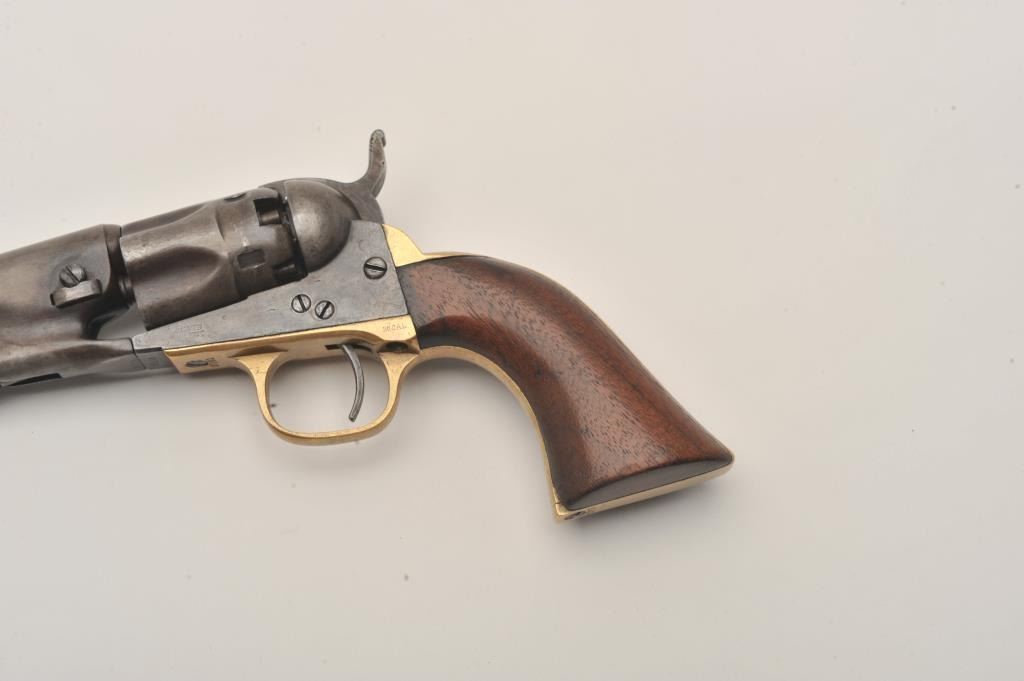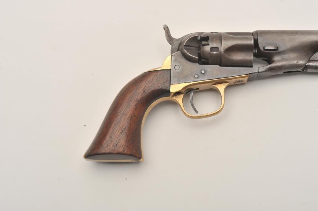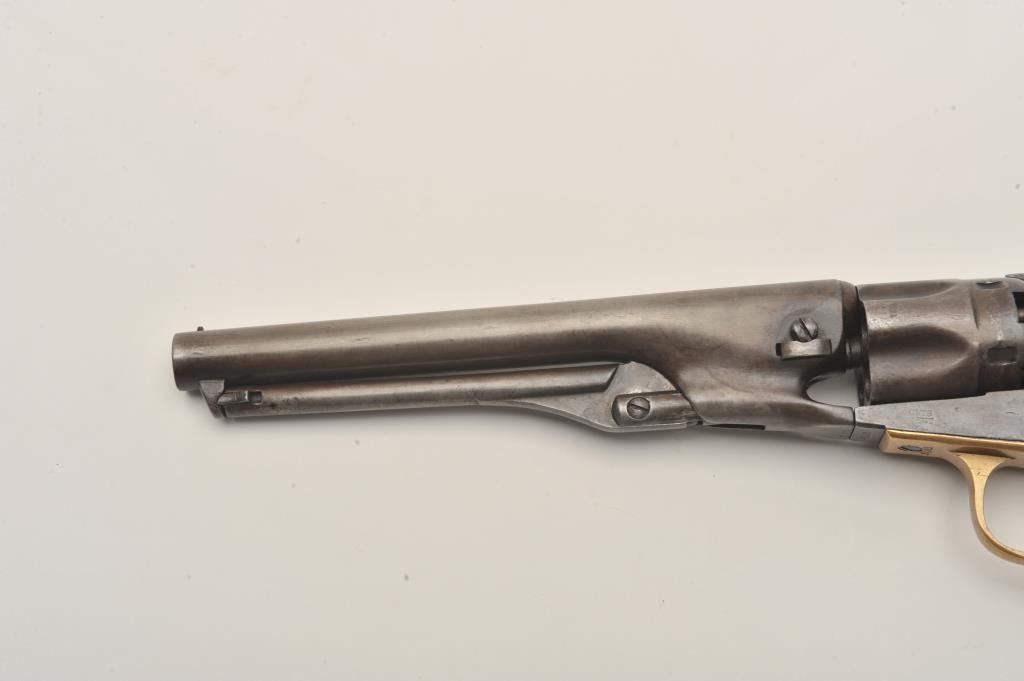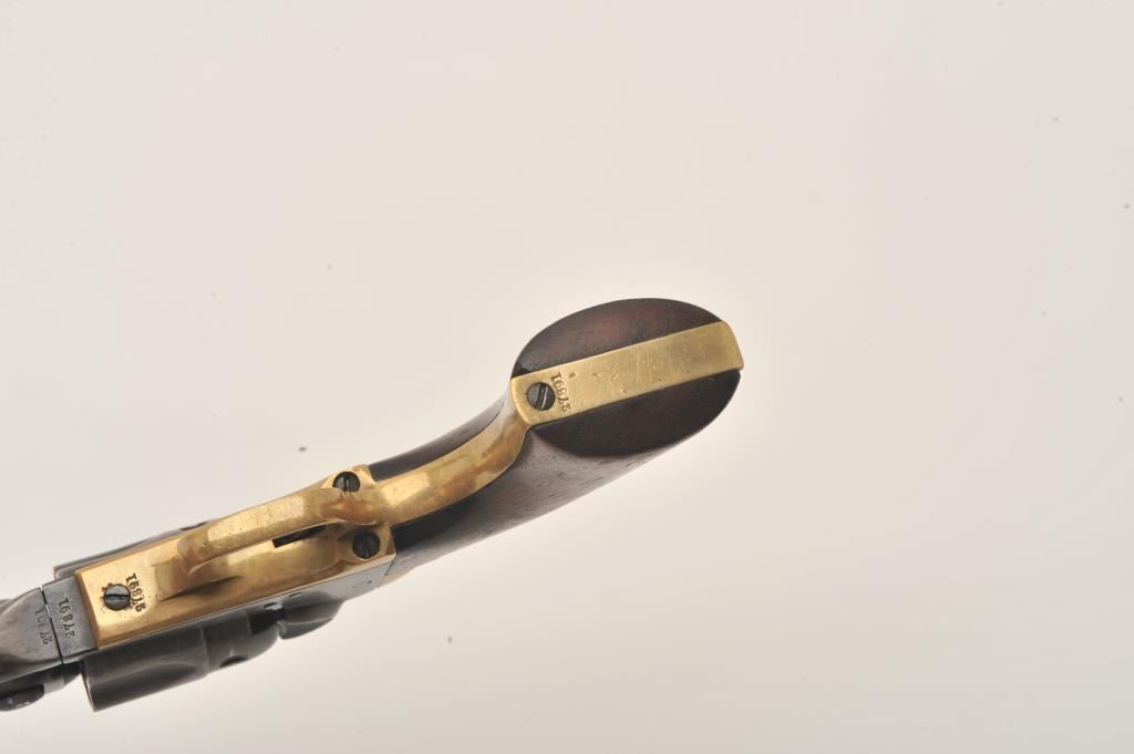 Colt Model 1862 Police percussion revolver, .36 caliber, Serial #27891. The pistol is in very good overall condition with the desirable 6 ½” barrel. The pistol retains a pleasing grey/brown patina to all metalsurfaces, all matching serial numbers except the wedge and all safety pins are present. The markings are sharp, the bore is good and the action is crisp. The smooth wood grips are in very good condition with a small chipat the front left toe. A nice, representative sample circa 1866. Est.: $1,250-$2,500. (Antique).