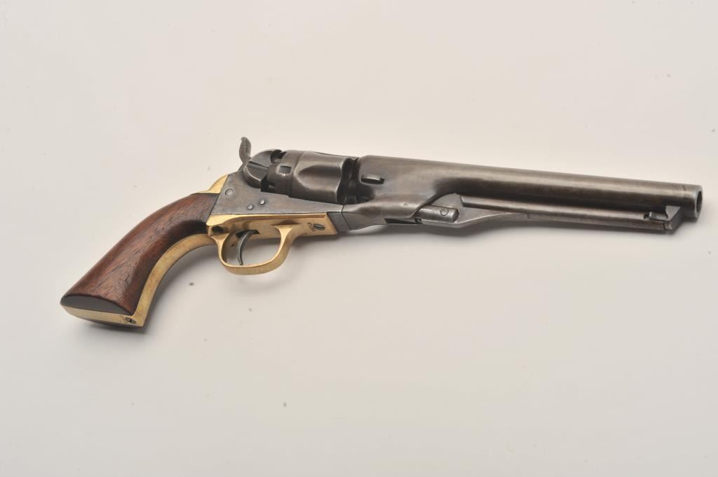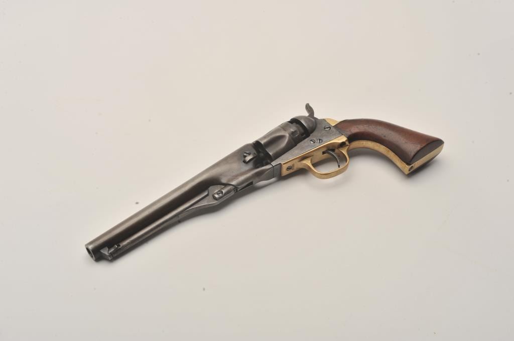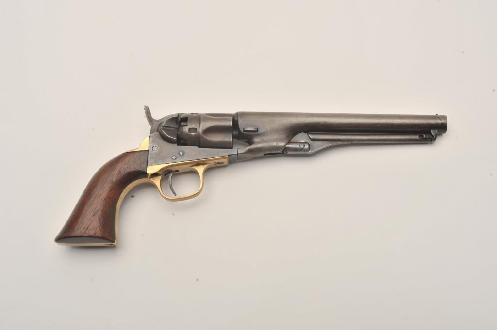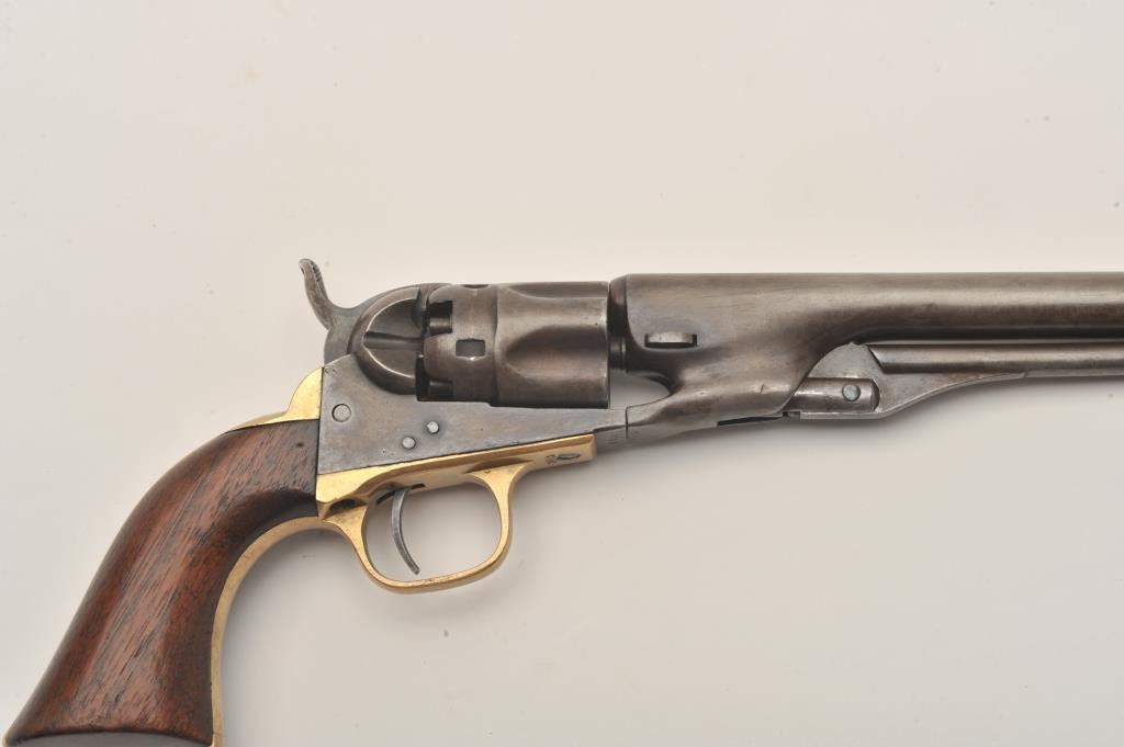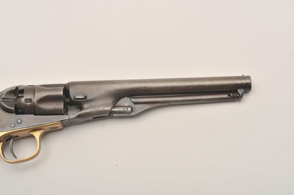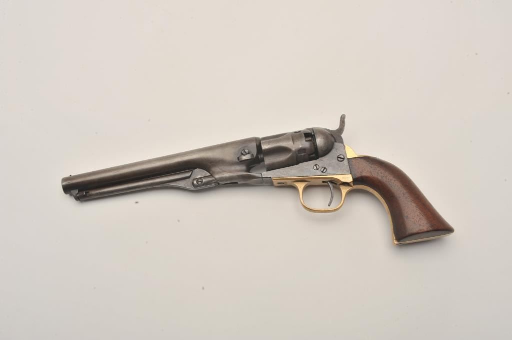Colt Model 1862 Police percussion revolver, .36 caliber, Serial #27891. The pistol is in very good overall condition with the desirable 6 ½” barrel. The pistol retains a pleasing grey/brown patina to all metalsurfaces, all matching serial numbers except the wedge and all safety pins are present. The markings are sharp, the bore is good and the action is crisp. The smooth wood grips are in very good condition with a small chipat the front left toe. A nice, representative sample circa 1866. Est.: $1,250-$2,500. (Antique).