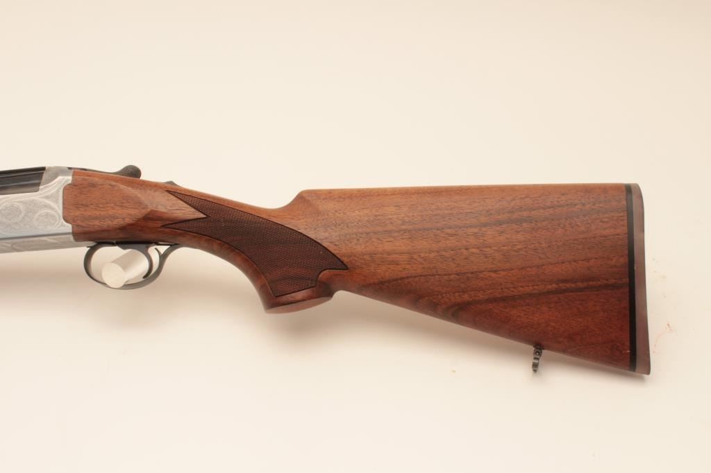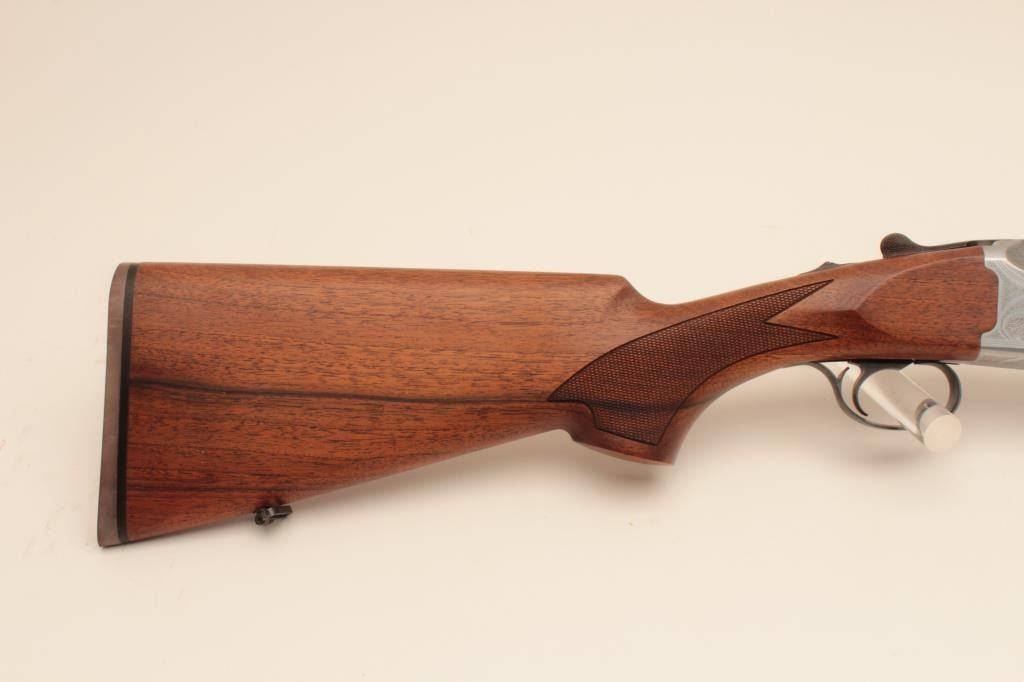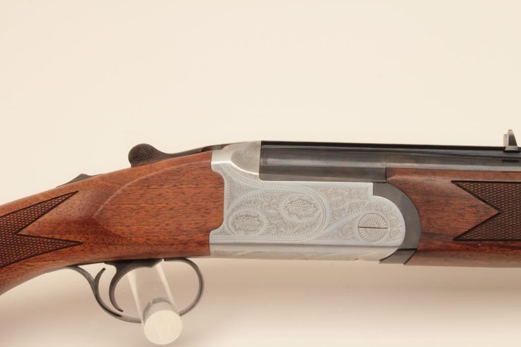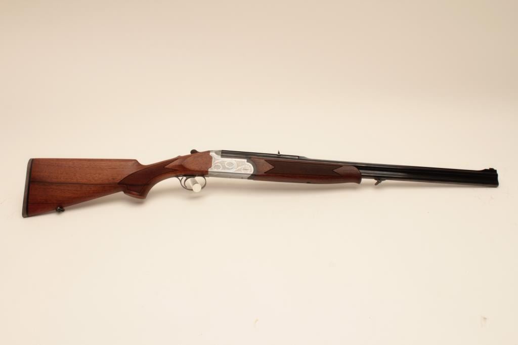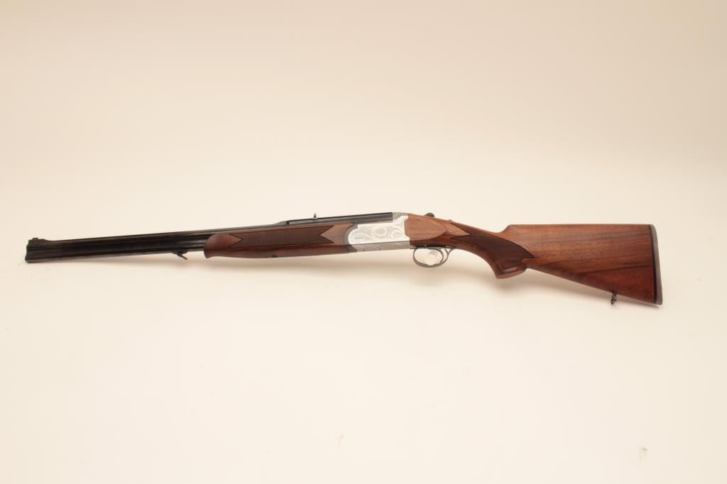 Zoli European Model Over/Under double rifle in 9.3 x 74 caliber with single trigger, selective auto ejectors and a 25 ½” barrel. Classic European styling with long fore end, checkered pistol grip stock, narrow swivelsfor European type sling strap. Floral engraved alloy frame with blued barrels. Italian quality and barrels regulated accurately according to our consignor. Replacement cost approximately $5,000. Lessthan 1 box fired. Est.: $2500-$5000