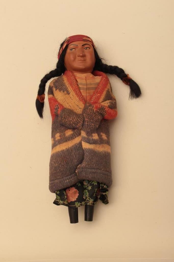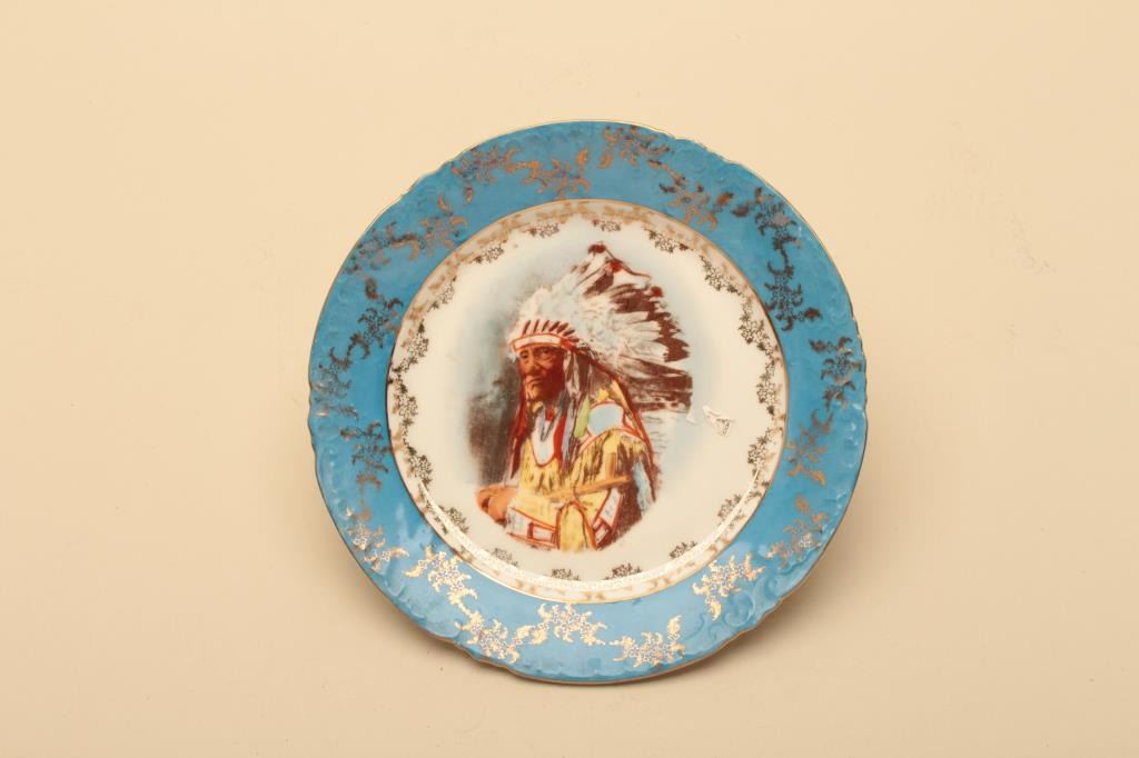 Lot of 2 Skokum doll and porcelain plate showing Native American Chief in full regalia. Plate near fine. Measures 9 5/8” across the center. Doll in fair condition. Collected 1930’s-40’s in Dakota. Est.:$75-$150