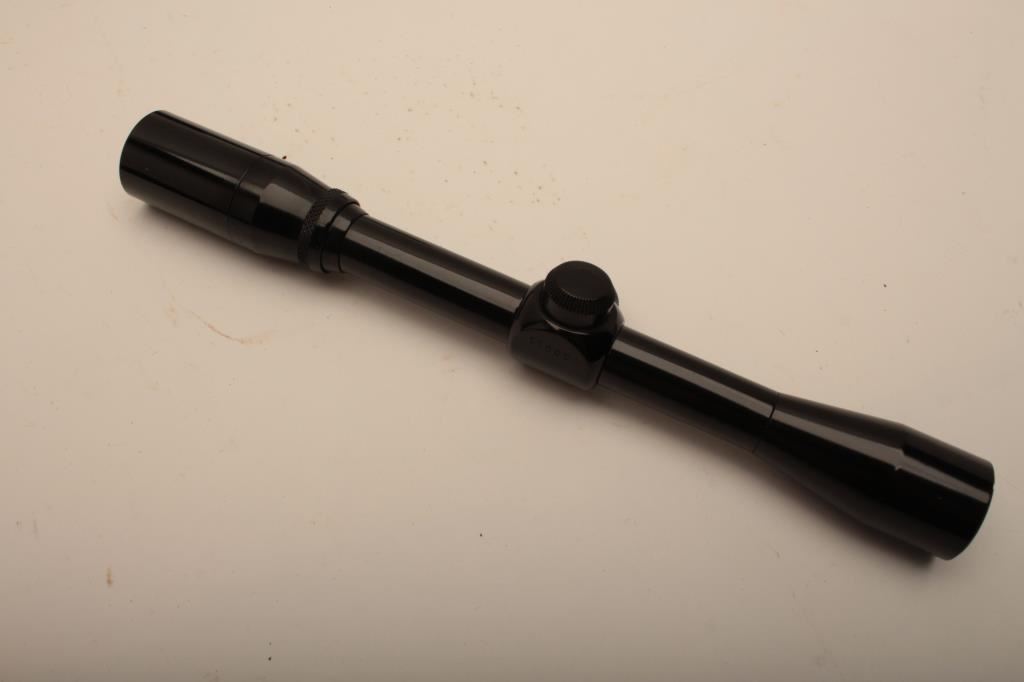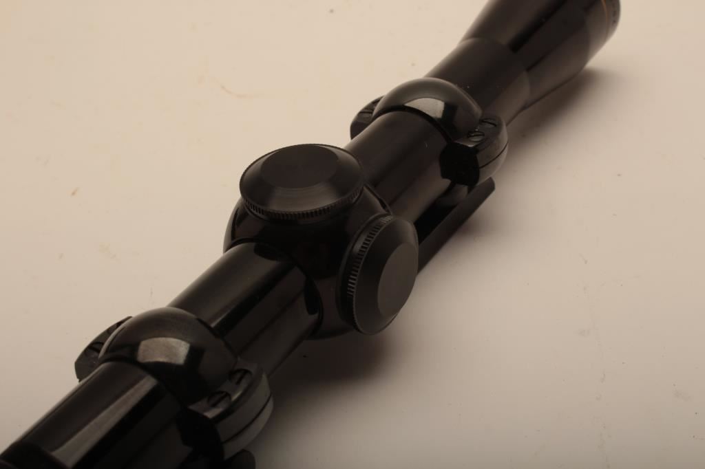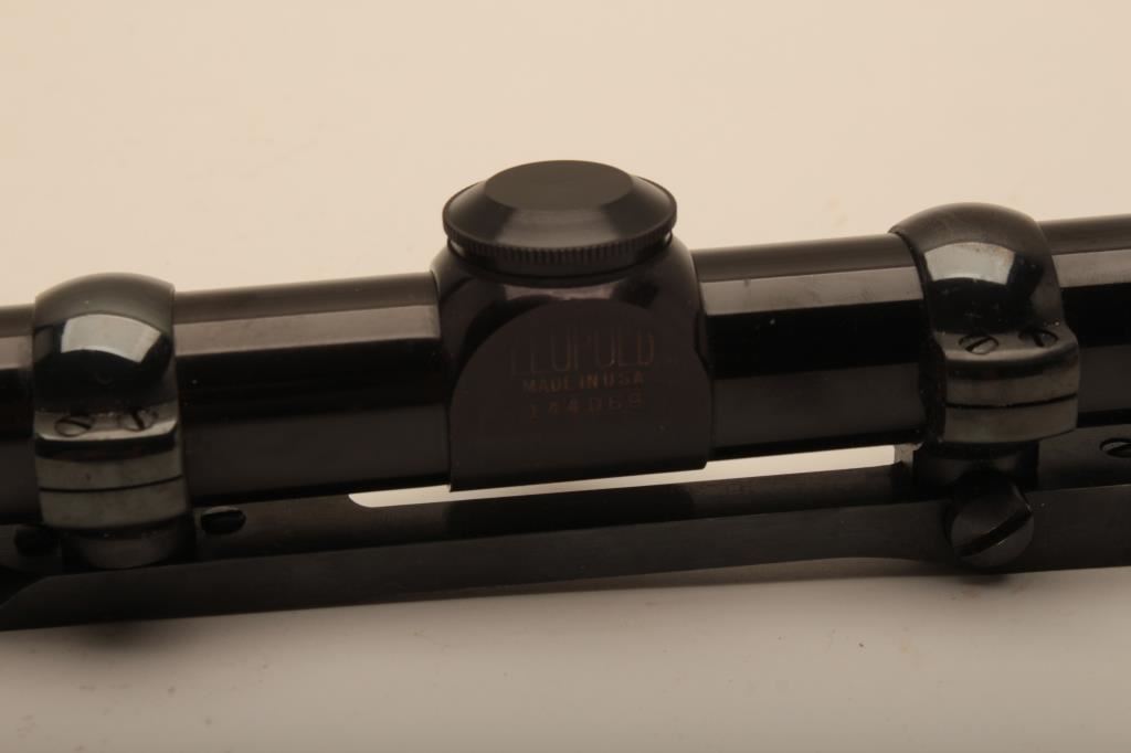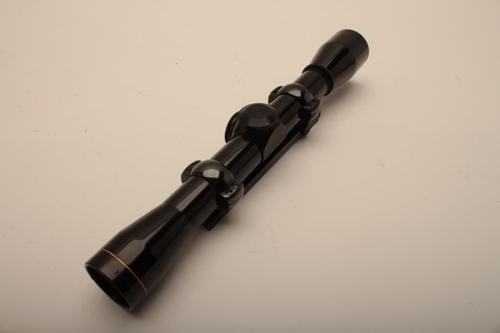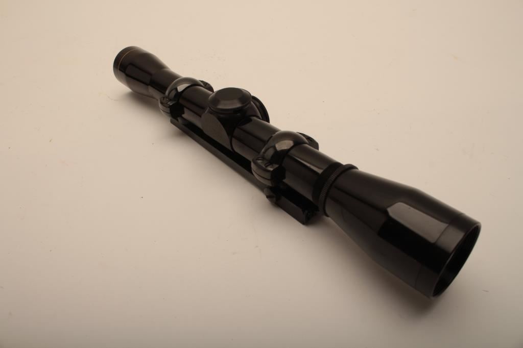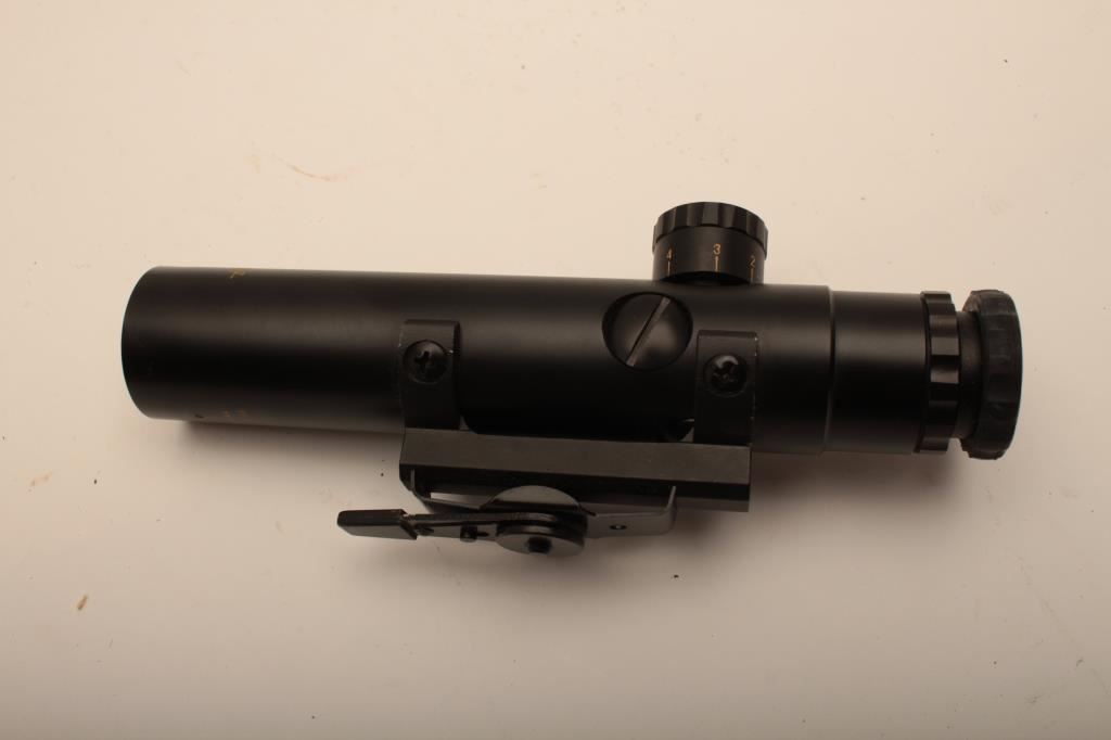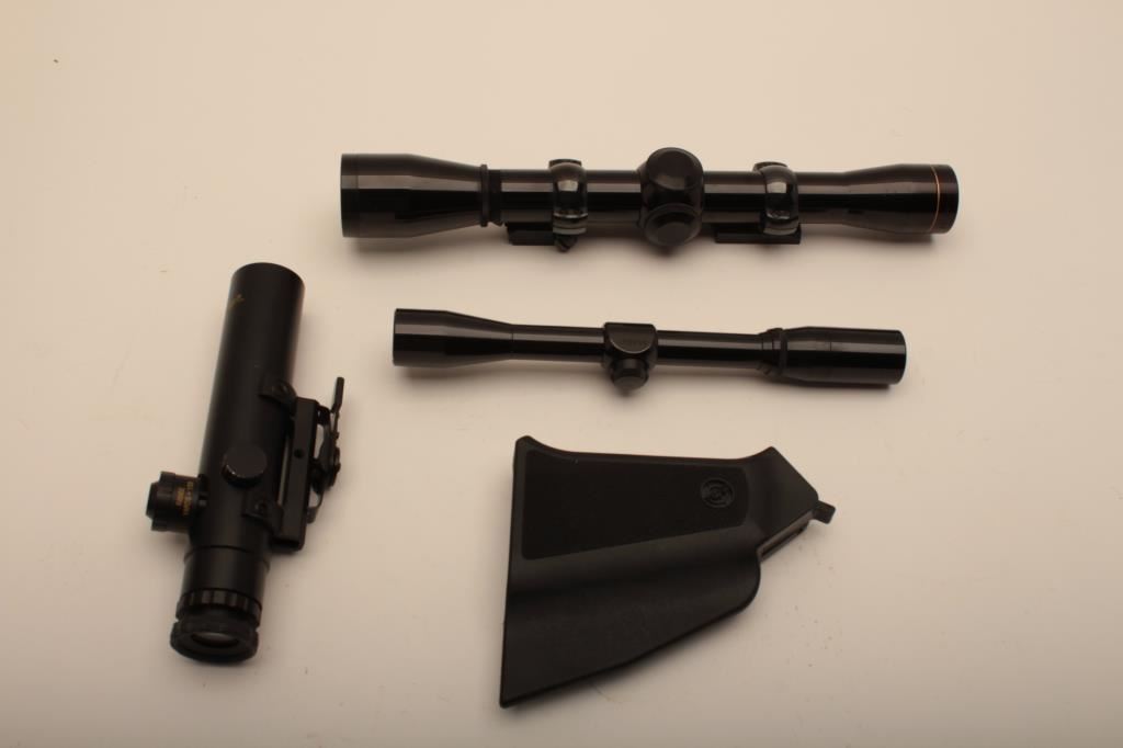 Lot of 3 scopes; Leupold M8 4x with base and rings, Burris LER - long eye relief 2x Mikro crosshair scope, and Norinco 4x20 scope with quick release mount. Also a Harris bipod and MMC "shark fin" adapter for an unknown rifle. Est. $100-200