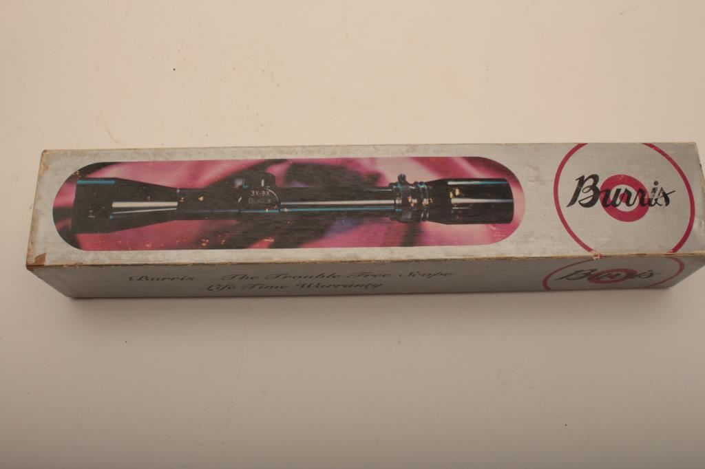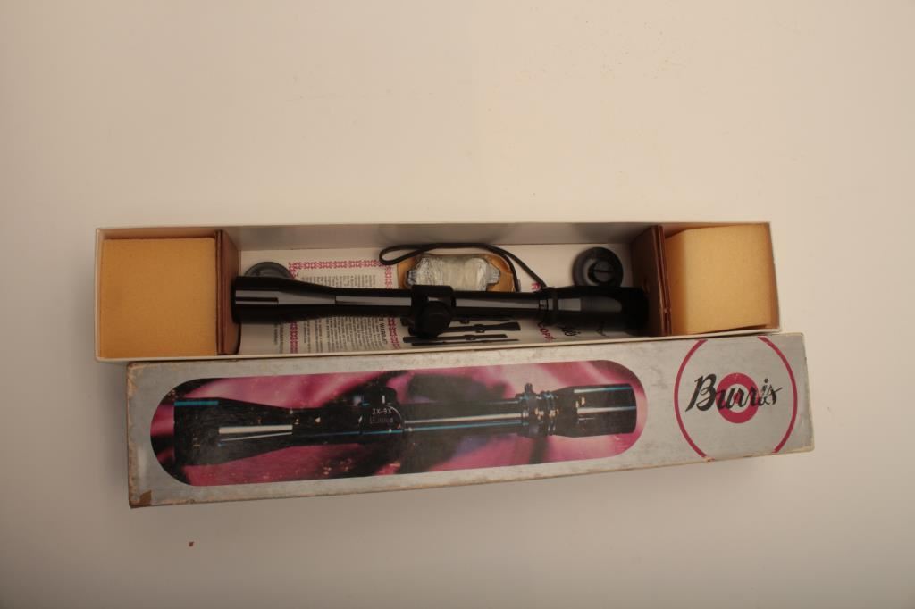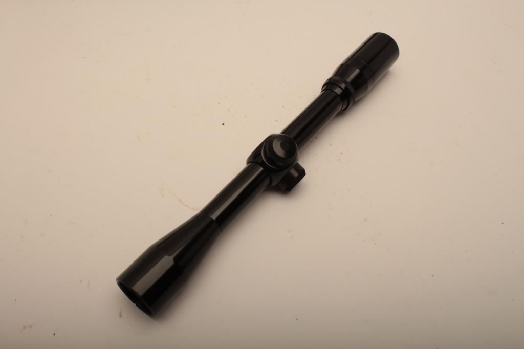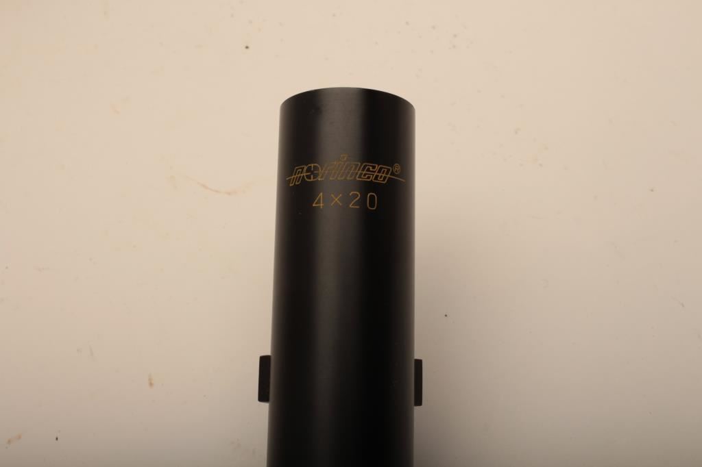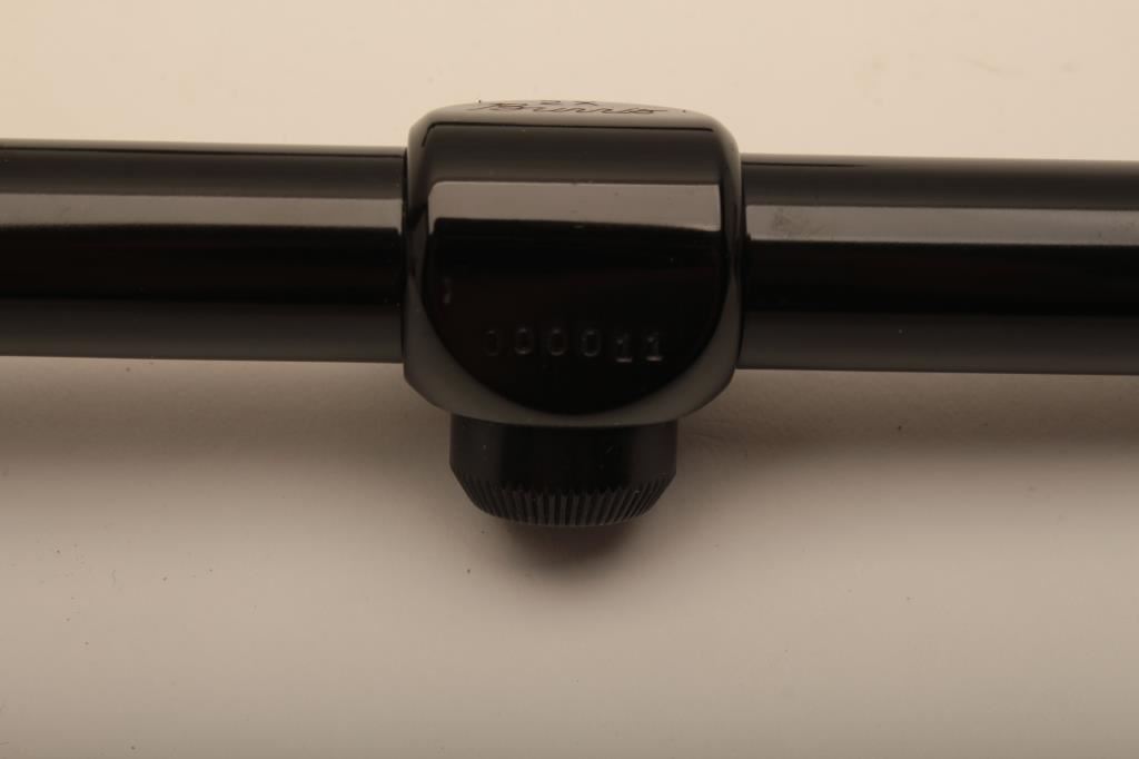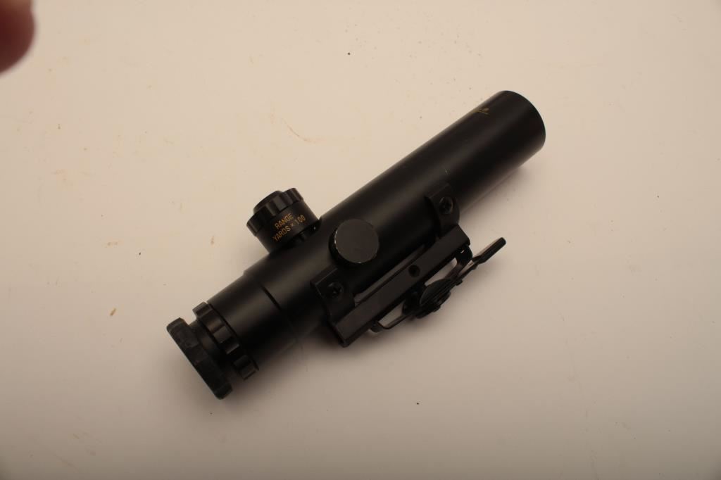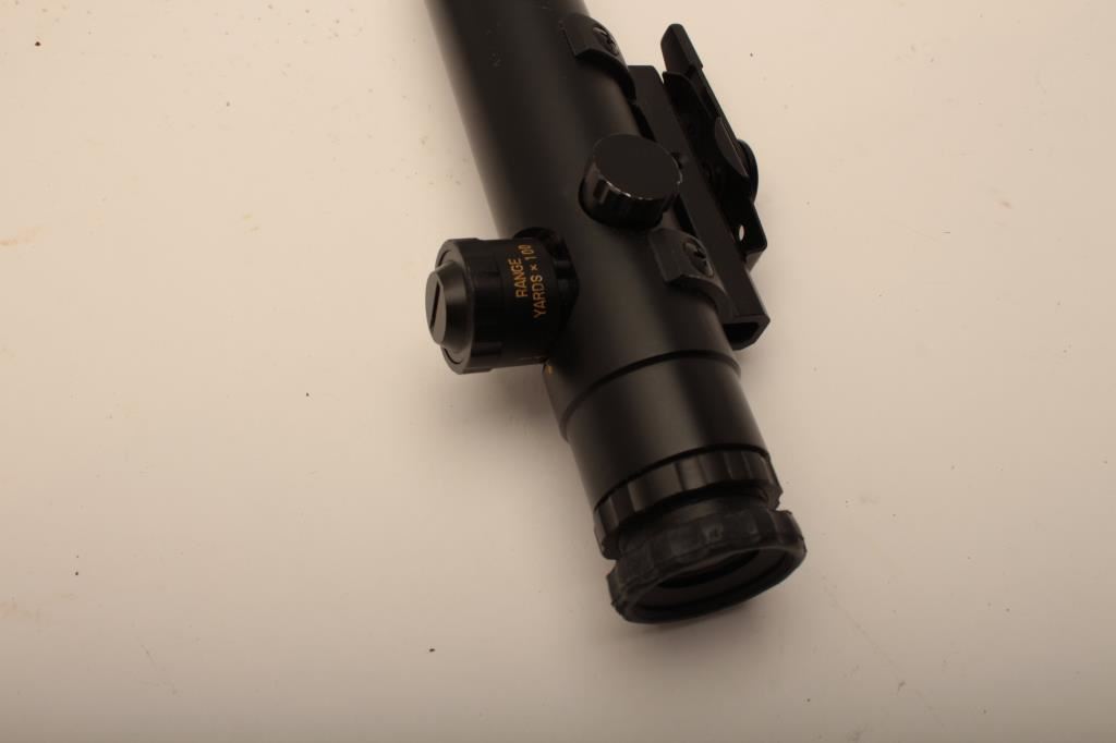 Lot of 3 scopes; Leupold M8 4x with base and rings, Burris LER - long eye relief 2x Mikro crosshair scope, and Norinco 4x20 scope with quick release mount. Also a Harris bipod and MMC "shark fin" adapter for an unknown rifle. Est. $100-200
