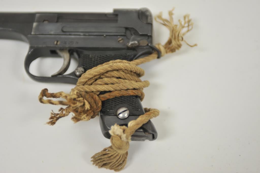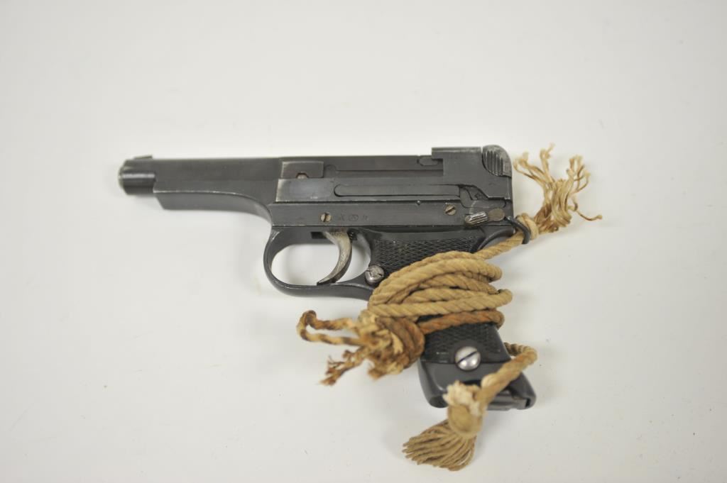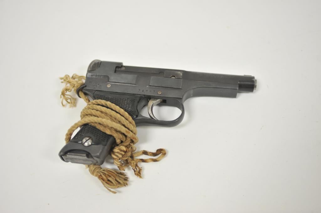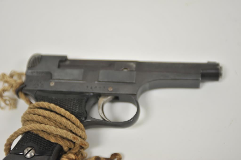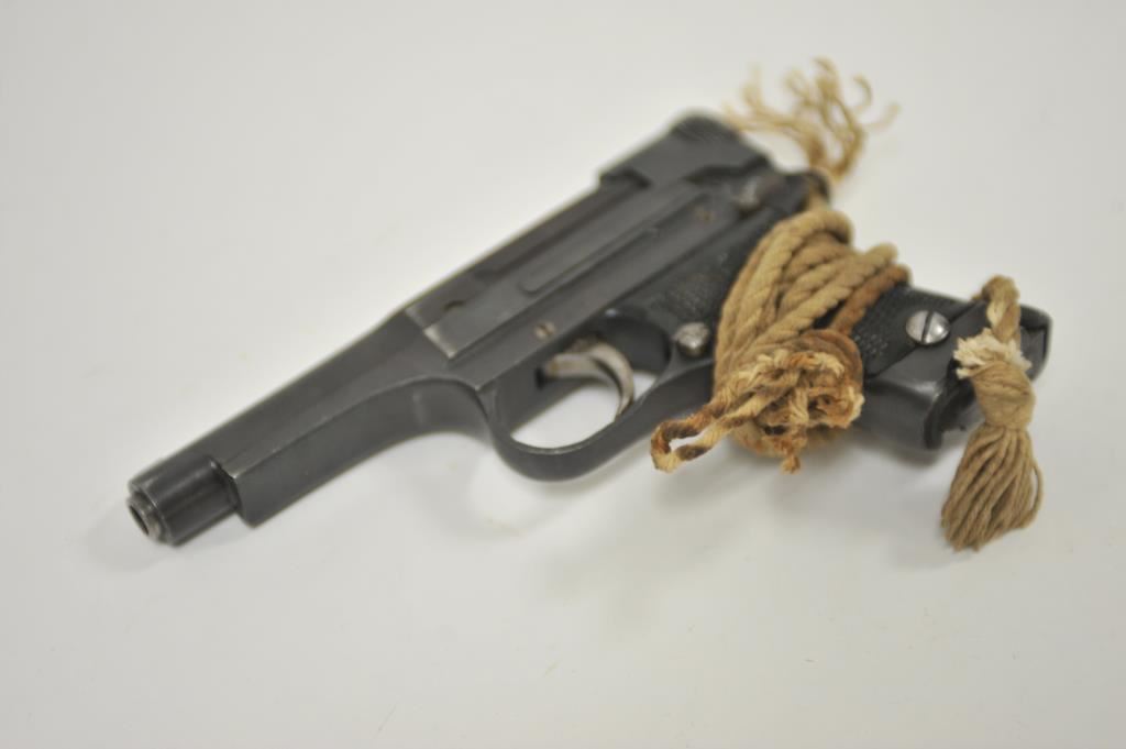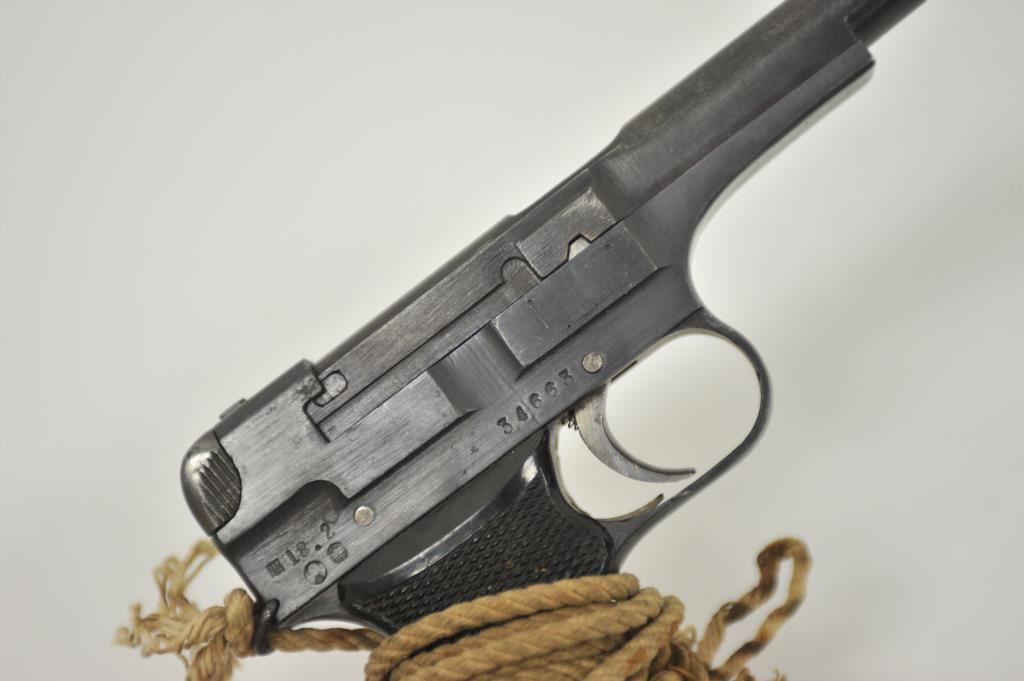 Japanese Nambu Type 94 semi-automatic pistol, 8mm caliber, 3.75” barrel, blued finish, checkered black plastic grips, S/N 34663; overall very good + condition displaying majority of military finish, very good + bore, crisp action, sharp markings, very good + grips with cord lanyard. (C&R/NO PPT). Est.: $300-$600.