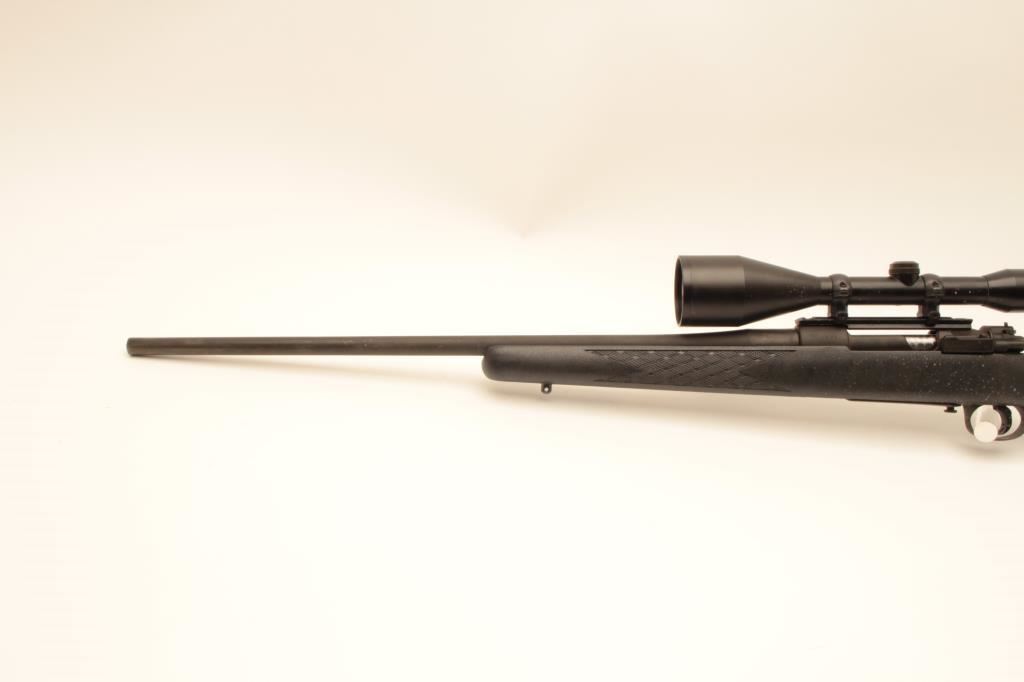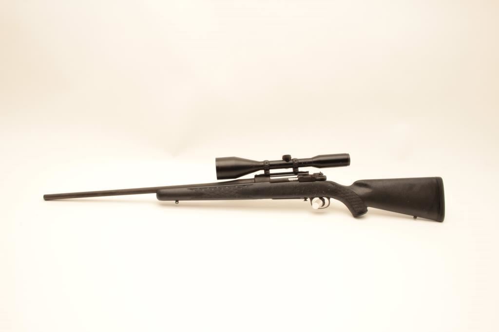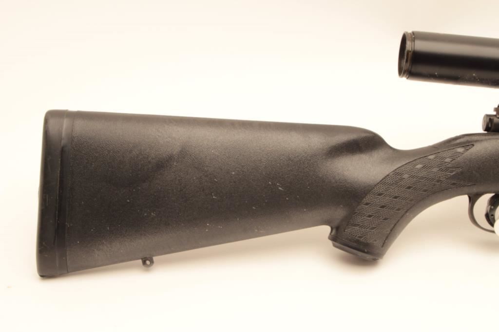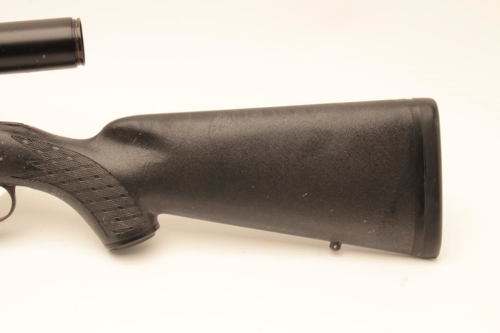 Sporterized Mauser Model 98 bolt action rifle, 6.5mm caliber, 24.5” barrel, mat black finish, checkered synthetic stock, S/N 4671, mounted with an 8 x 56 scope displaying good optics; gun is overall good as sporterized with a good bore, action, re-finish and very good replacement stock. (Modern/NO PPT). Est.: $150-$300.