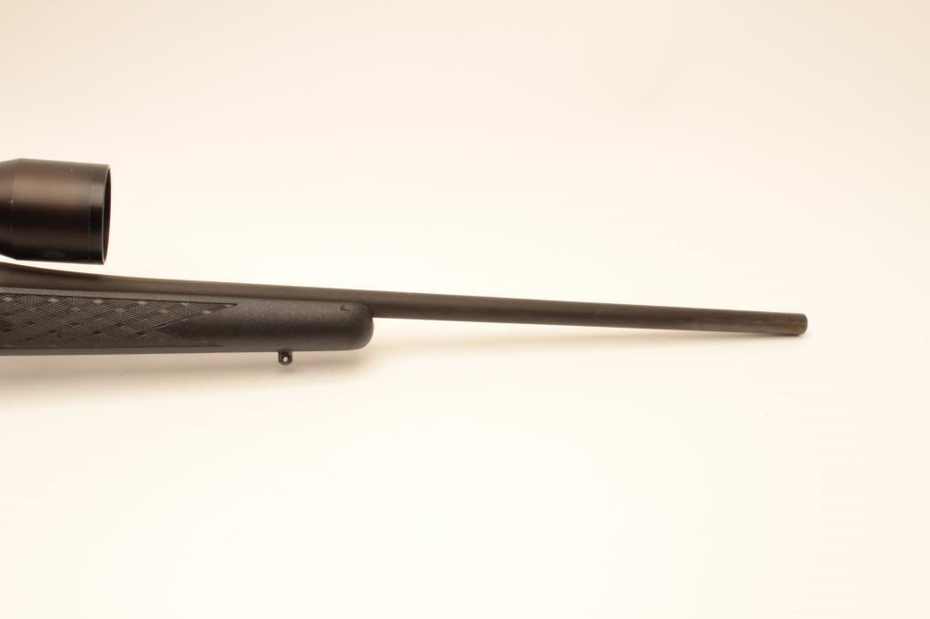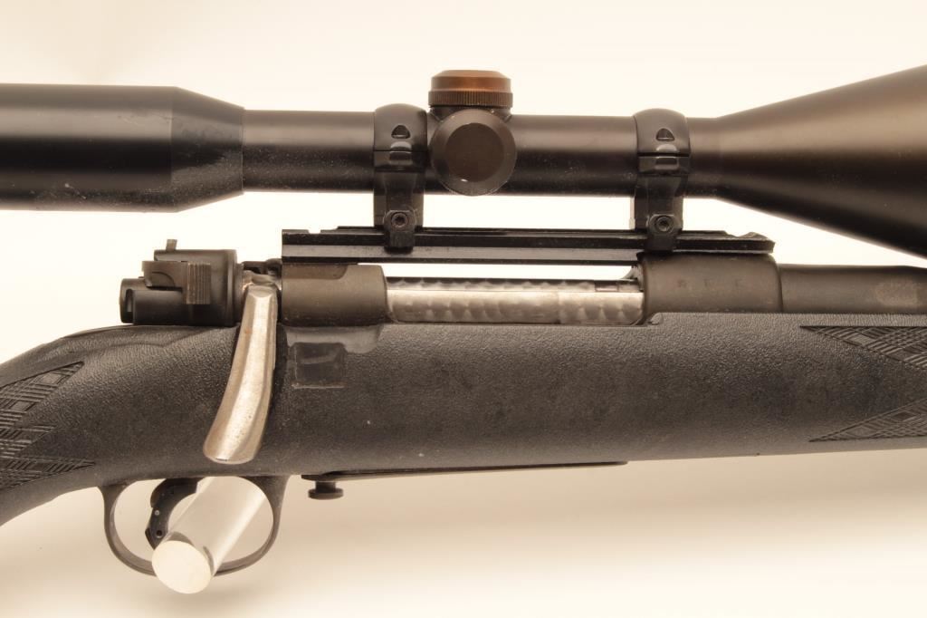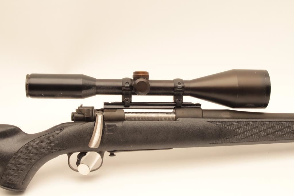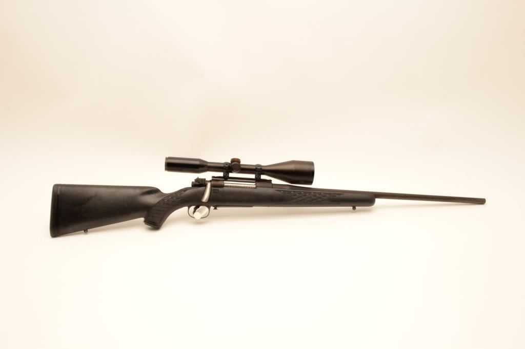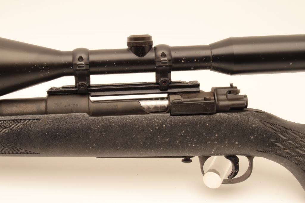 Sporterized Mauser Model 98 bolt action rifle, 6.5mm caliber, 24.5” barrel, mat black finish, checkered synthetic stock, S/N 4671, mounted with an 8 x 56 scope displaying good optics; gun is overall good as sporterized with a good bore, action, re-finish and very good replacement stock. (Modern/NO PPT). Est.: $150-$300.