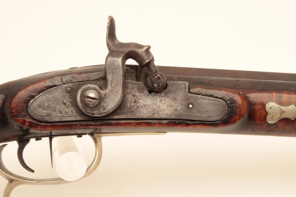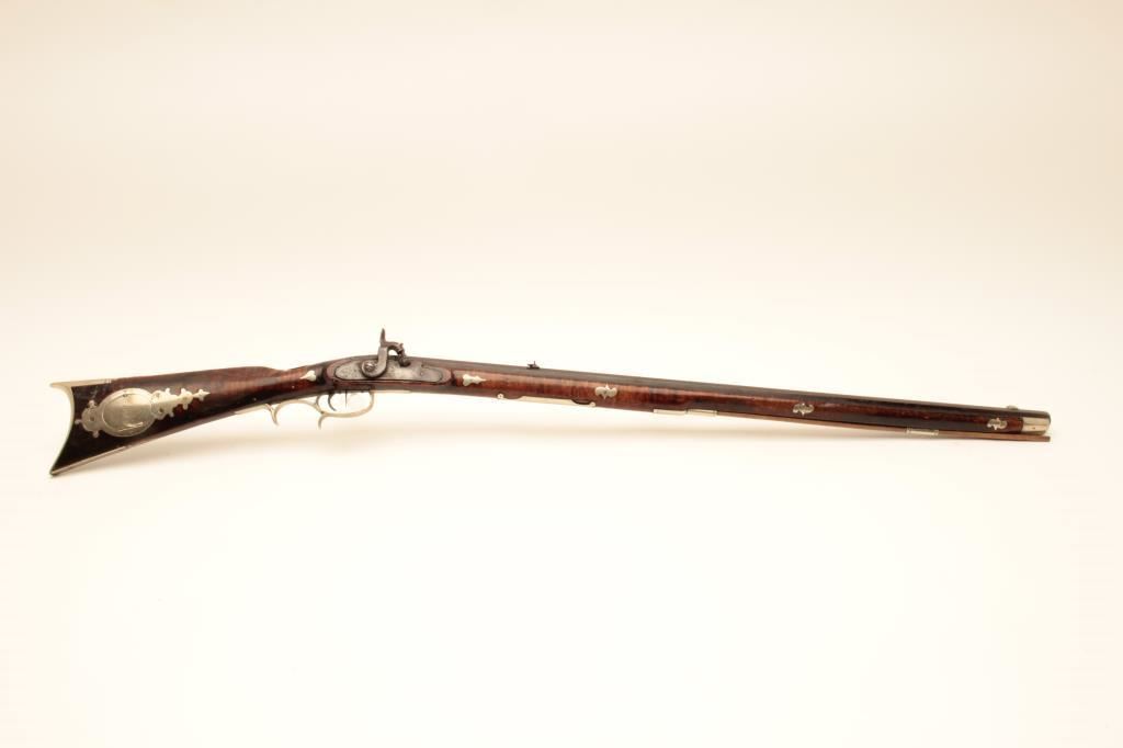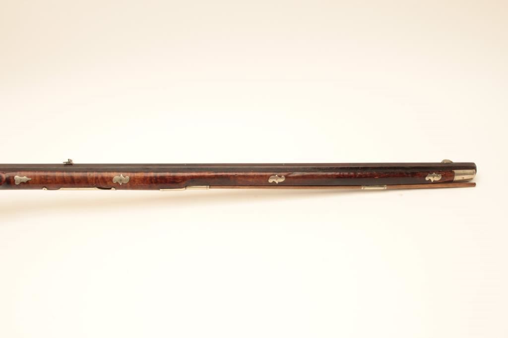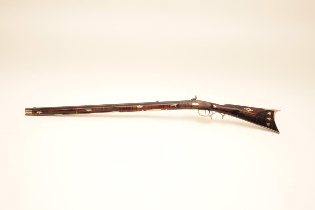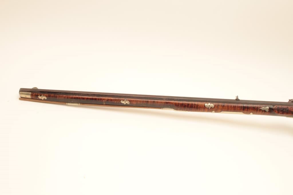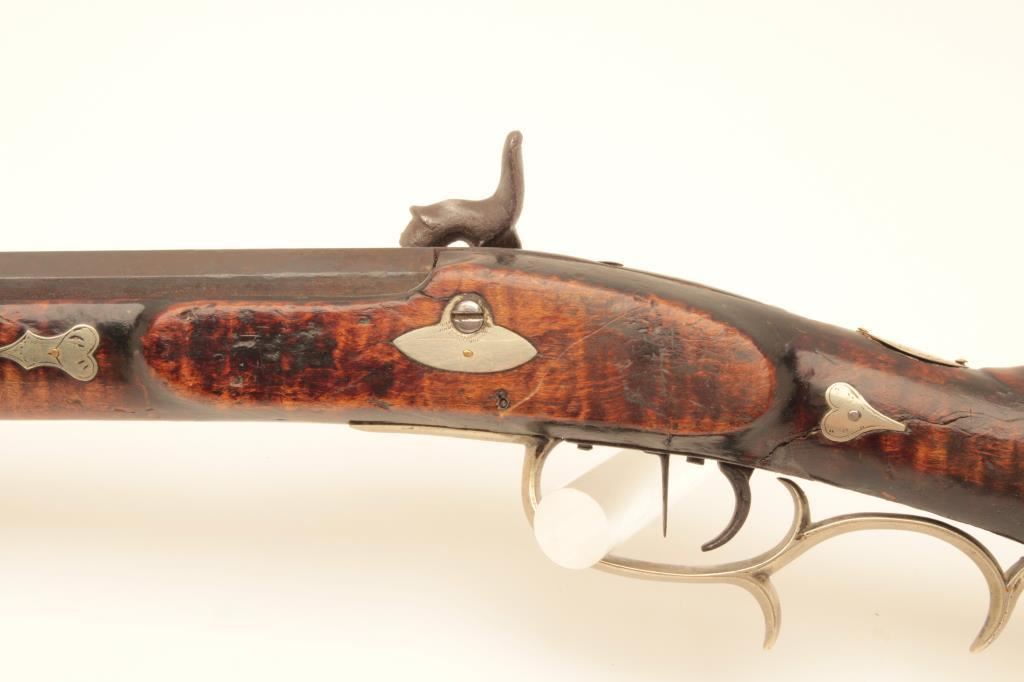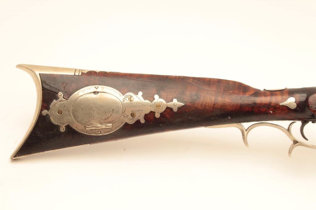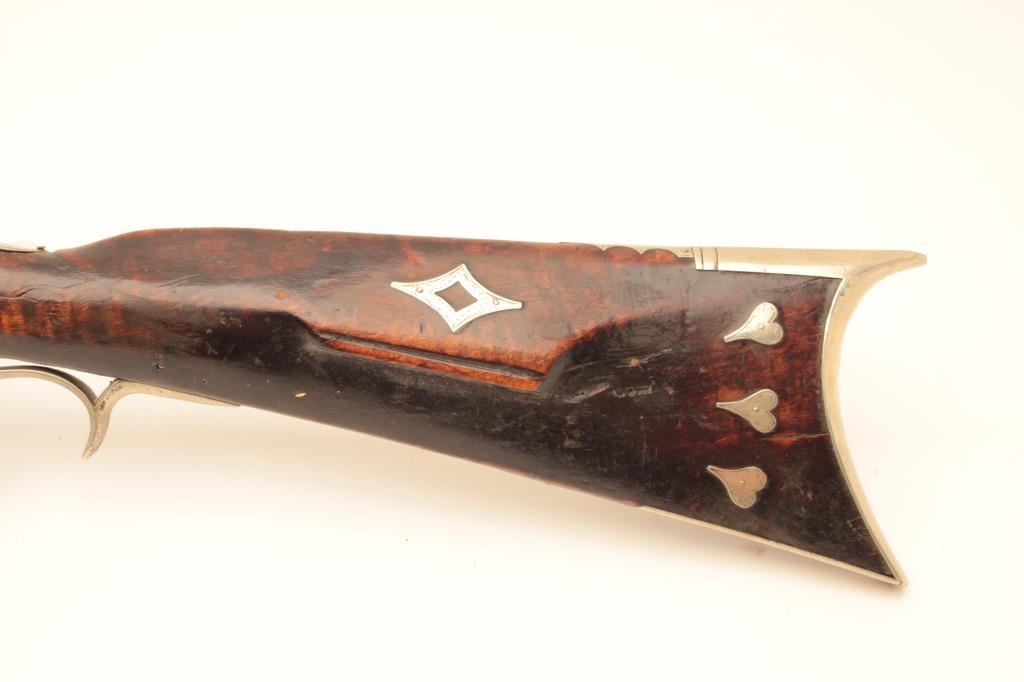 Full stock percussion Kentucky style rifle (ca. mid-1800’s), .38 caliber, 31” octagon barrel, double set triggers (working at time of description), engraved silver patch box with no less than 19 pierced engraved silver inlays in stock, good action, old repair to crack at wrist of butt stock and small old crack at front right side of fore stock near muzzle; nice graining to wood. (Antique). Est.: $400-$800.