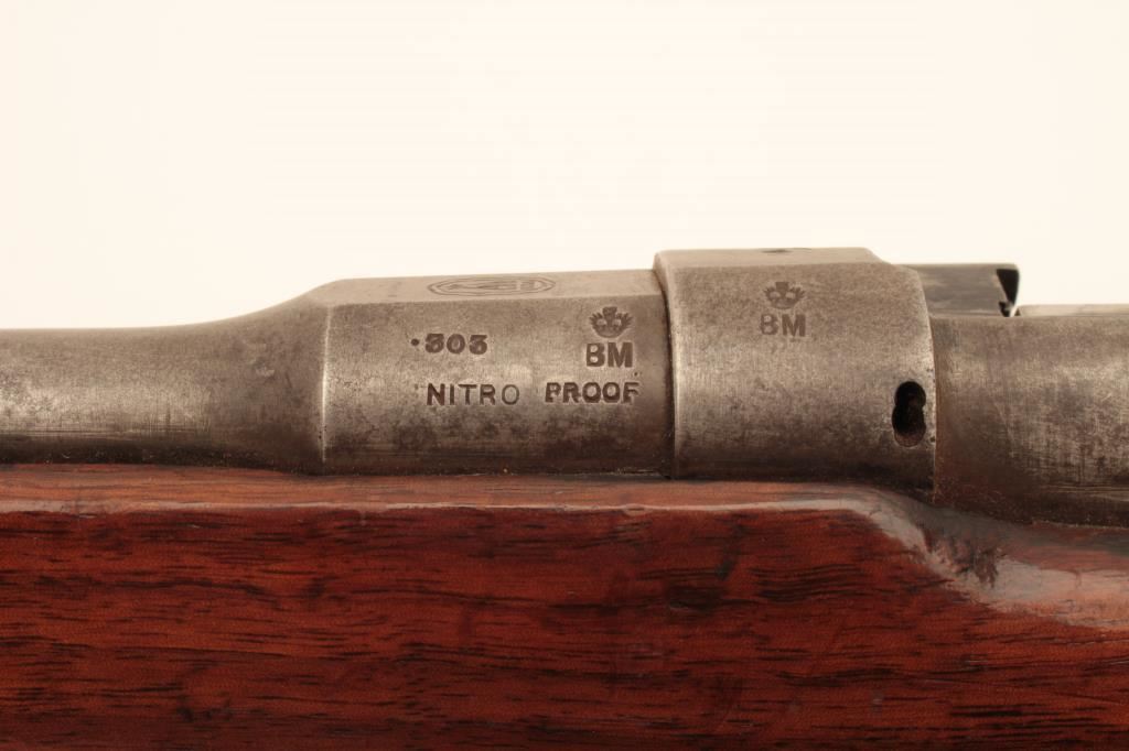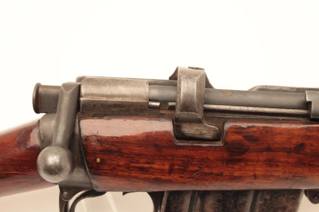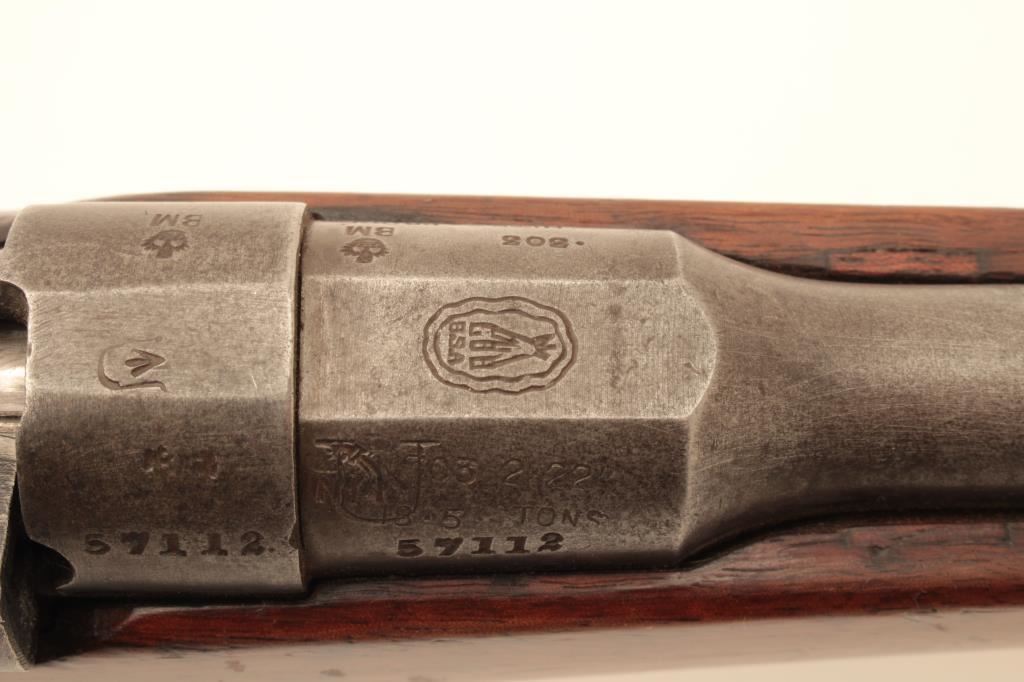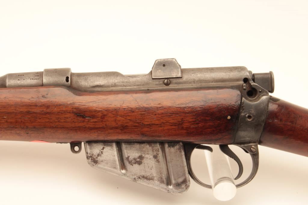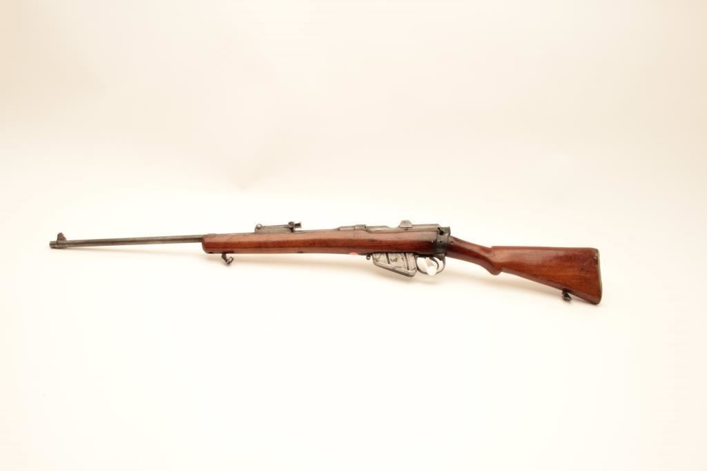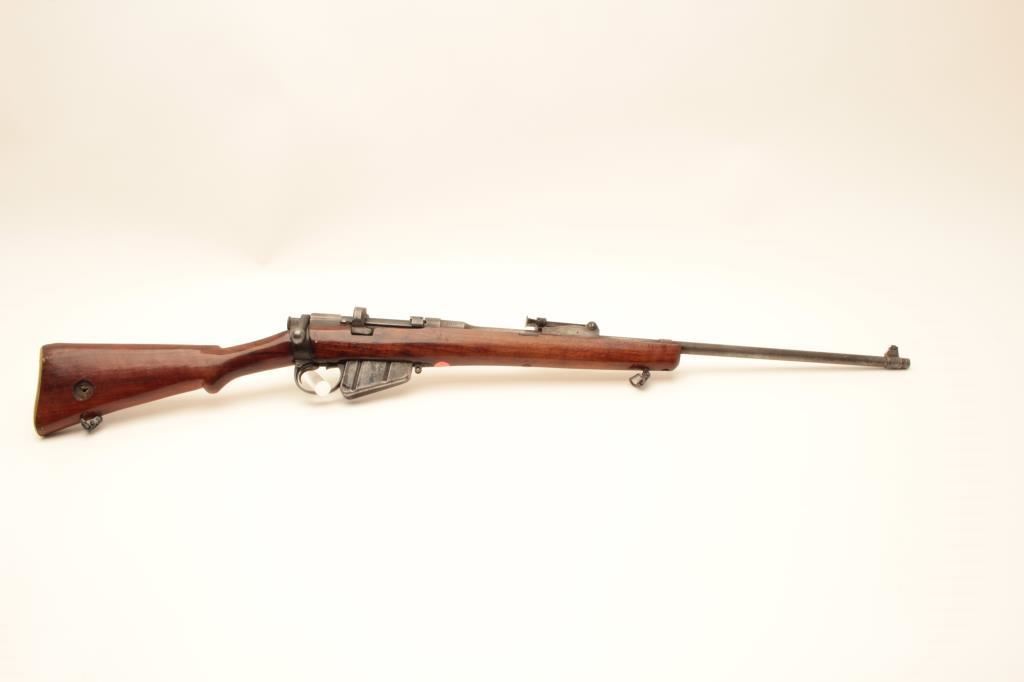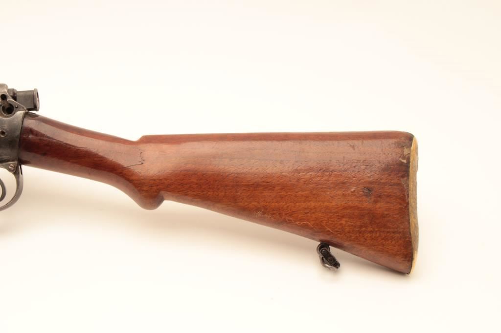 Sporterized Enfield bolt action rifle by B.S.A. Co., 1906 Model, .303 caliber, 25” barrel, blued finish, wood stock, quick release sling swivels, S/N 57112; overall good condition as sporterized and refinished; good bore, action and markings; good re-finished and reworked wood stock. (C&R/NO PPT). Est.: $150-$300.