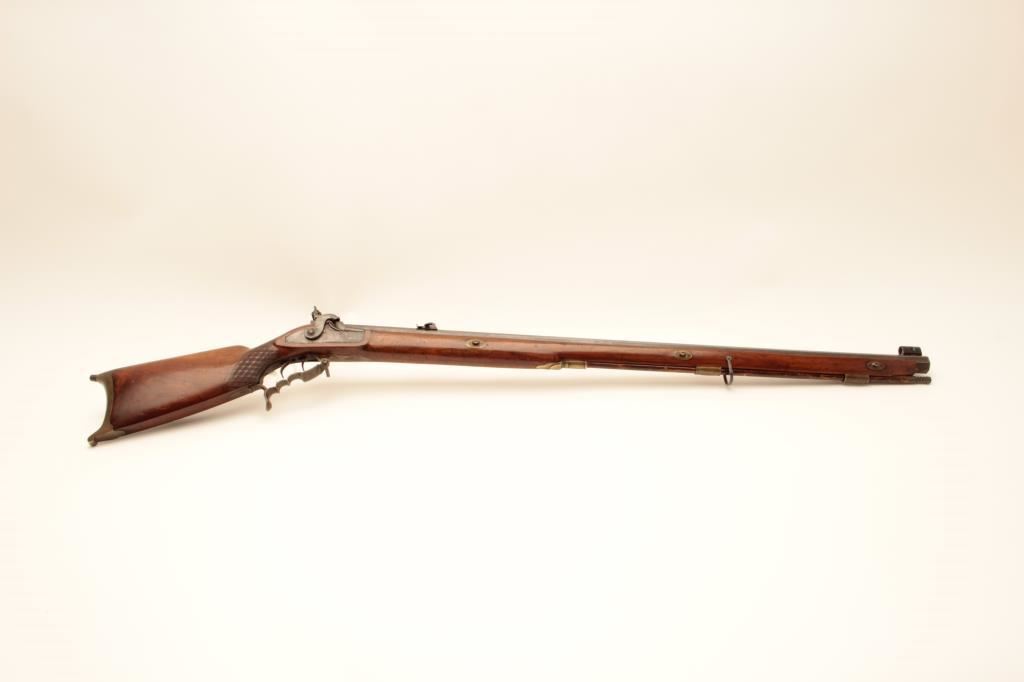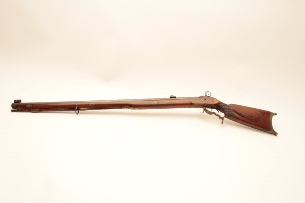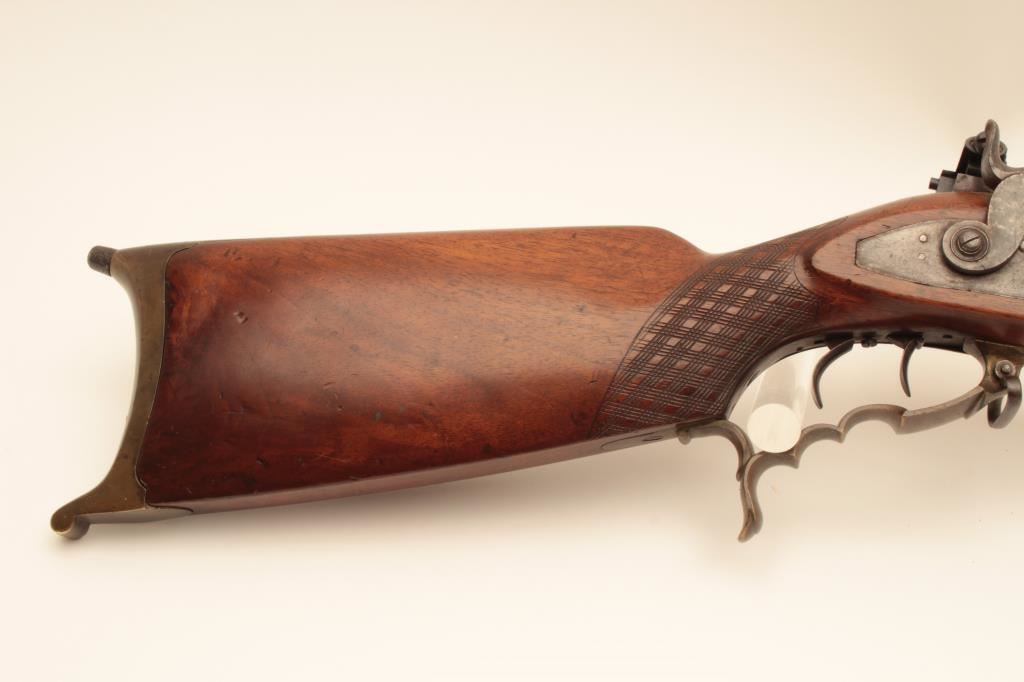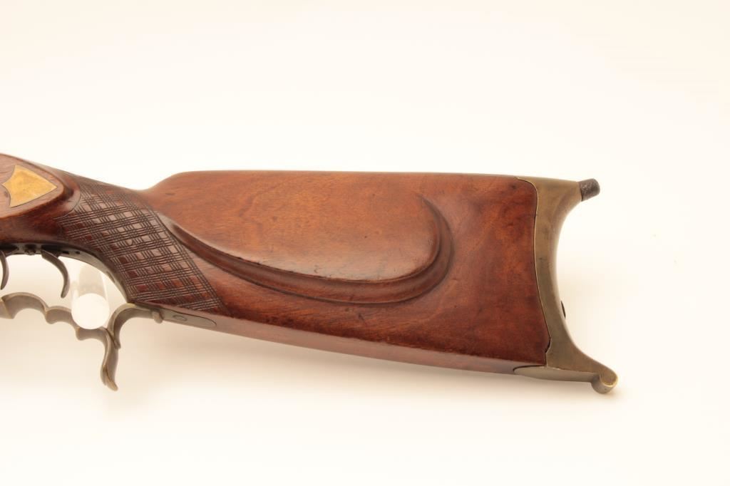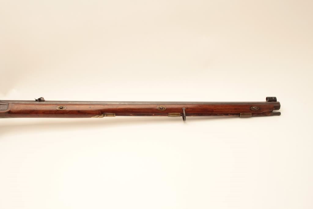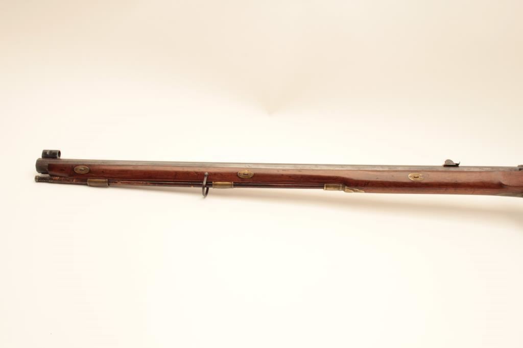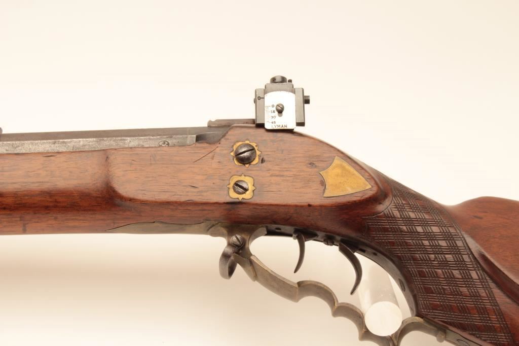 Heavy barrel European percussion target rifle, approximately .70 caliber, double set triggers (working at time of description), 37” octagon barrel, brown patina to metal surfaces, brass mounts and butt plate, modern Lyman adjustable rear tang sight and modern hooded front sight; overall good condition; good action, undecipherable proof at breech on top flat of barrel, full length checkered wood stock has 3 barrel retaining keys and is good overall. (Antique). Est.: $800-$1,600.