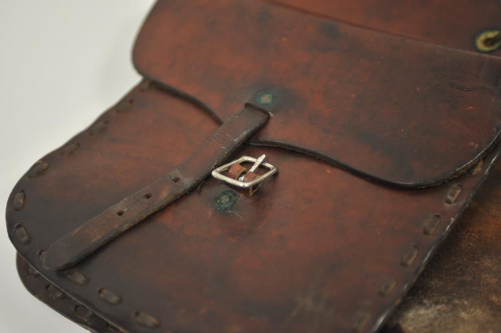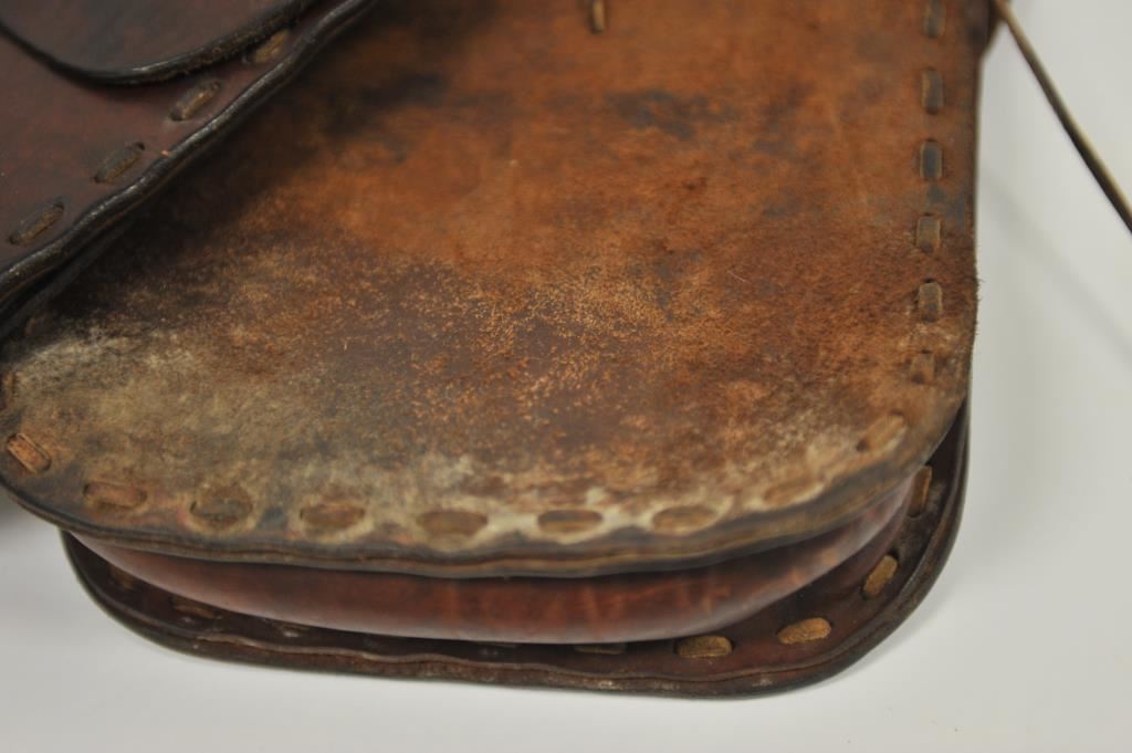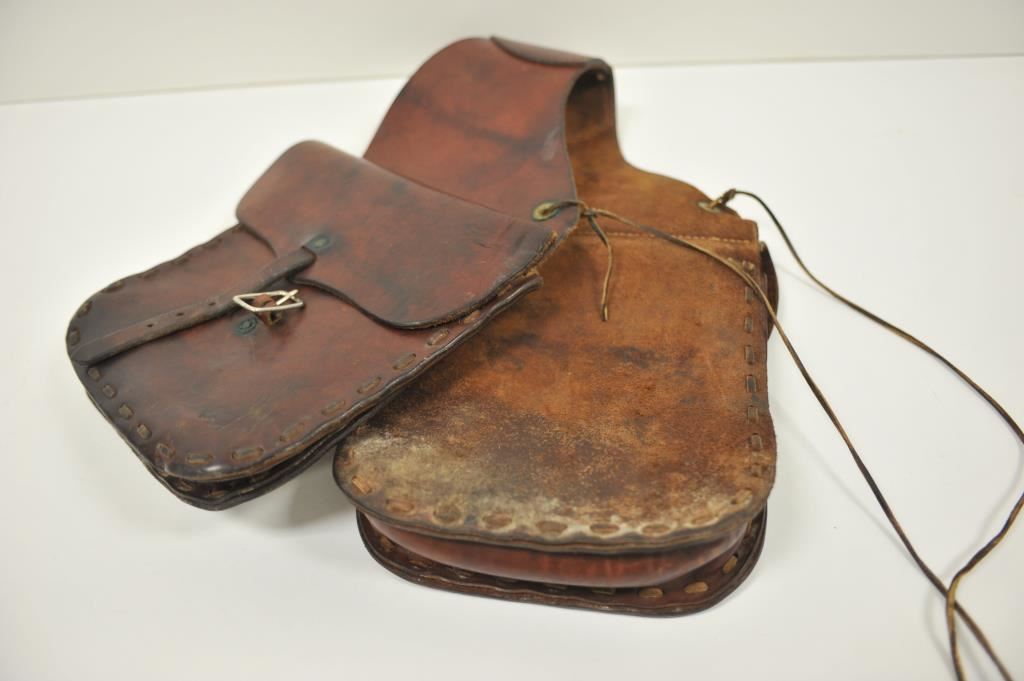 Pair of leather saddlebags in overall good condition; unmarked. Est.: $125-$175.