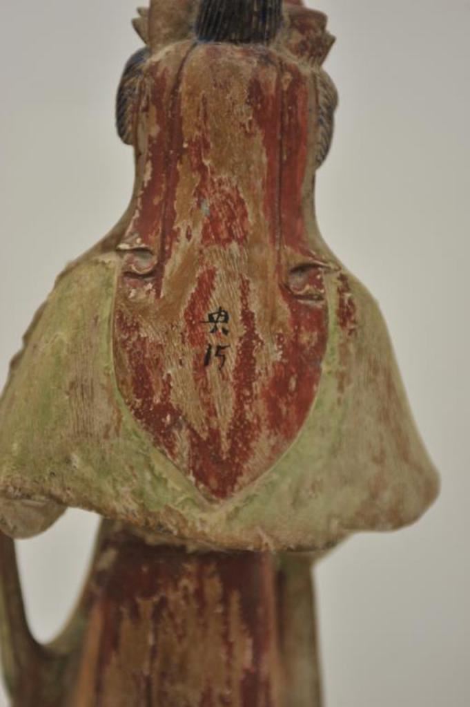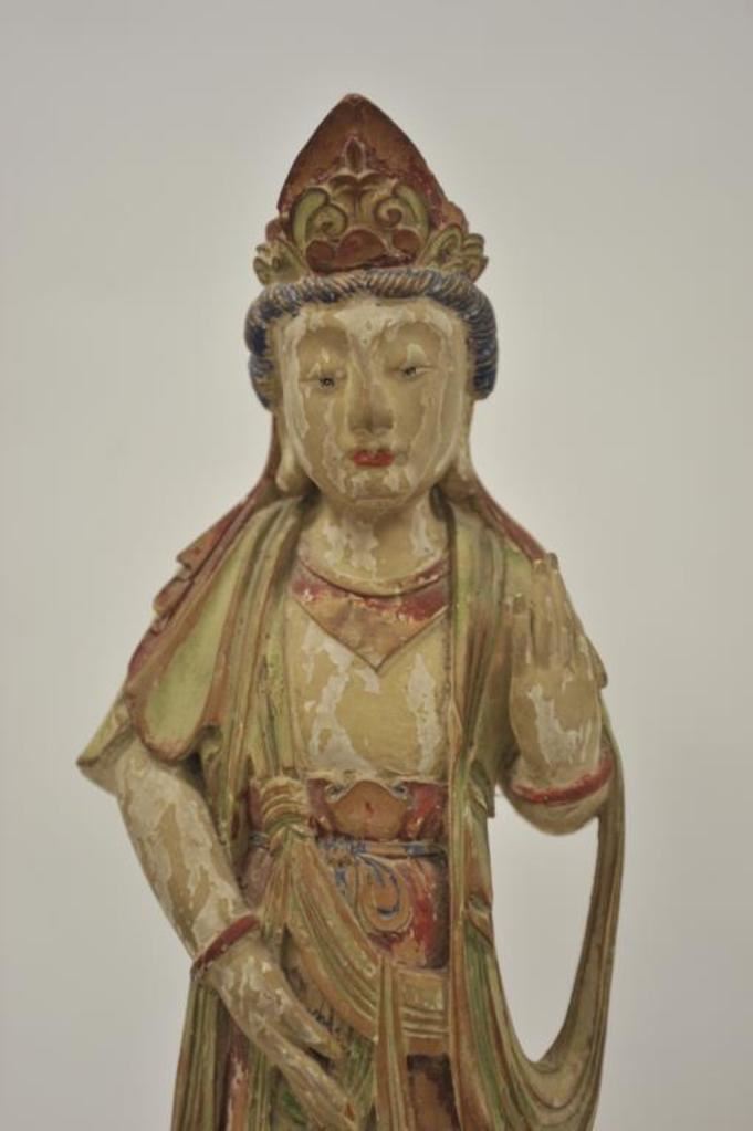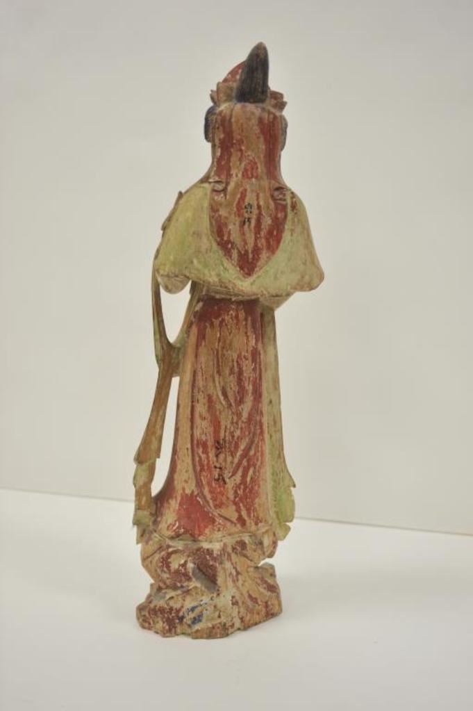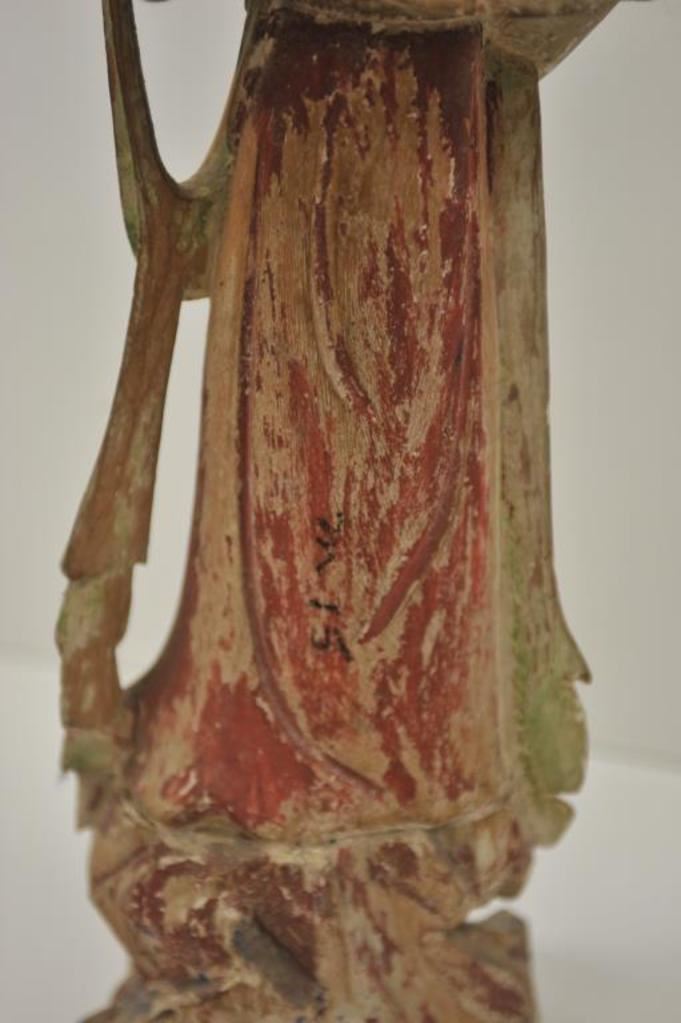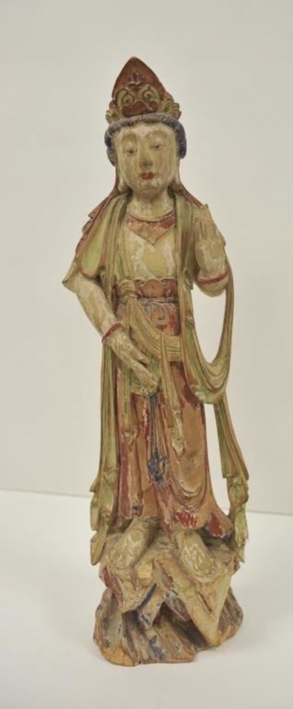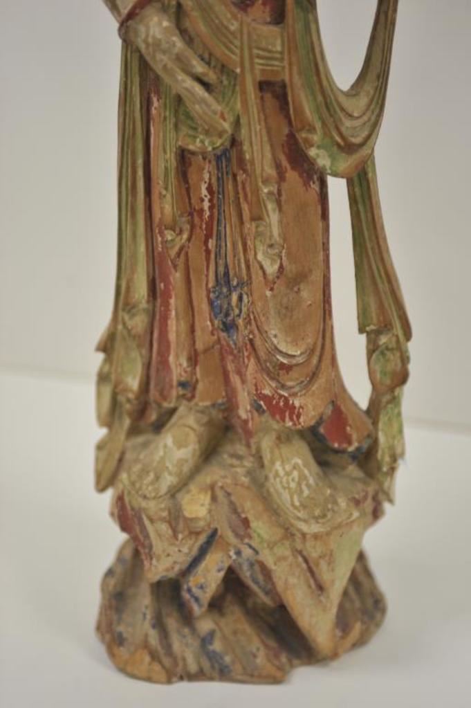 Large carved and painted possibly Chinese wood goddess approximately 26” in height, shows age and areas of old paint remaining; finely accomplished; appears to be old and from an estate. Est.: $150-$300.