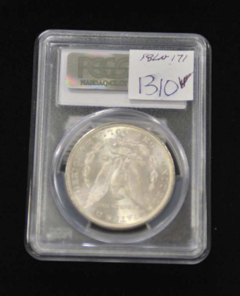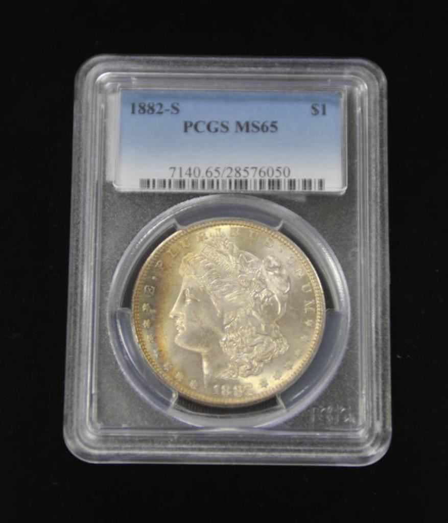 U.S. Silver Dollar dated 1882-S; PCGS graded MS65 in holder; some edge toning to left rim area. Est.: $75-$150.