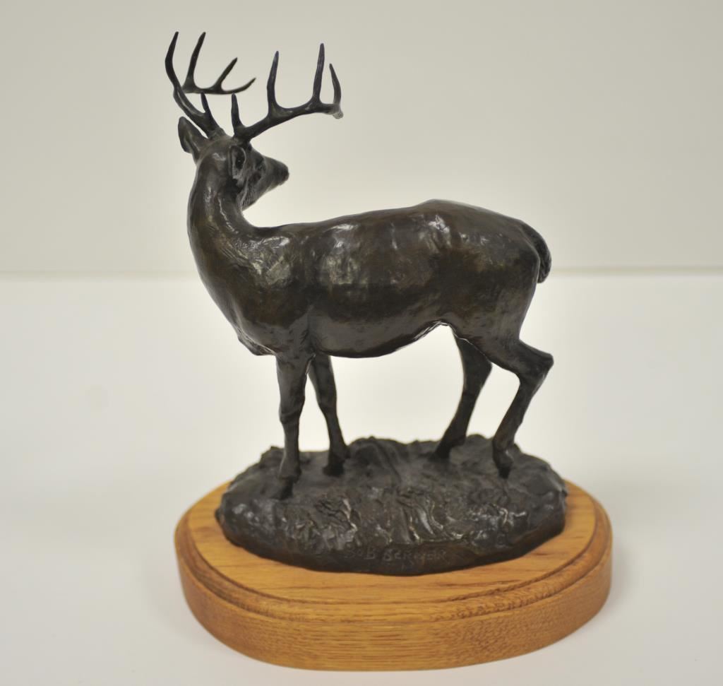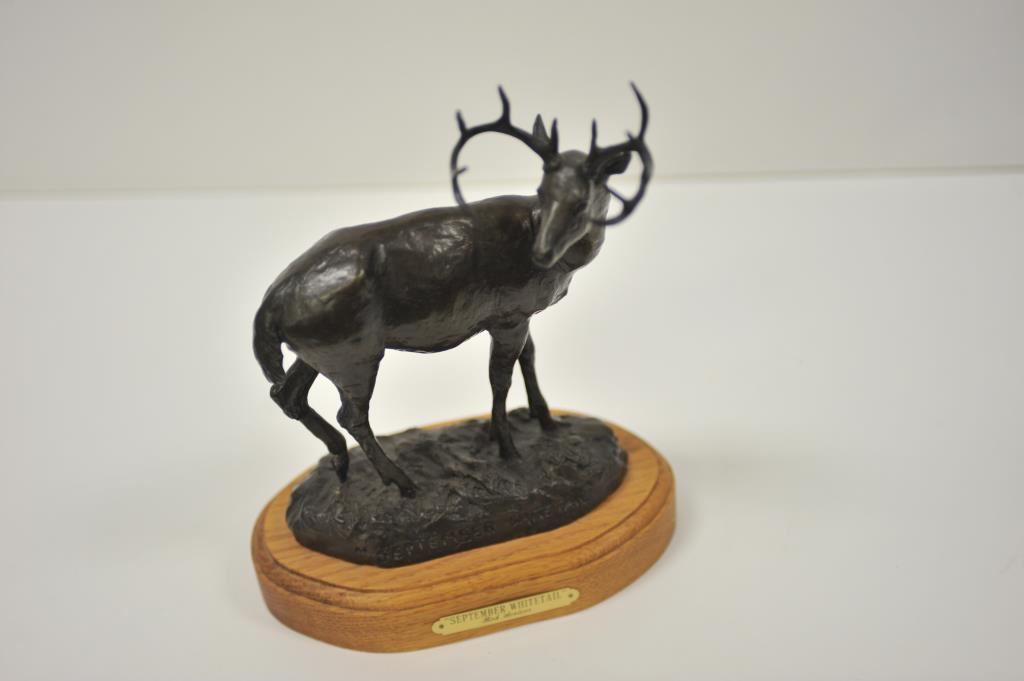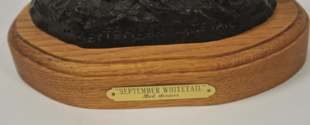 Limited edition bronze on wood base entitled “September Whitetail” (72/250) by Bob Scriver (1987); approximately 12” in height and 9” long including base; great proportions and patina. Est.: $400-$800.
