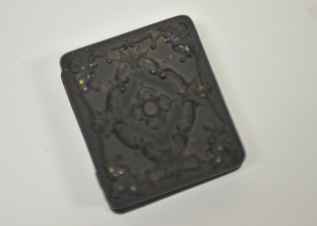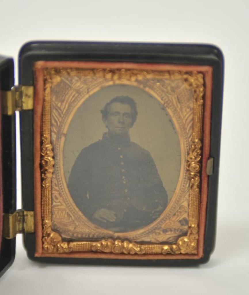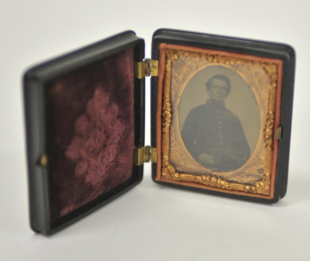 Tintype of Civil War soldier in uniform holding kepi in fancy gutta percha case; approximately 3” x 2.5” overall and in good condition. Est.: $150-$300.