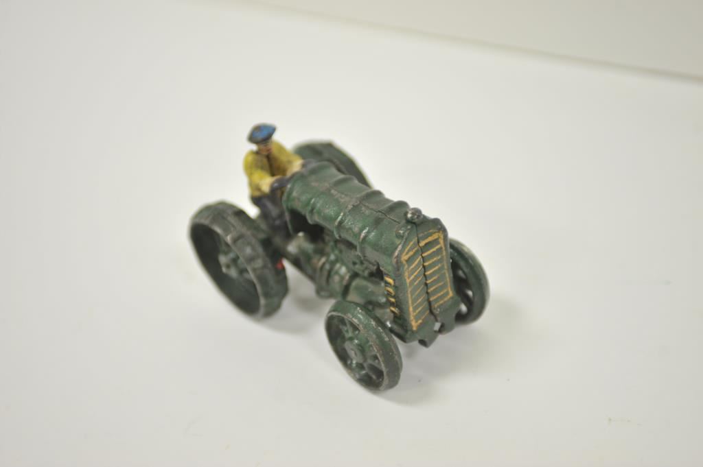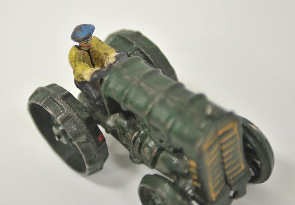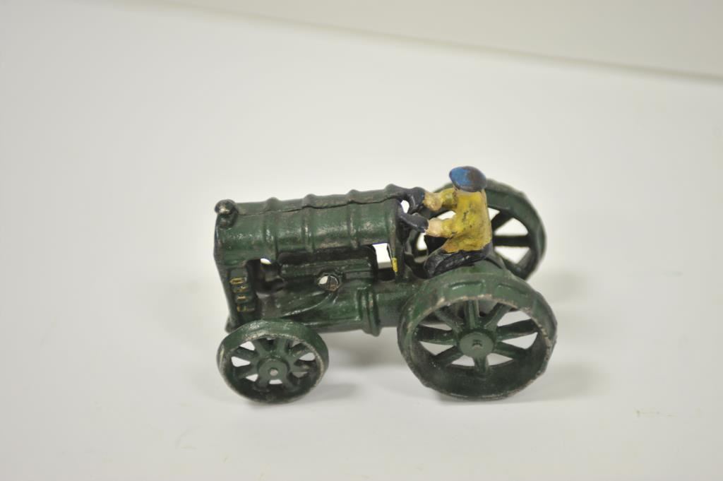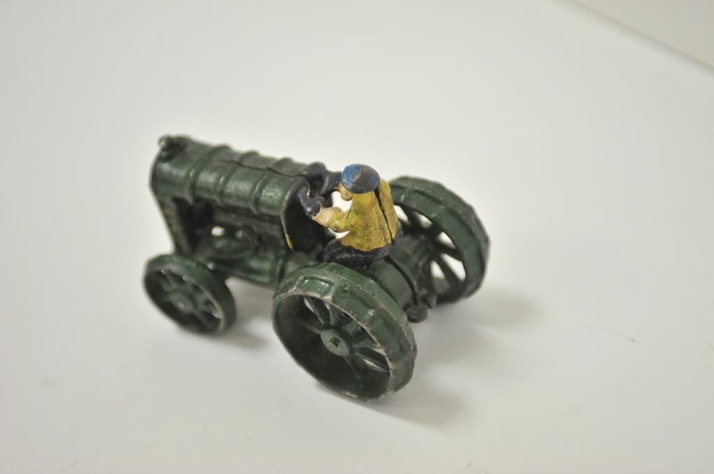 Toy metal tractor and driver, approximately 5” long, 3” wide and 3” in height; majority of original paint remaining. Est.: $50-$75.