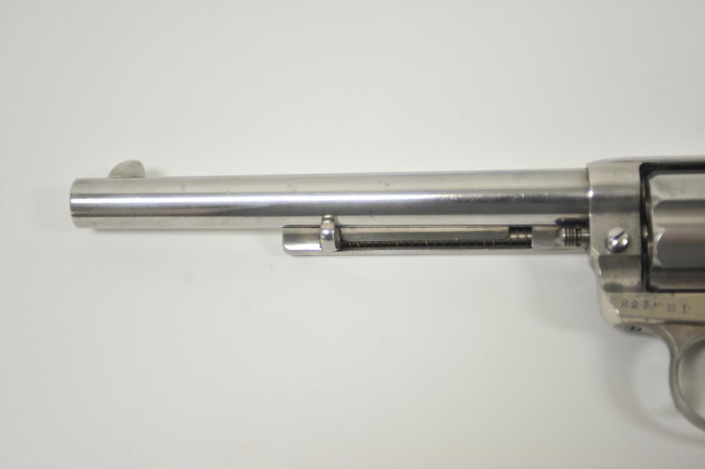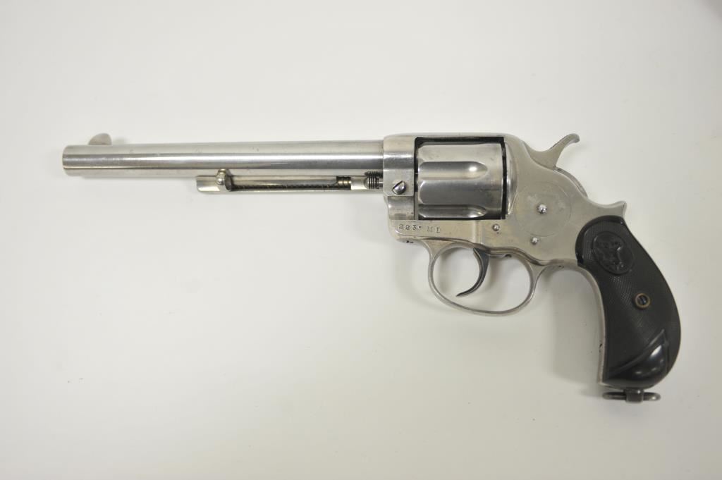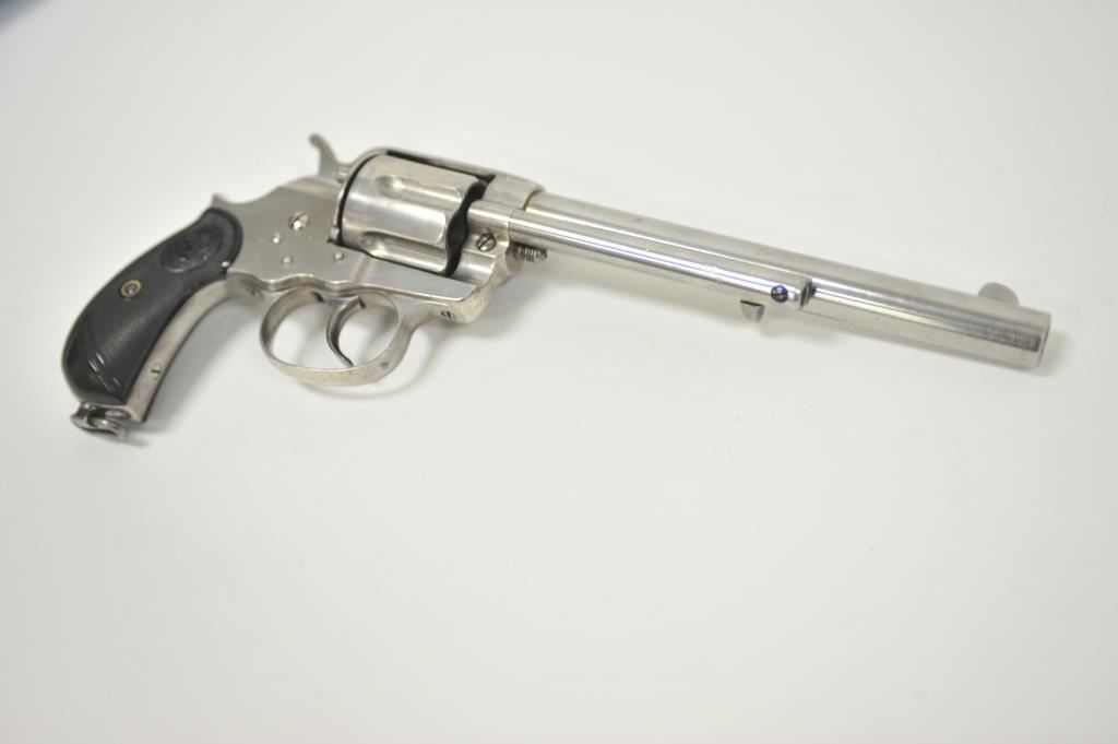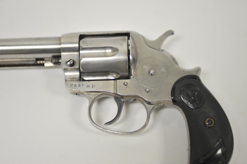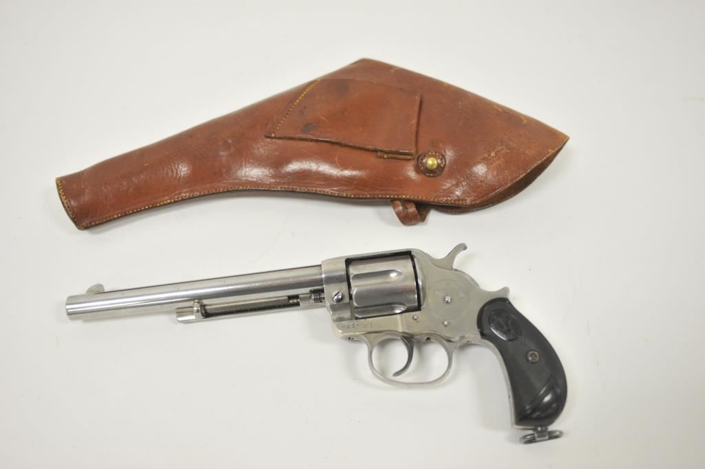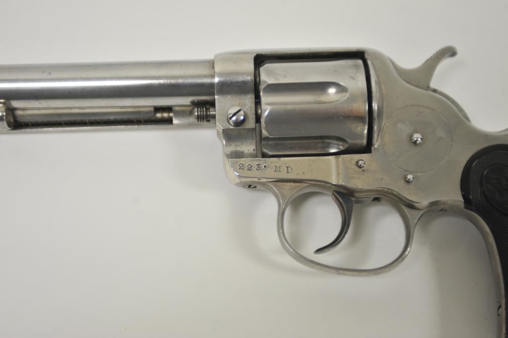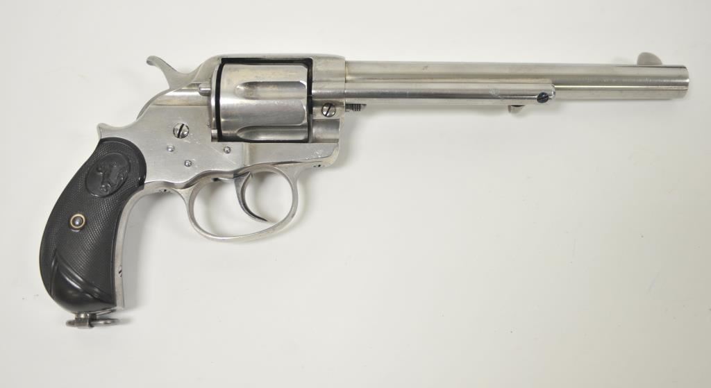 Canadian-marked Colt Model 1878 DA revolver, .45 caliber, 7.5” barrel, bright metal surfaces, checkered hard rubber grips, lanyard ring, S/N 14725 with additional stamping on left side of frame above front area of trigger guard “223 . MD” with leather flap holster; gun is in overall good to very good condition showing an old light cleaning to metal surfaces, good bore, action, markings and grips; holster is very good overall and with an interesting penciling on inside of flap “E.A.G./VIII C.M.R.” (Antique). Est.: $2,500-$5,000.