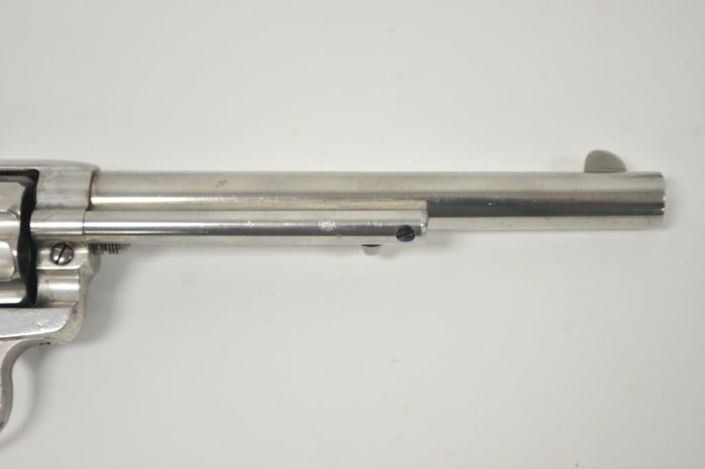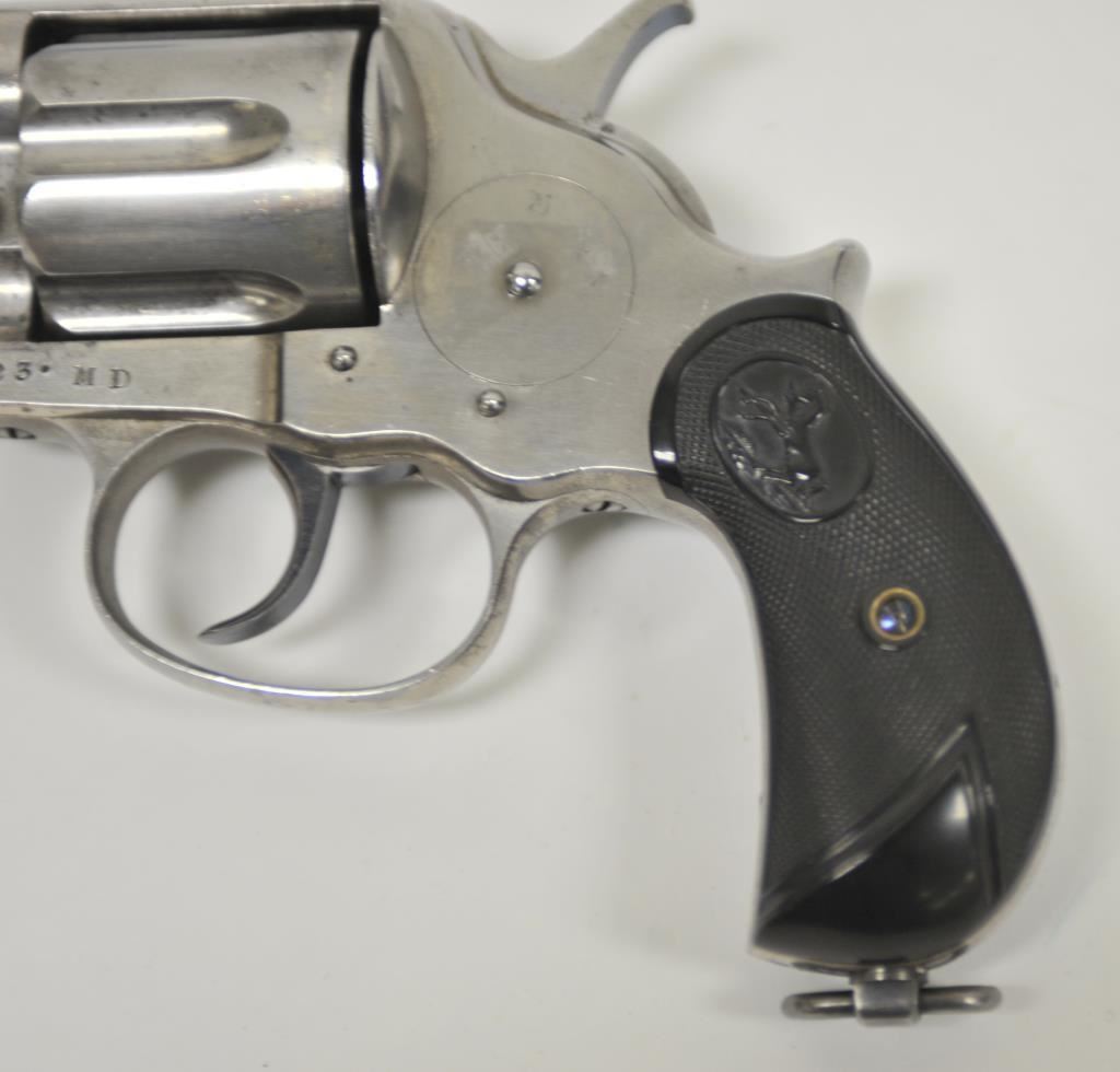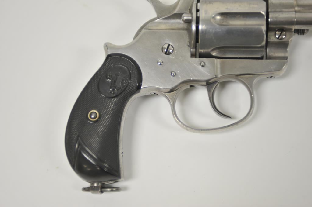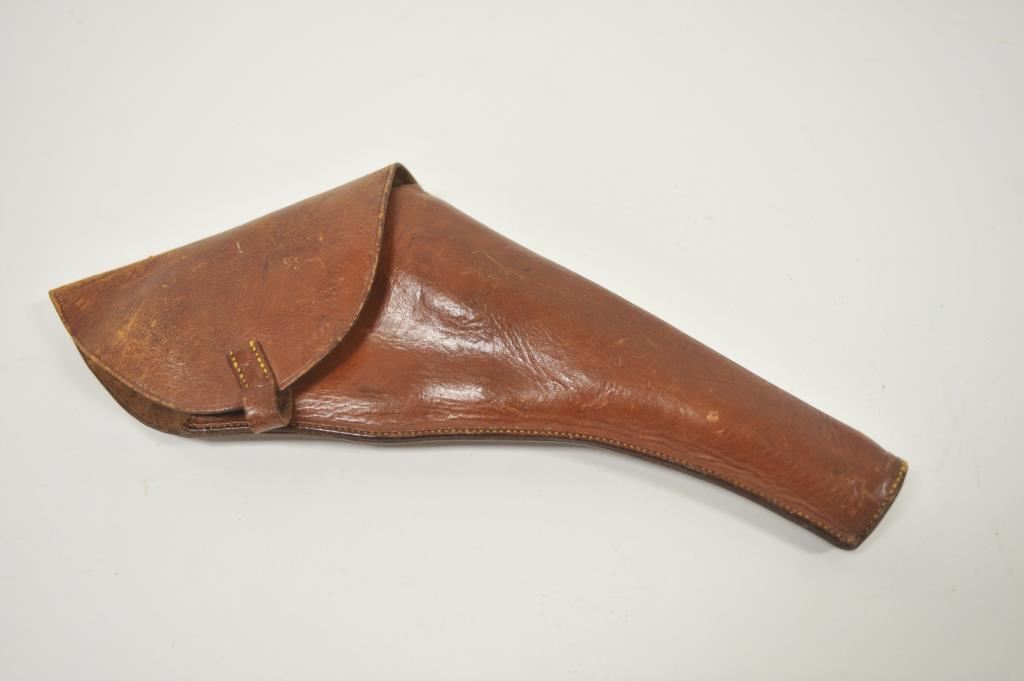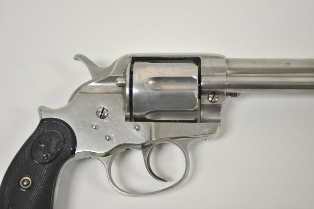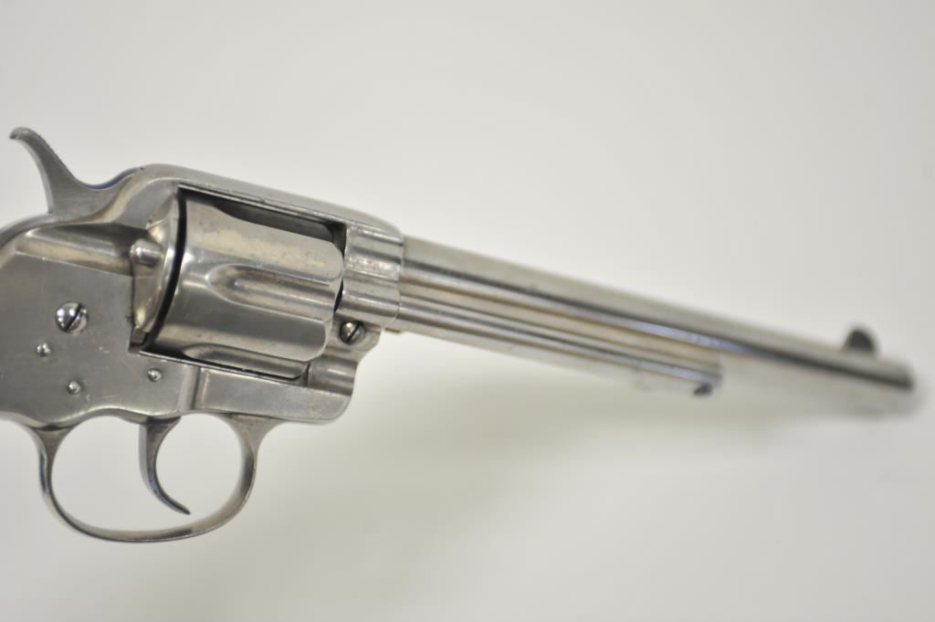 Canadian-marked Colt Model 1878 DA revolver, .45 caliber, 7.5” barrel, bright metal surfaces, checkered hard rubber grips, lanyard ring, S/N 14725 with additional stamping on left side of frame above front area of trigger guard “223 . MD” with leather flap holster; gun is in overall good to very good condition showing an old light cleaning to metal surfaces, good bore, action, markings and grips; holster is very good overall and with an interesting penciling on inside of flap “E.A.G./VIII C.M.R.” (Antique). Est.: $2,500-$5,000.