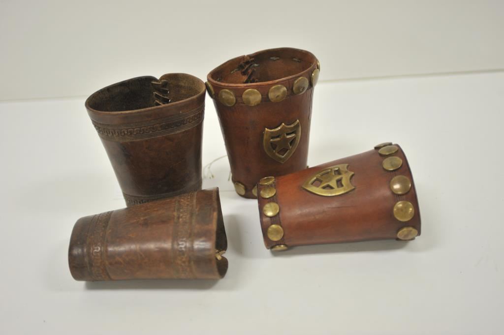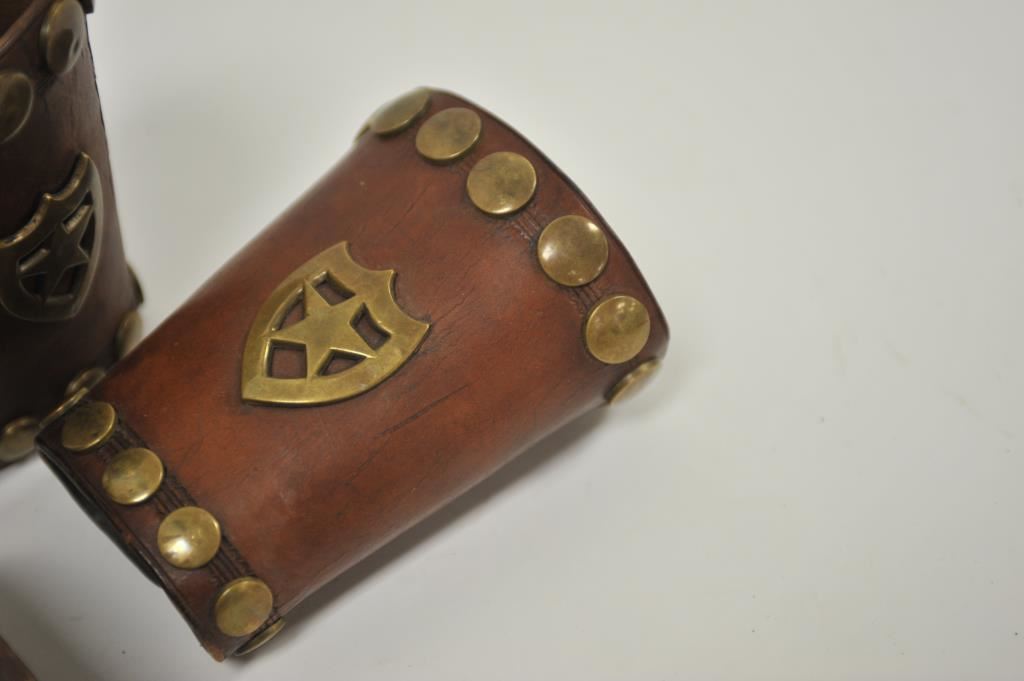 Two pair of leather wrist cuffs; one tooled and in good uncleaned condition; another edge tooled with large brass studs and brass shield five point stars in good condition overall. Est.: $125-$250.