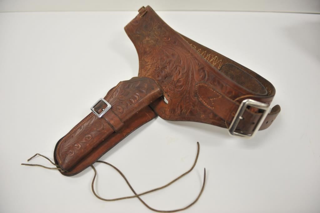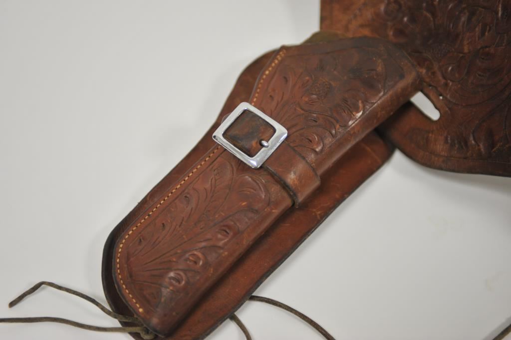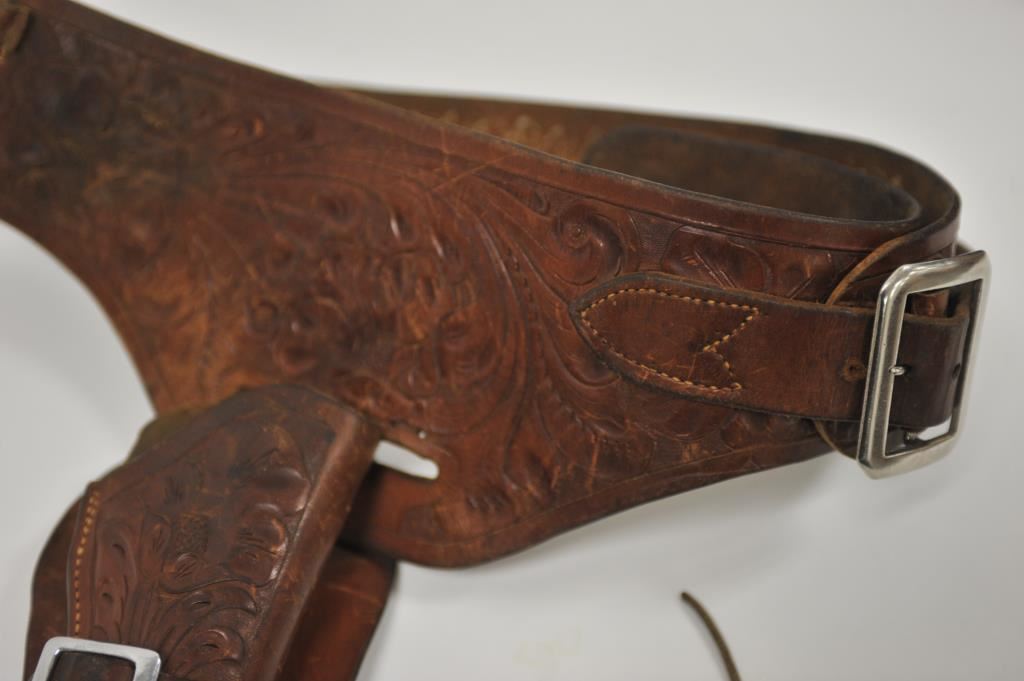 Tooled leather single loop holster and matching tooled leather cartridge belt by Bucheimer/Frederick, MD.; overall good condition. Est.: $150-$250.