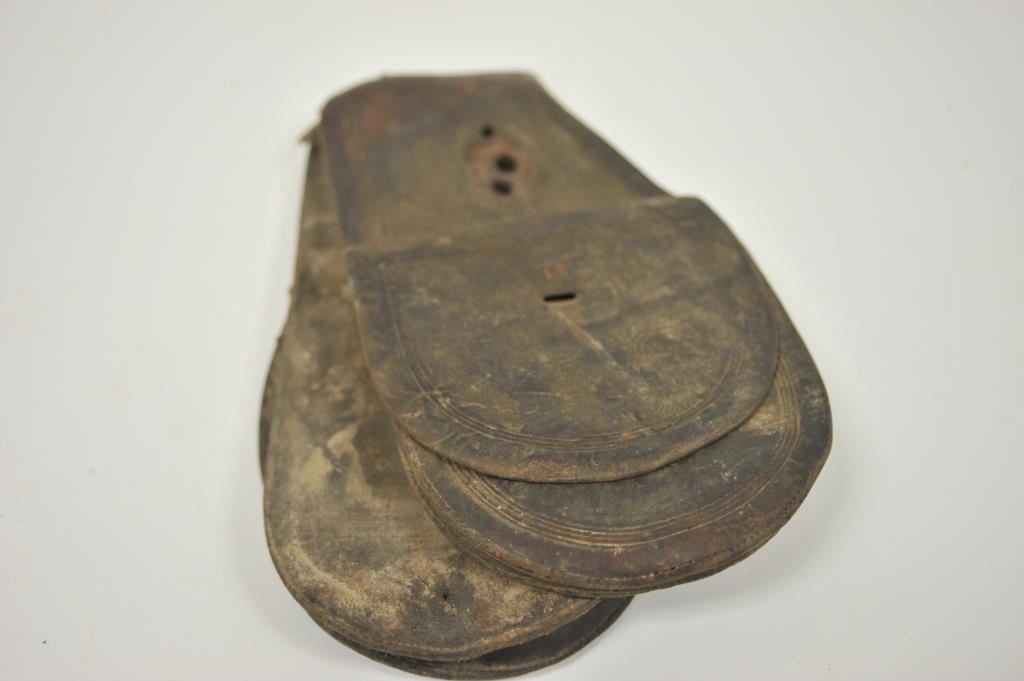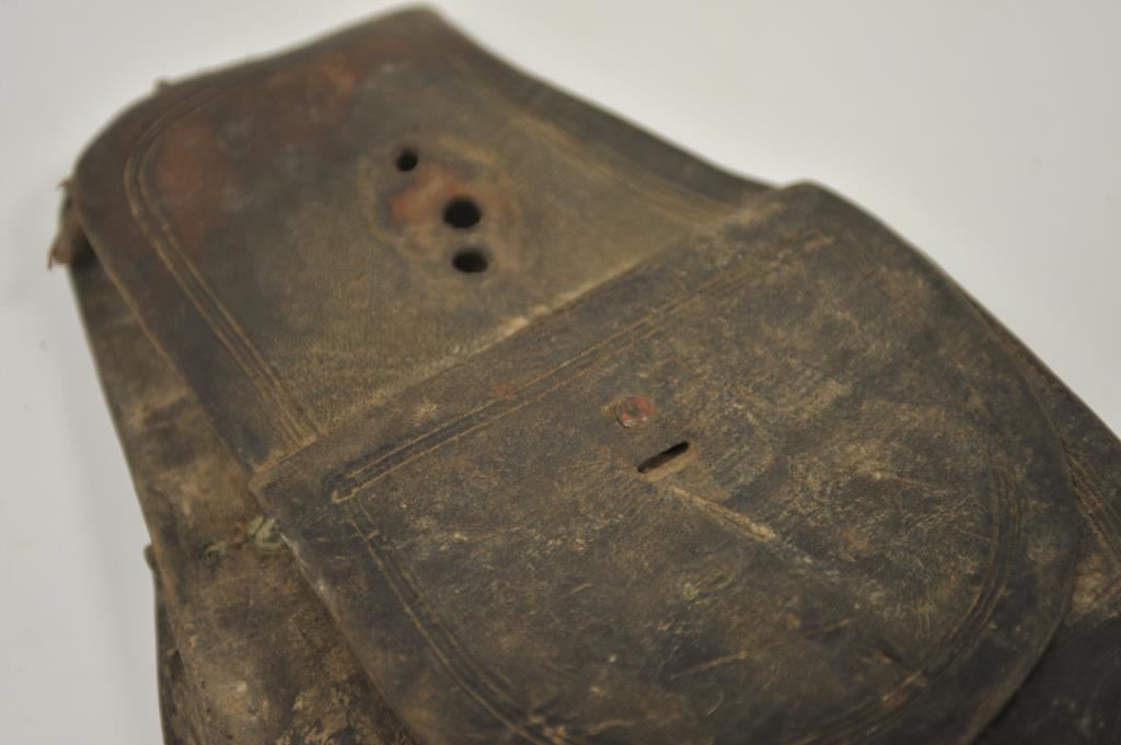 Desirable small pair of leather tooled flap saddle bags maker marked “F.A. Meanea/Cheyenne”; uncleaned; missing tie down straps; majority of stitching intact; would greatly benefit from a careful cleaning and feeding of the leather. Est.: $250-$500.