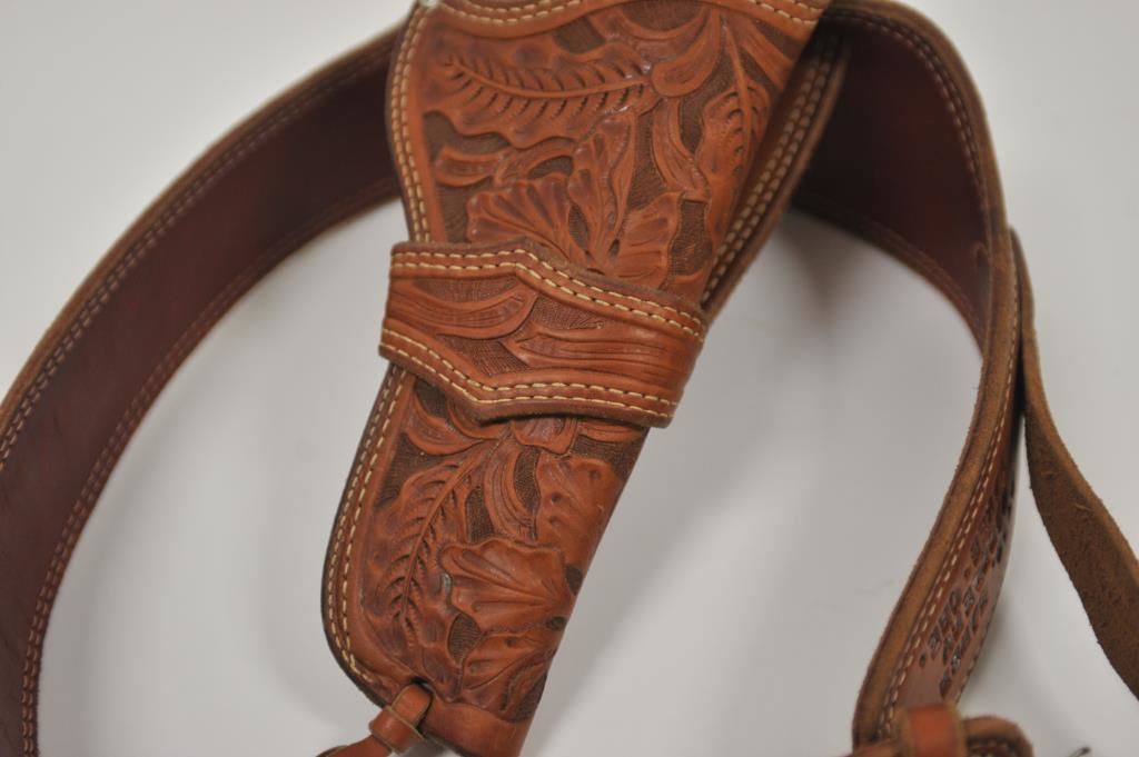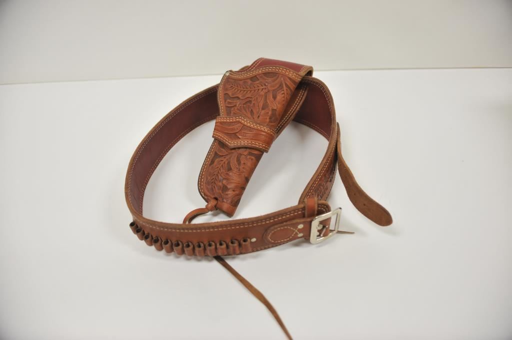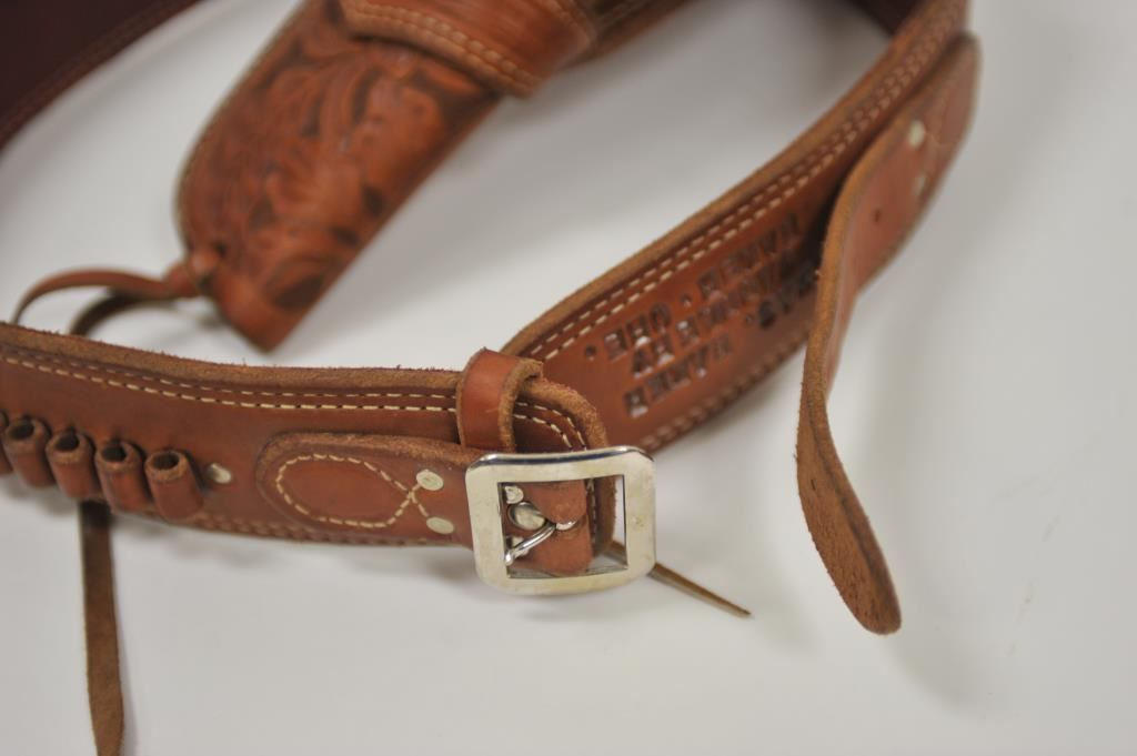 Heavy harness leather tooled single loop holster and matching cartridge belt marked Chas. Baker Saddlery/ Baker, Ore.”; very good overall. Est.: $150-$300.