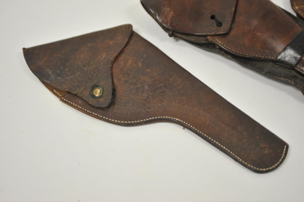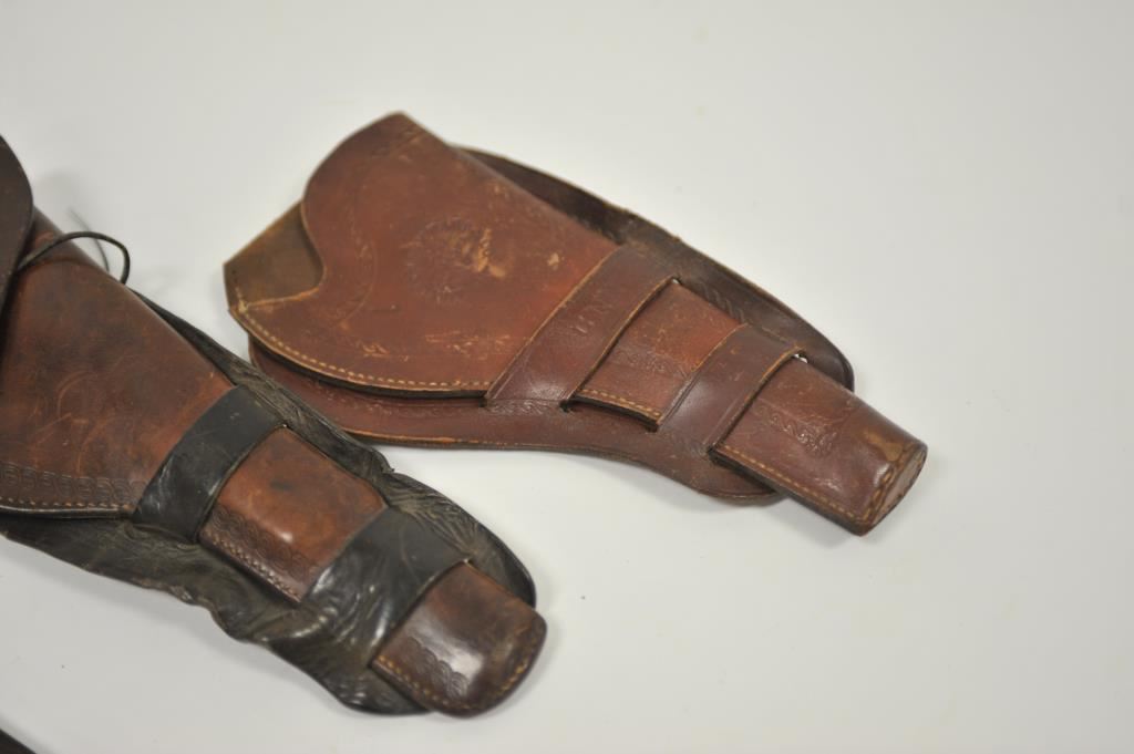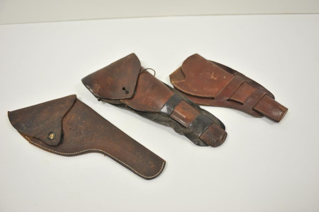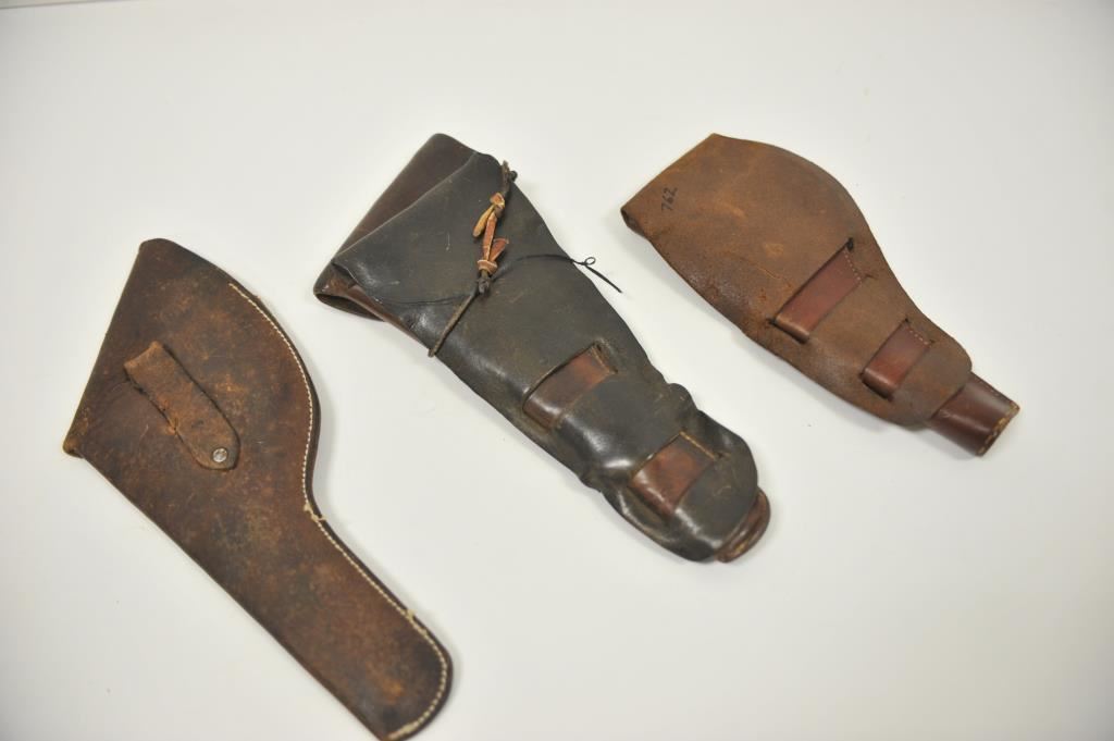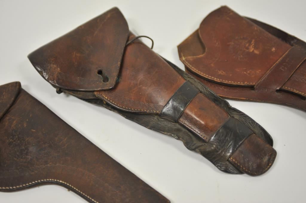 Lot of 3 leather holsters including a tooled double loop maker marked “Montgomery Ward & Co./Chicago, Ill.” in very good condition; an unmarked flap holster showing re-stitching and a double loop flap holster, unmarked and “married” holster and different skirt. Est.: $175-$275.
